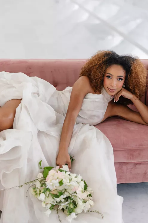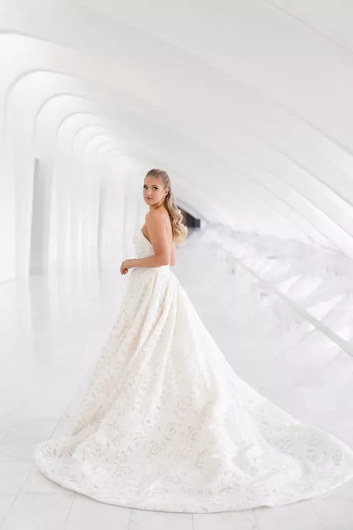 Framed by the sweeping architecture of the Milwaukee Art Museum, this editorial shoot captured the energy of a spring day. The creative team envisioned a celebration that married city-edge sophistication with the softness of the season — blending sculptural lines, luminous light and a palette of pinks, moss and gold.