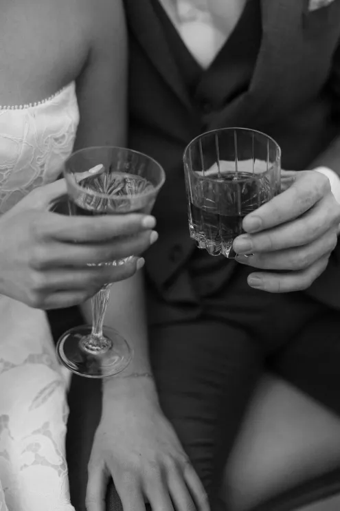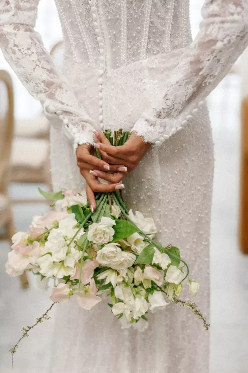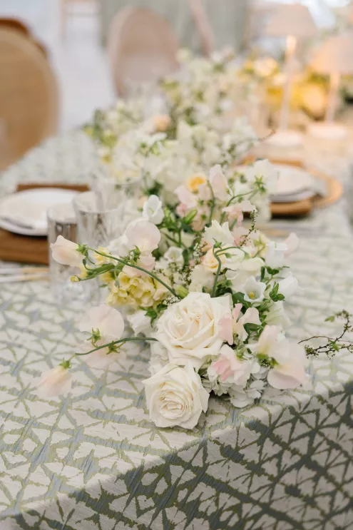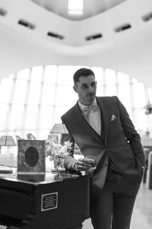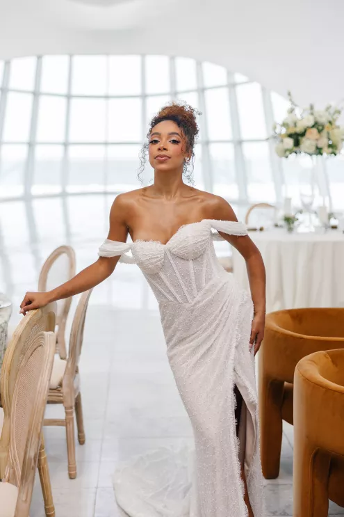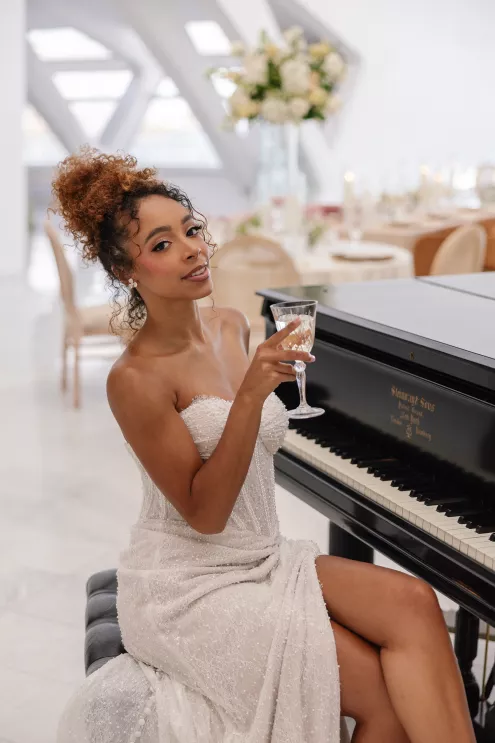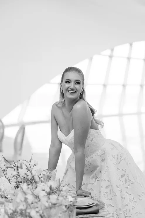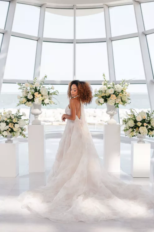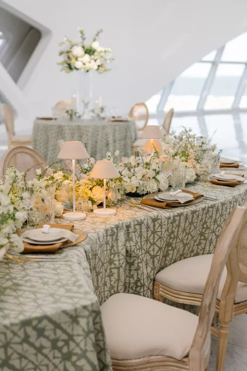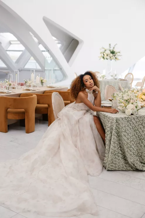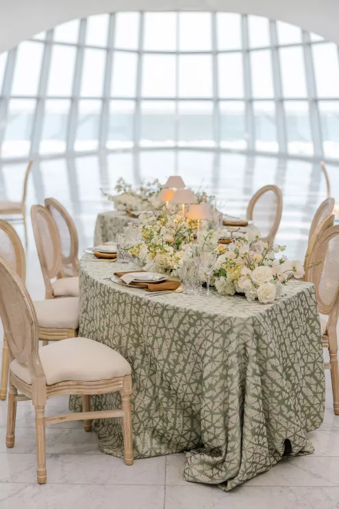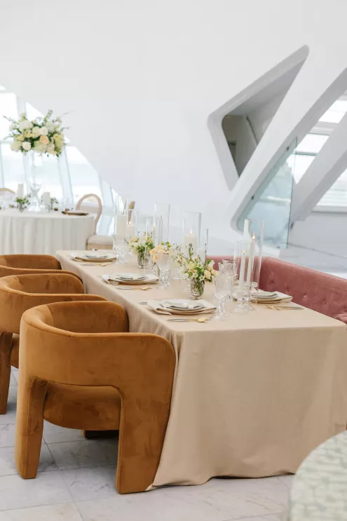 The story unfolded with a crescent-shaped ceremony layout designed for intimacy, drawing would-be guests into the heart of the experience. Romantic floral pillars and gleaming glass vessels mirrored the surrounding water, adding movement and reflection to the minimalist setting. Each tablescape became its own vignette of texture and tone. Velvet linens, layered patterns and warm metallic accents shifted subtly from one table to the next, creating color and contrast. Our bride models showcased coordinatingly feminine looks, floating through the space and commanding attention. The groom, styled in a lighter tone to match the seasonality, looked dapper in his suit and bow tie.