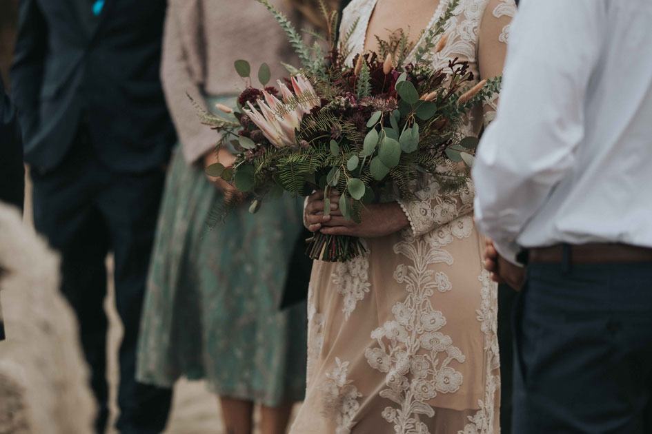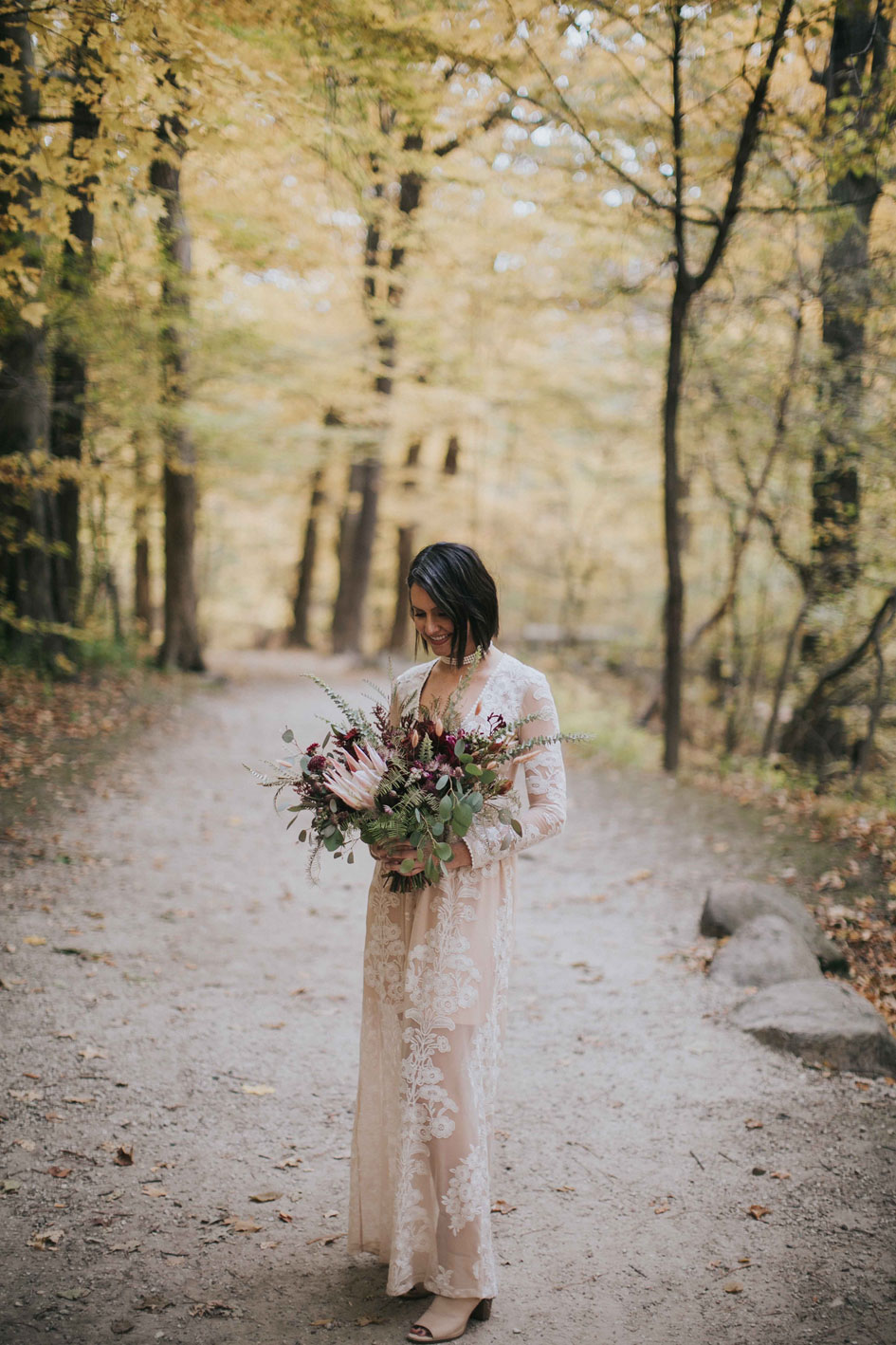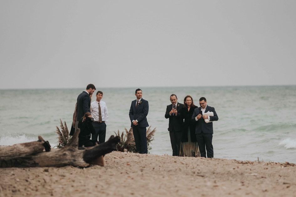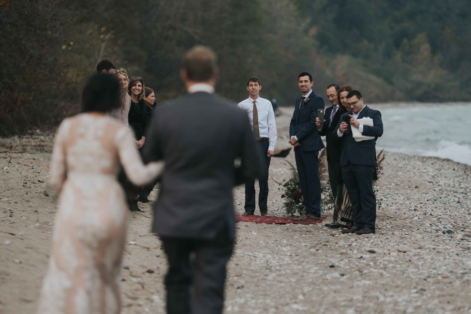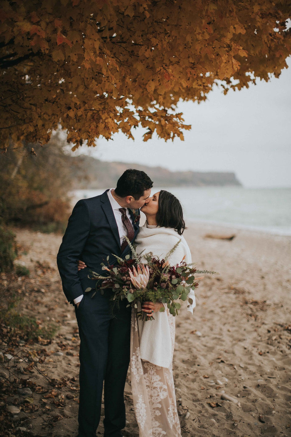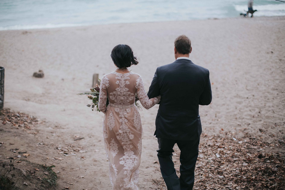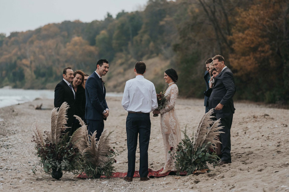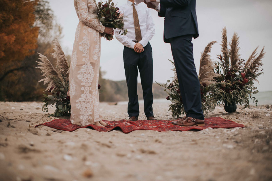 The crashing waves of Lake Michigan meant that the sound of Shannon & Roberto's vows to one another could not be heard beyond the circle of ten people they had invited to share the day with them. The bride wore an off-white, lacy dress and carried a maroon bouquet centered around a pale protea to her simple elopement on the beach of Grant Park. The leaves had just begun to turn colors as bride and groom said their vows, standing on a vintage rug in the sand and surrounded by simple floral columns. Following the emotional ceremony, the small wedding party went axe-throwing before heading to dinner at Braise.