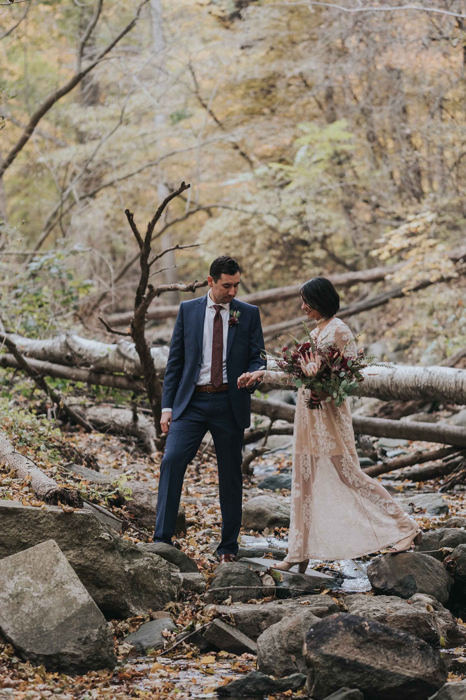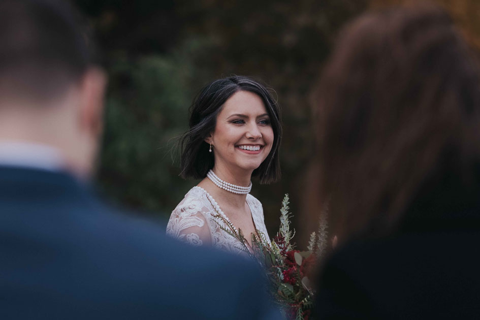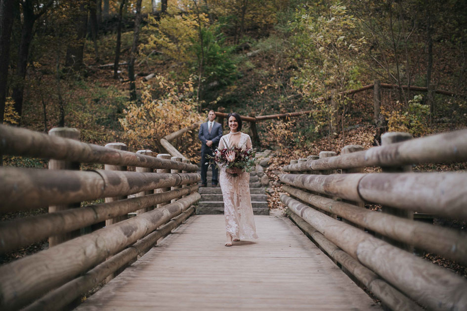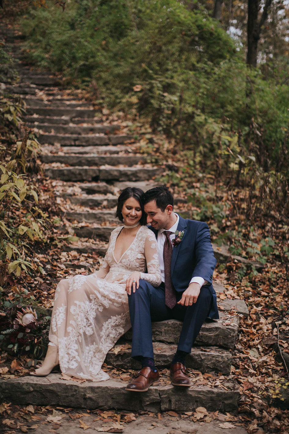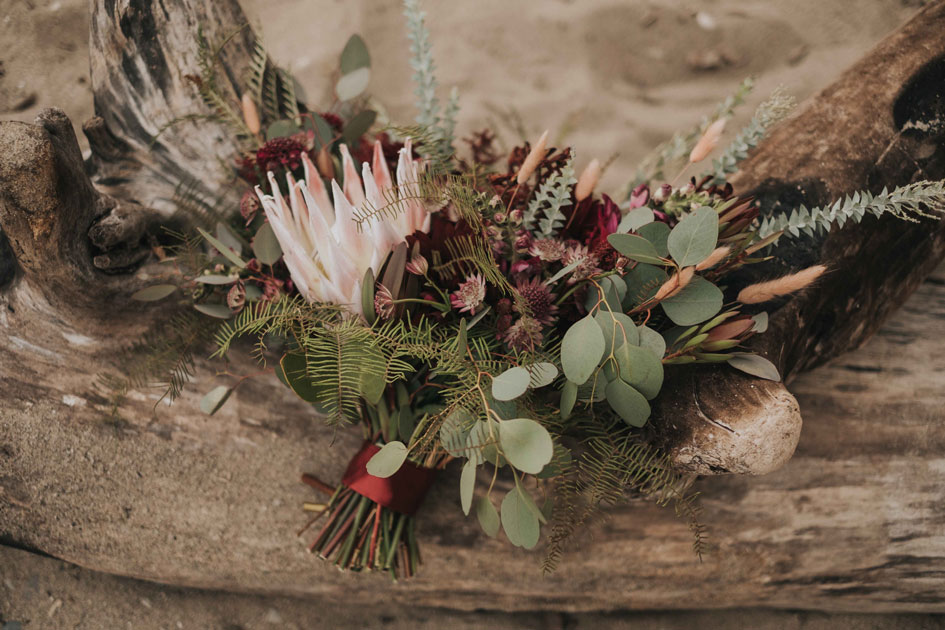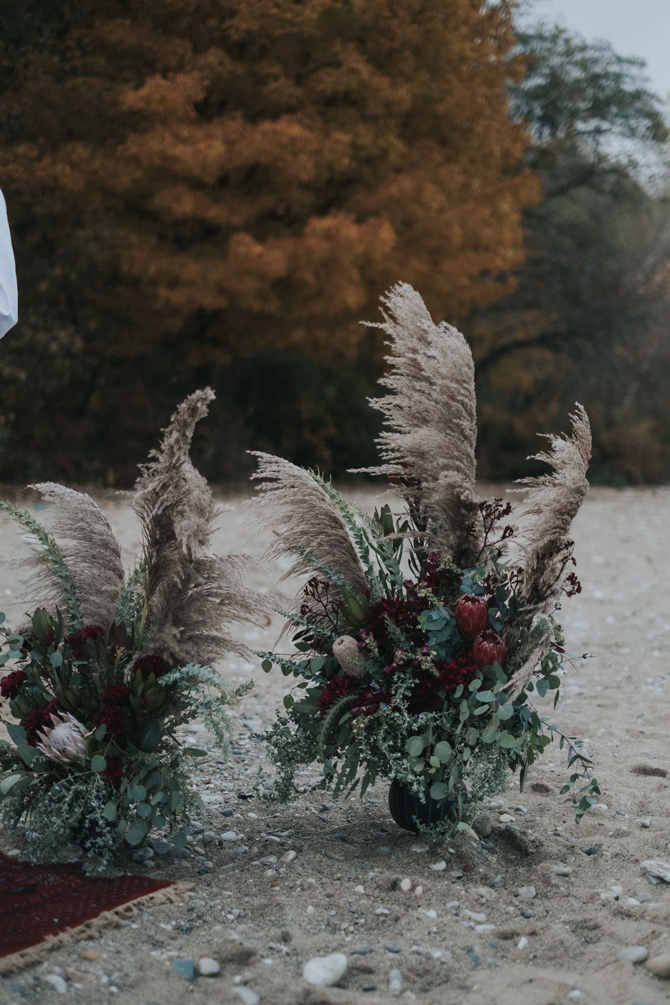 The crashing waves of Lake Michigan meant that the sound of Shannon & Roberto's vows to one another could not be heard beyond the circle of ten people they had invited to share the day with them. The bride wore an off-white, lacy dress and carried a maroon bouquet centered around a pale protea to her simple elopement on the beach of Grant Park. The leaves had just begun to turn colors as bride and groom said their vows, standing on a vintage rug in the sand and surrounded by simple floral columns. Following the emotional ceremony, the small wedding party went axe-throwing before heading to dinner at Braise.