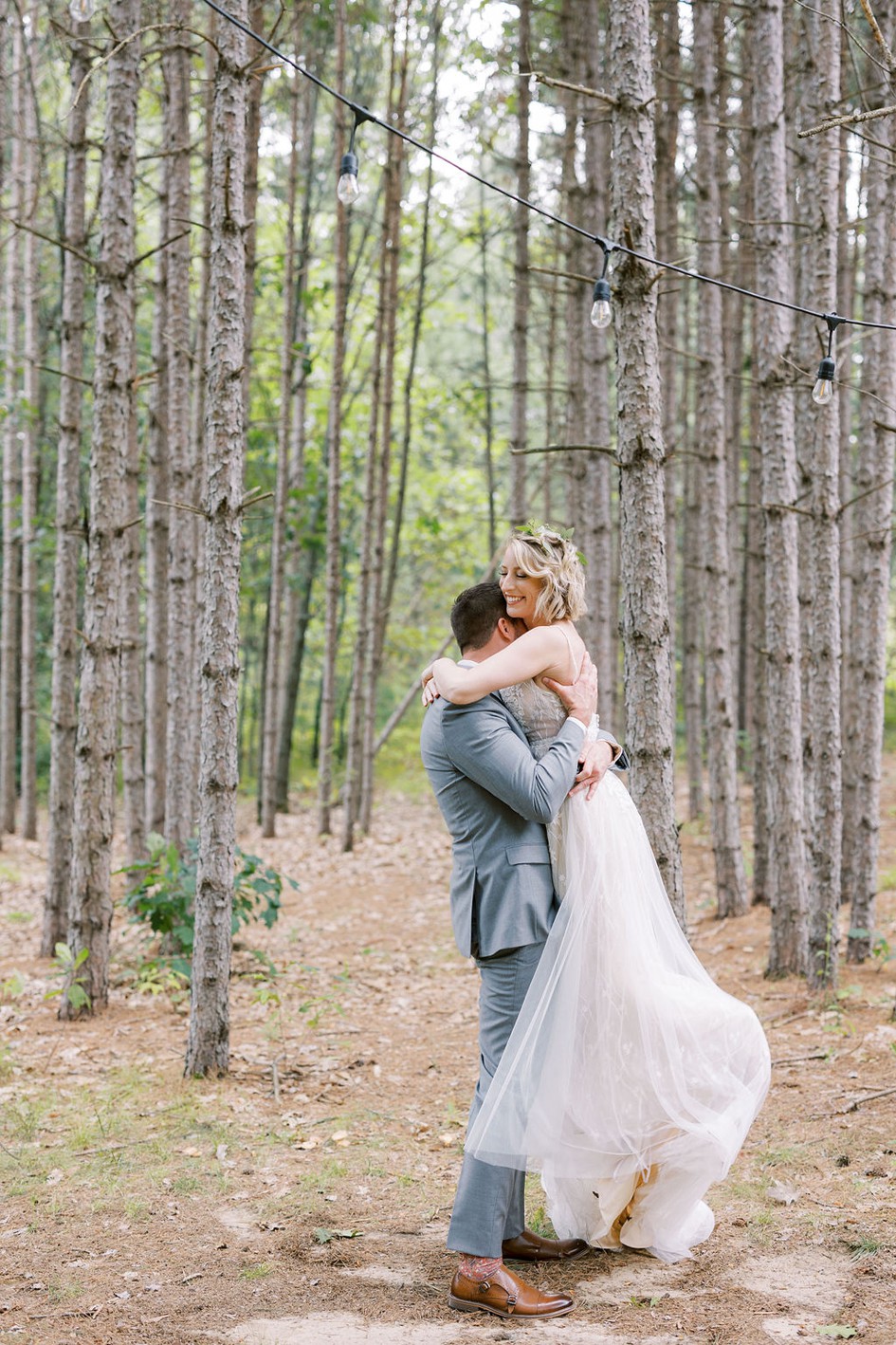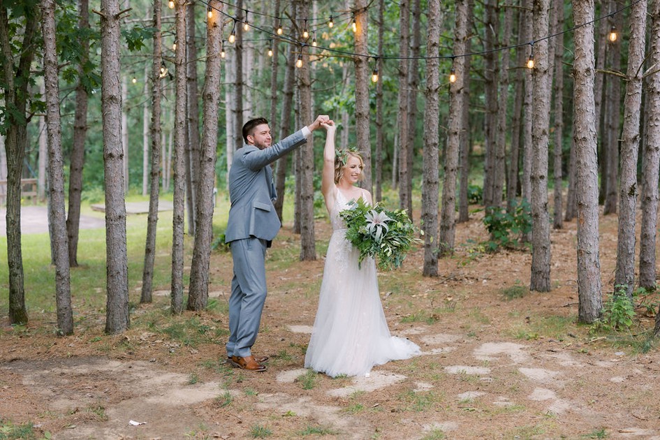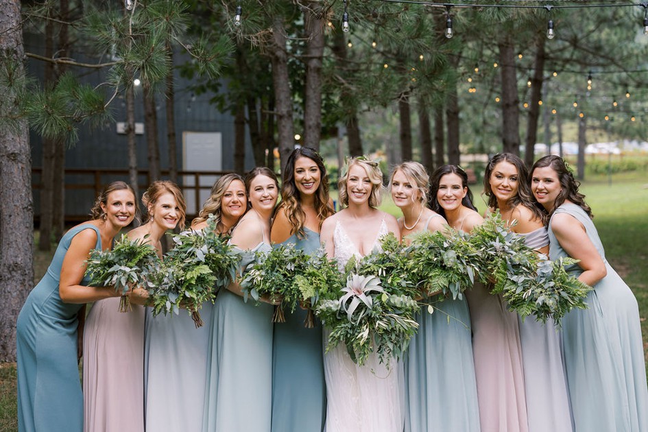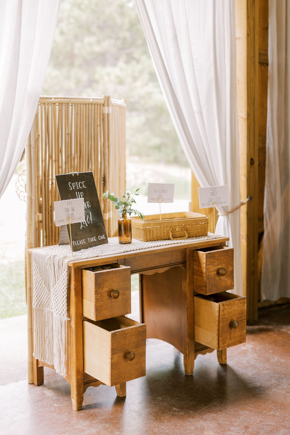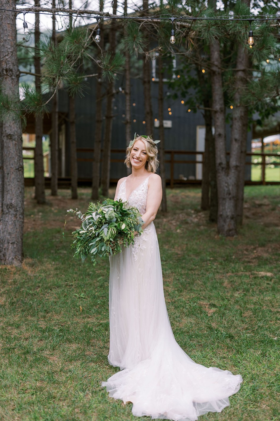 Tessa and Matt went with a bohemian natural theme for their special day. Burlap & Bells was chosen for its tall pines and even taller bluffs, lending the wedding celebration a peaceful feeling. The pair, along with help from family and friends, put a lot of DIY work into the day, from nearly a dozen professional looking handmade signs to hundreds of small glass bottles filled with homemade spice blends for fabulous favors. Tessa embodied a boho princess with leaves placed in her hair by Elle HMUA, and it’s easy to see in the photos by Molly Jo Collection how lucky Matt felt.