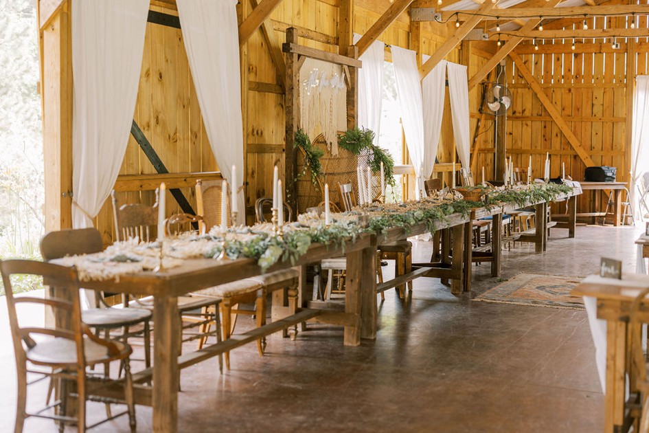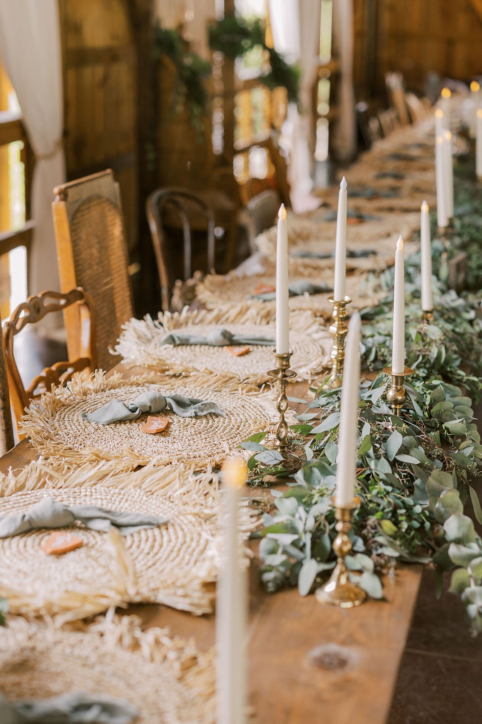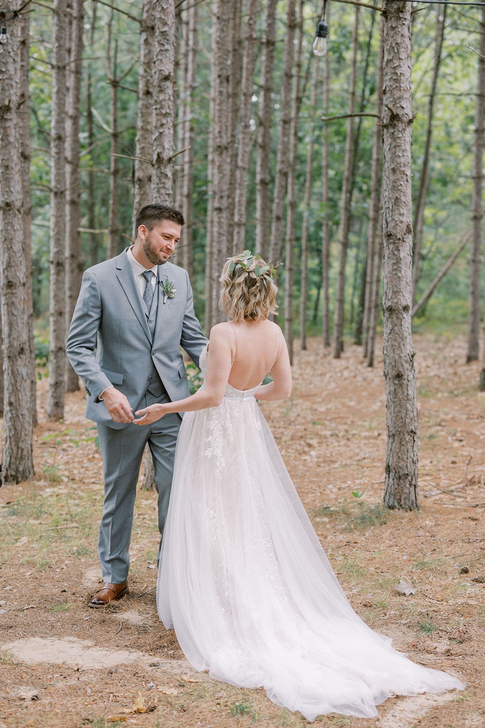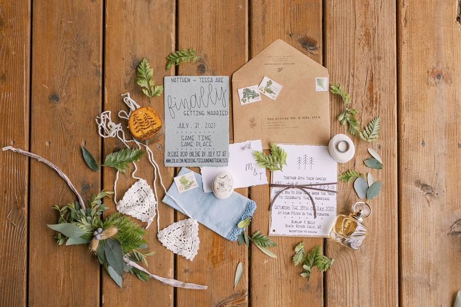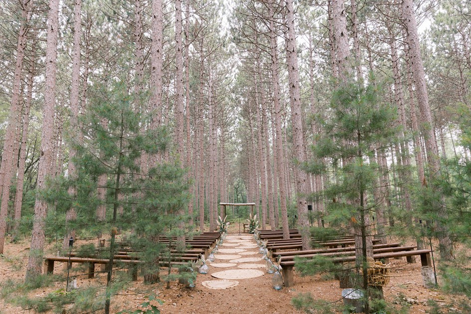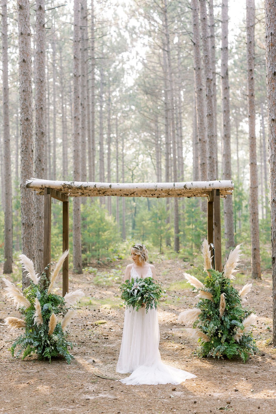 Tessa and Matt went with a bohemian natural theme for their special day. Burlap & Bells was chosen for its tall pines and even taller bluffs, lending the wedding celebration a peaceful feeling. The pair, along with help from family and friends, put a lot of DIY work into the day, from nearly a dozen professional looking handmade signs to hundreds of small glass bottles filled with homemade spice blends for fabulous favors. Tessa embodied a boho princess with leaves placed in her hair by Elle HMUA, and it’s easy to see in the photos by Molly Jo Collection how lucky Matt felt.