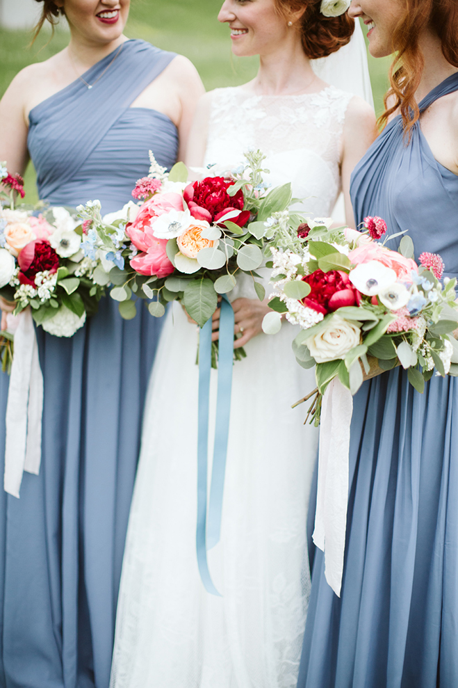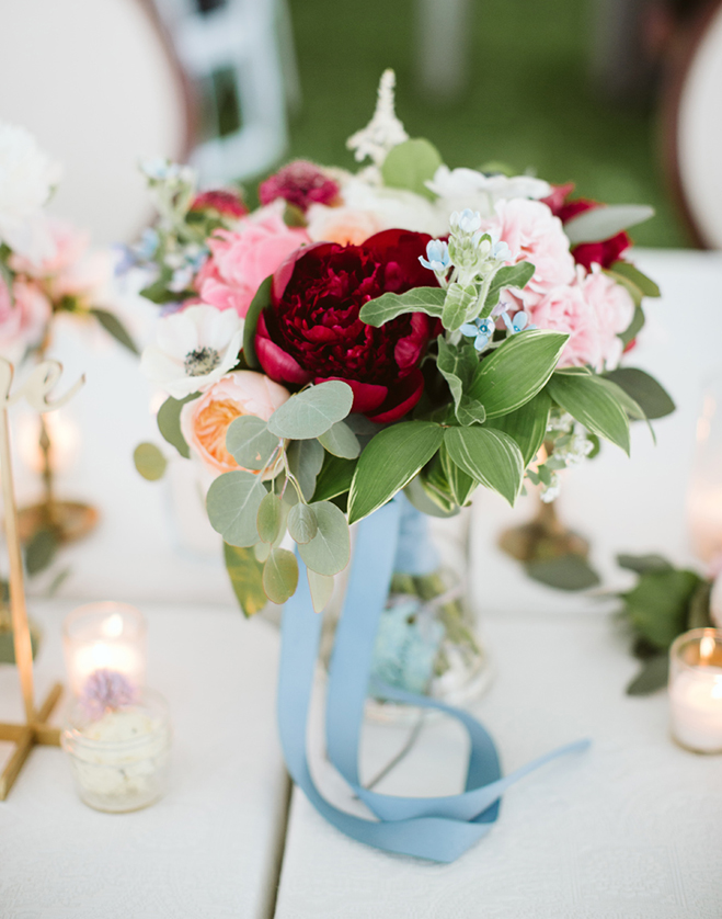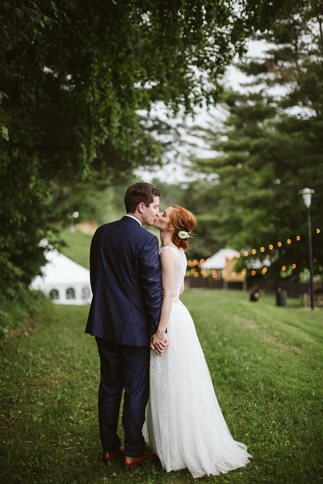 When Clare Mannion and Brett Garrison dreamed about their wedding day, they had a particular theme in mind: an English garden party with vintage touches. Rather than opt for the barn option popular for weddings like this, the couple, who met in law school in St. Louis and now live in Washington, D.C., worked with their wedding planner to bring their romantic theme to life in a tented space in the great outdoors. When the big day arrived, the couple was dismayed that Mother Nature threatened to ruin their plans with rain. Happily, the showers held off, and Clare and Brett enjoyed a beautiful day surrounded by family and friends. Sweet surprises punctuated the whimsical evening, which included late-night s’mores and a paper moon photo booth. “The setting in the tent with the candles and fairy lights was simply magical,” says Clare.