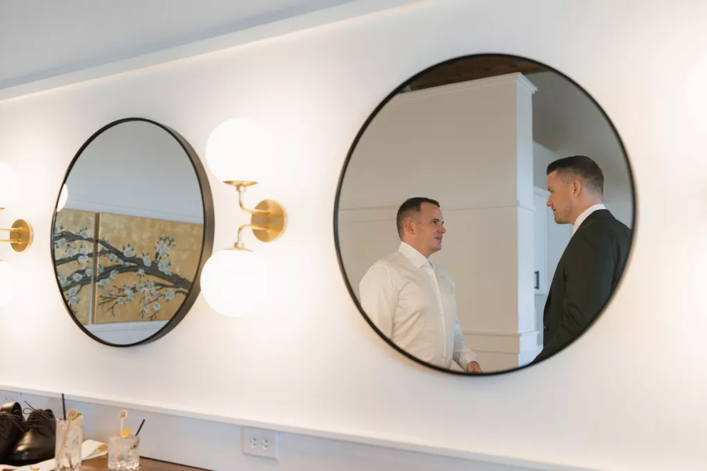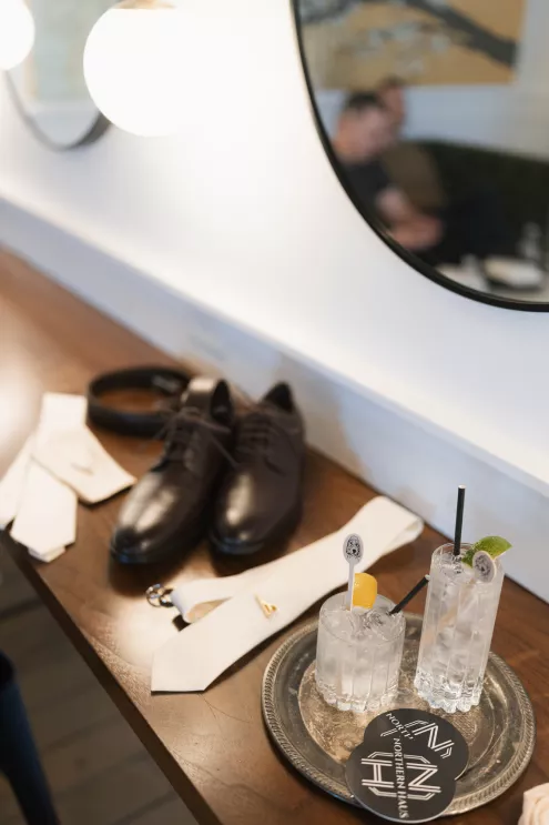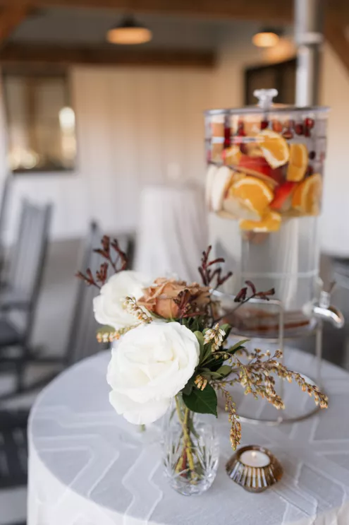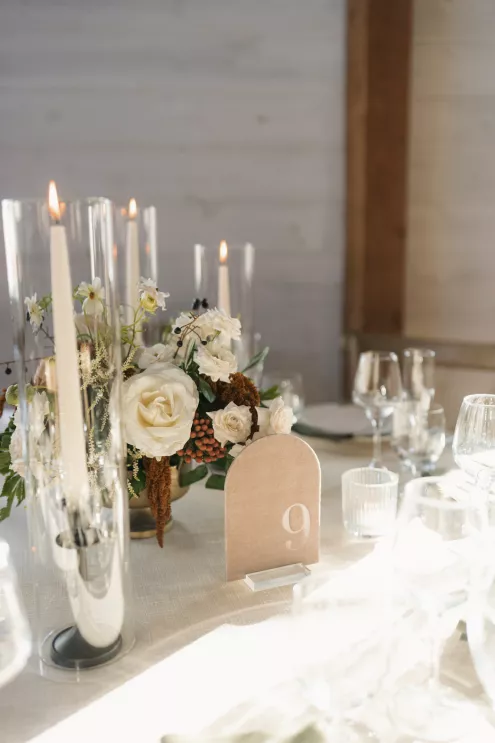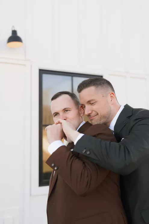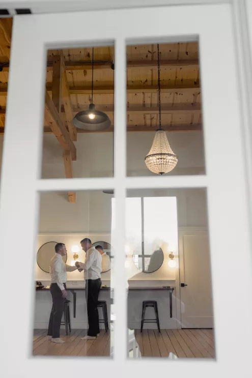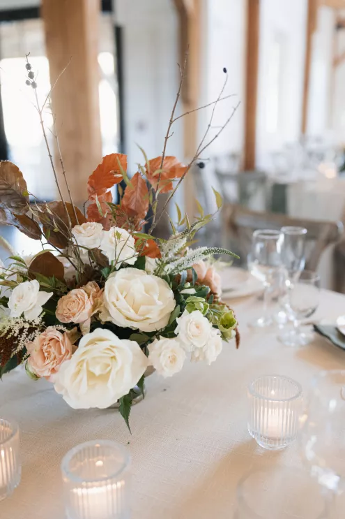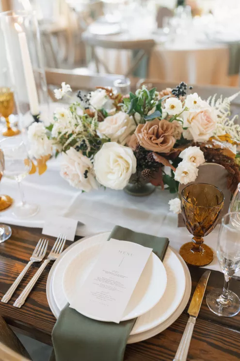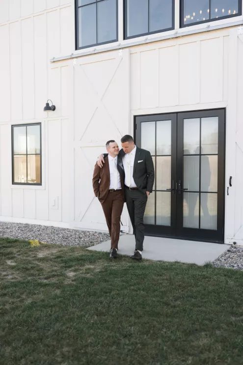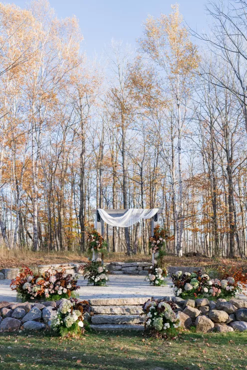 Autumn leaves, colorful trees and cherished friends and family made Evan Smith and Andrew Grazier’s wedding a day to remember. With a shared affinity for Door County adventures, the outdoors and autumnal colors, Northern Haus in Sister Bay was the perfect locale for the pair to tie the knot. The day began with beautiful, crisp weather and brilliant sunlight that filtered through the orange and red tree leaves at the al fresco ceremony. The couple exchanged vows beneath the trees’ canopy, surrounded by a circle of cobblestones and enchanting pink, white and burnt orange florals. A live pianist added to the ethereal atmosphere surrounding the wooded trail. The celebration moved indoors for the reception in Northern Haus’ barn-style venue, where a cocktail hour and meal unfolded under modern lighting and vast wooden beams. The environment was perfect for warm conversations and bubbling laughter. Soon, everyone moved onto the dance floor, where the live band made for a long night of cheery dancing and unforgettable moments.