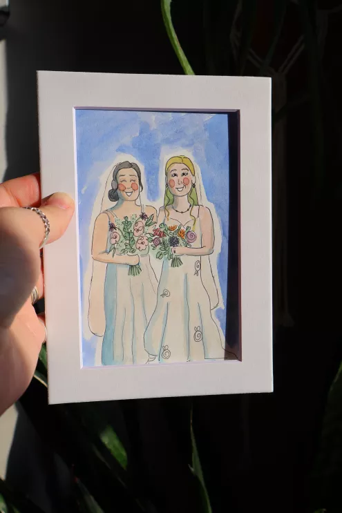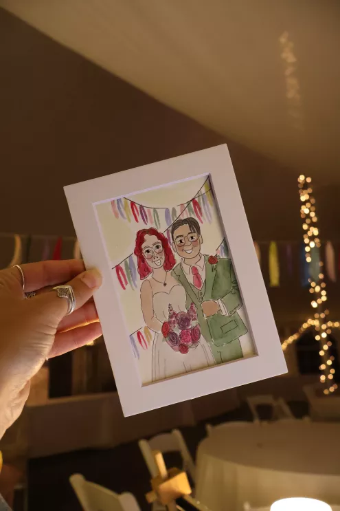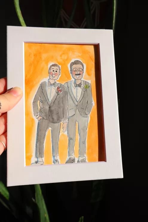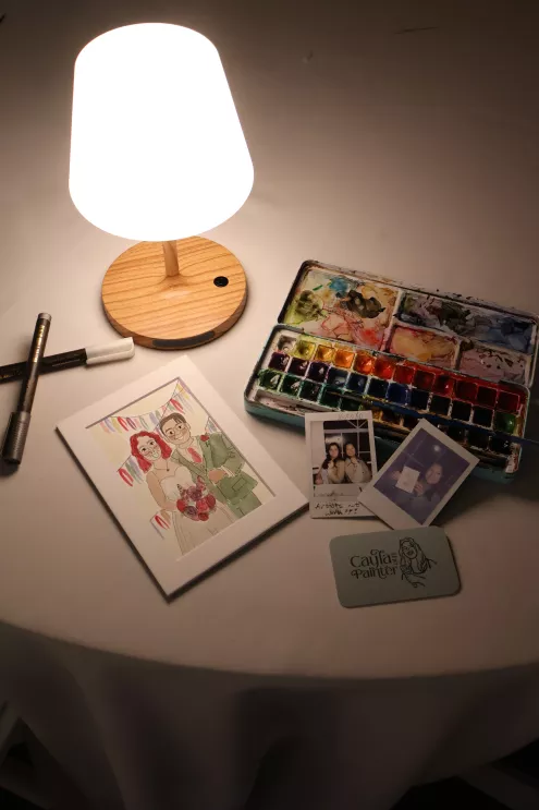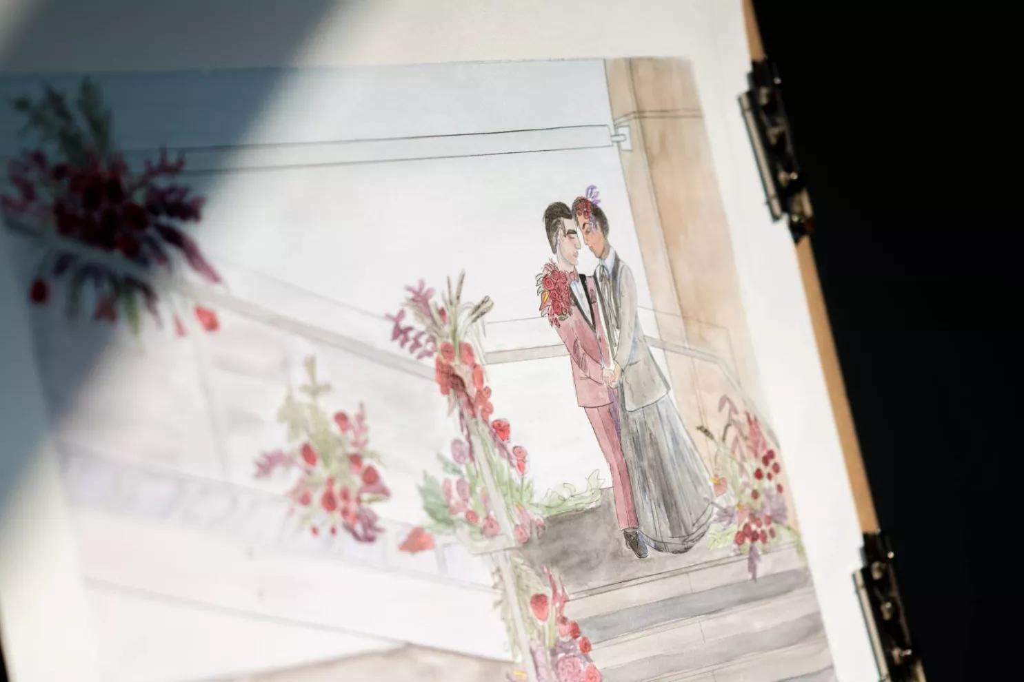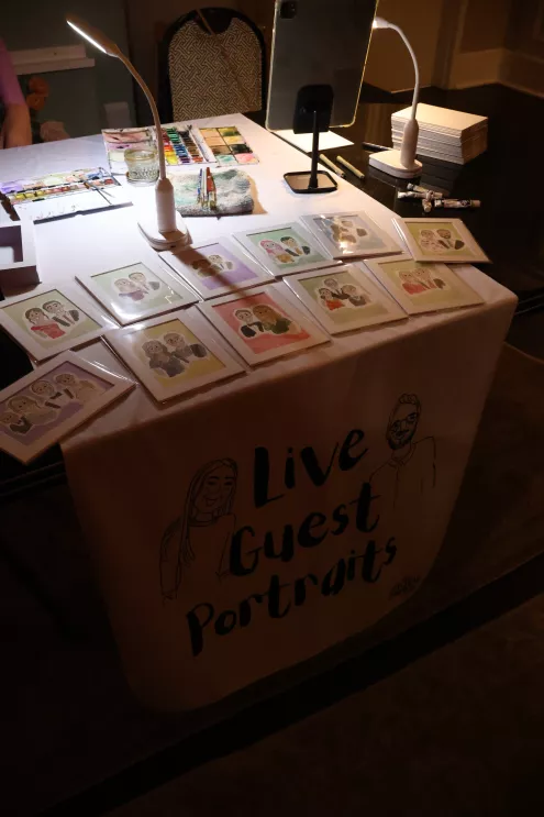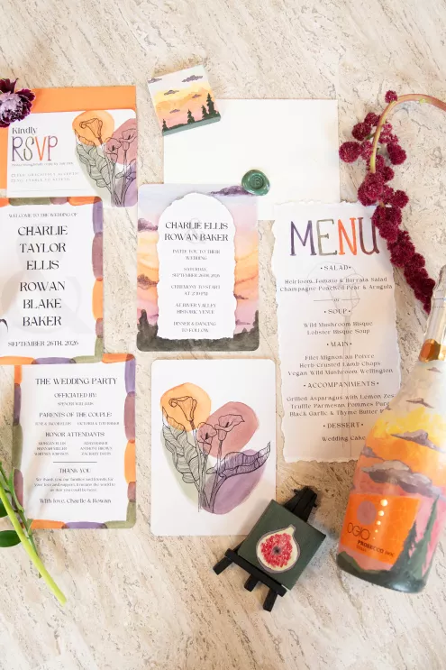 Her services range from elegant live couple portraits created during your reception to mini guest portraits that double as unforgettable favors. Cayla also offers custom stationery, hand-painted champagne bottles, signage, and other bespoke details that tie your wedding aesthetic together with painterly charm.