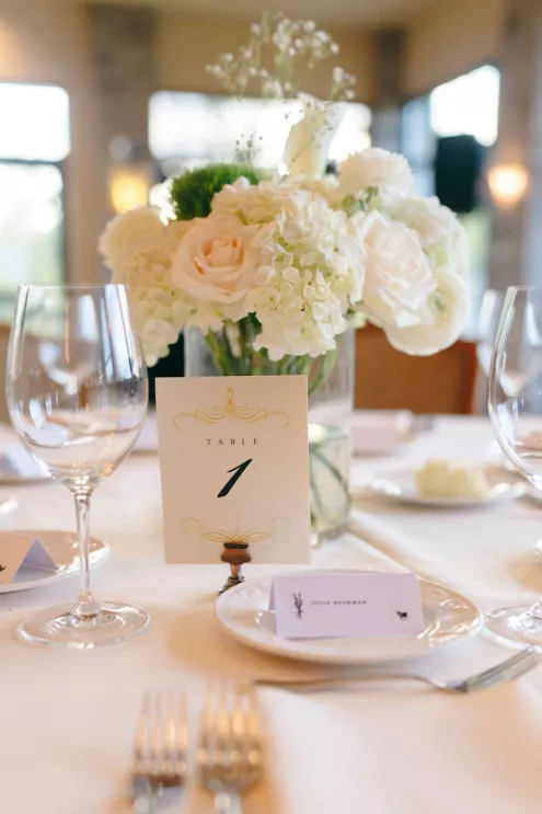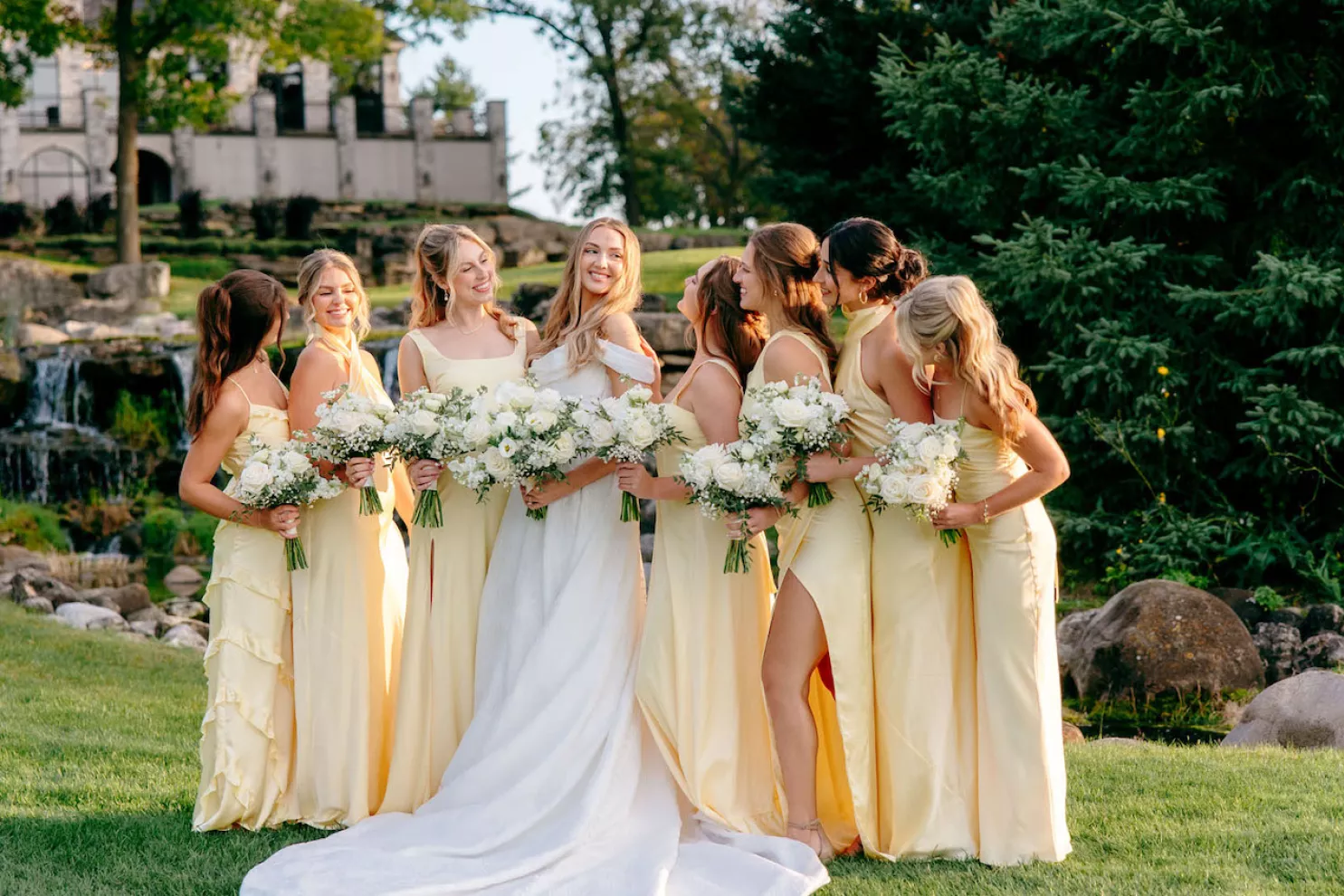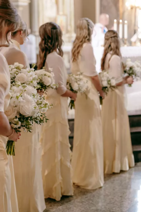 Florals were kept all white with greenery, clean and classic, against the butter yellow bridesmaid dresses. The wedding cake nodded to old-fashioned elegance and was crowned with a pair of swans, a fitting symbol for two people who have only ever chosen each other.