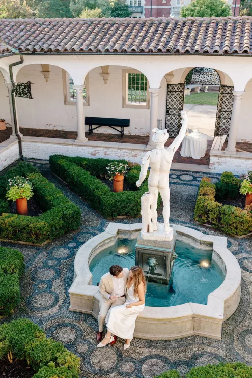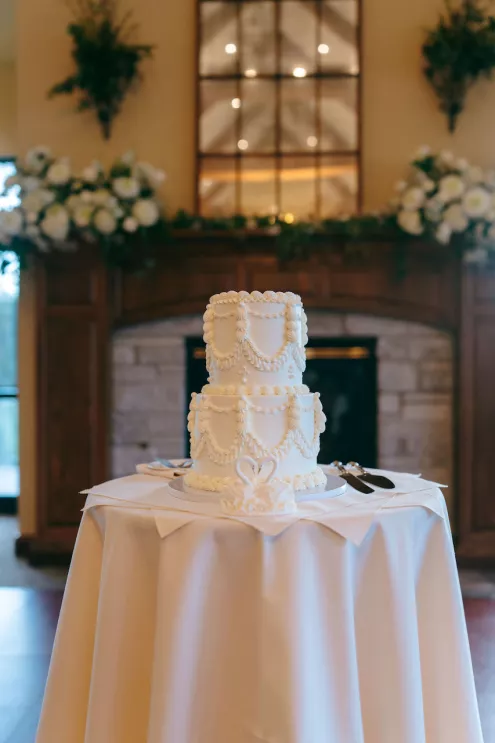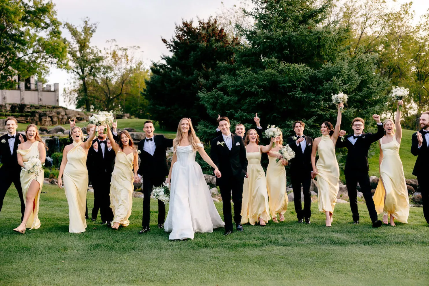 The celebration was a deliberate blend of two visions. Adrianne wanted Italian villa drama with statues, pillars and elegance. Garett wanted Wisconsin at its best: indoor fireplaces, brandy old fashioneds and a wraparound bar. Rather than compromise, they did both.