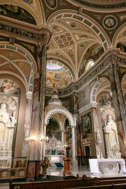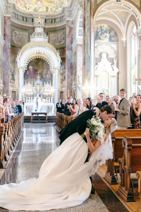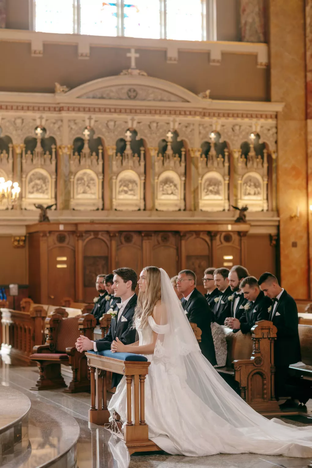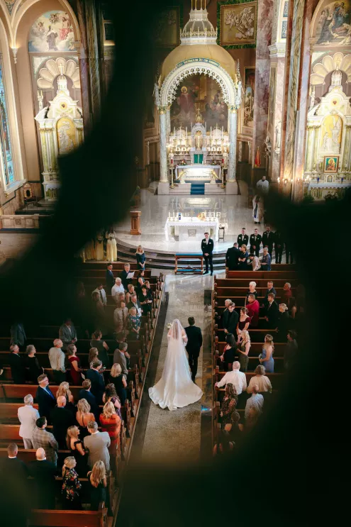 The weekend opened with a rehearsal dinner at Villa Terrace in Milwaukee, complete with a harpist playing on the patio in perfect weather. The following morning, the couple married at the Basilica of Saint Josaphat with the full basilica orchestra, a nod to their shared Catholic faith and its beauty and reverence. The reception followed at The Legend at Brandybrook, where Wisconsin culture took center stage with cocktails, beer and cheese in abundance.