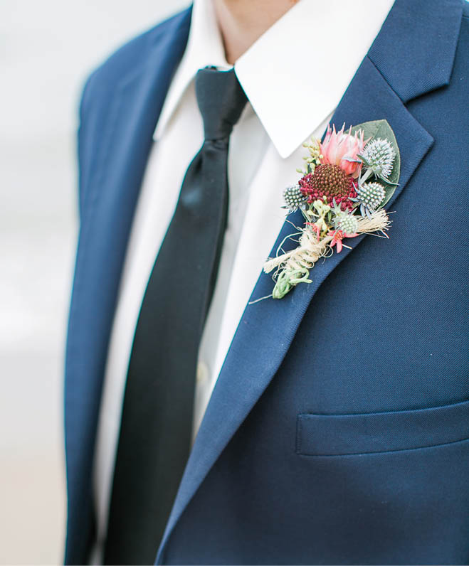 For a look he’ll love, keep it traditional. A navy suit—clean, classic, yet contemporary—complements waterside hues, while a textured boutonniere adds an elegant element of surprise.