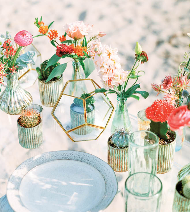 Instead of one elaborate centerpiece, scatter miniature vessels—here in shades of teal and gold—for a lively look. Re-create this scene with tiny cacti and freshly cut blooms like pincushion protea, butterfly weed, veronica and more.