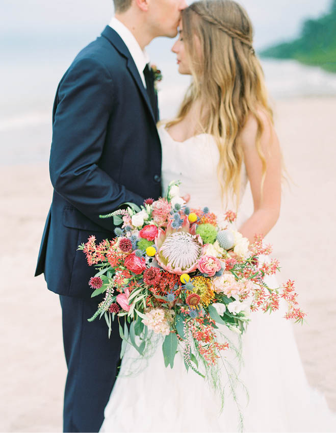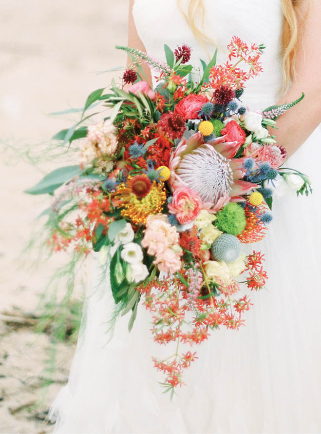 Don’t be shy with color and texture. This loose, sumptuous bouquet embodies the easy vibe of a relaxed day—for bride, groom and guests alike.