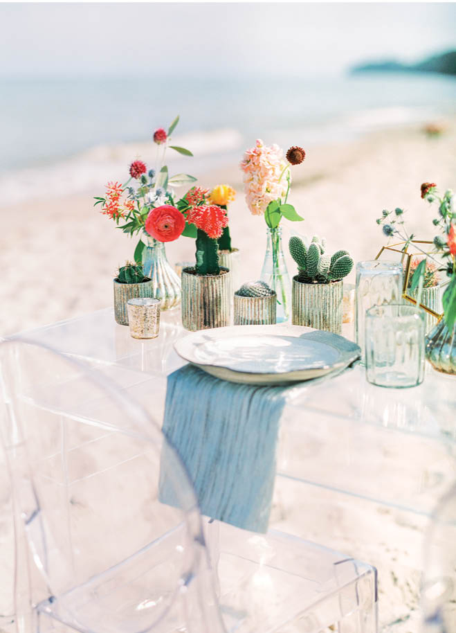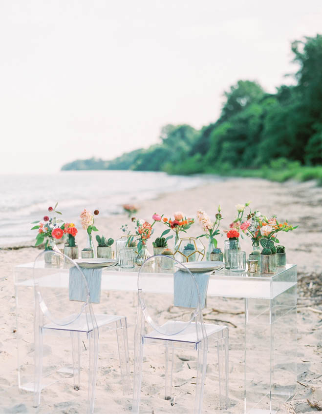 Table for two, please. Sash&bow owner/planner Alliey Kline-Weichelt went for a clean look to highlight the Lake Michigan setting. The sleek acrylic table and chairs do the trick, allowing the vibrant florals to pop and the shore to shine.