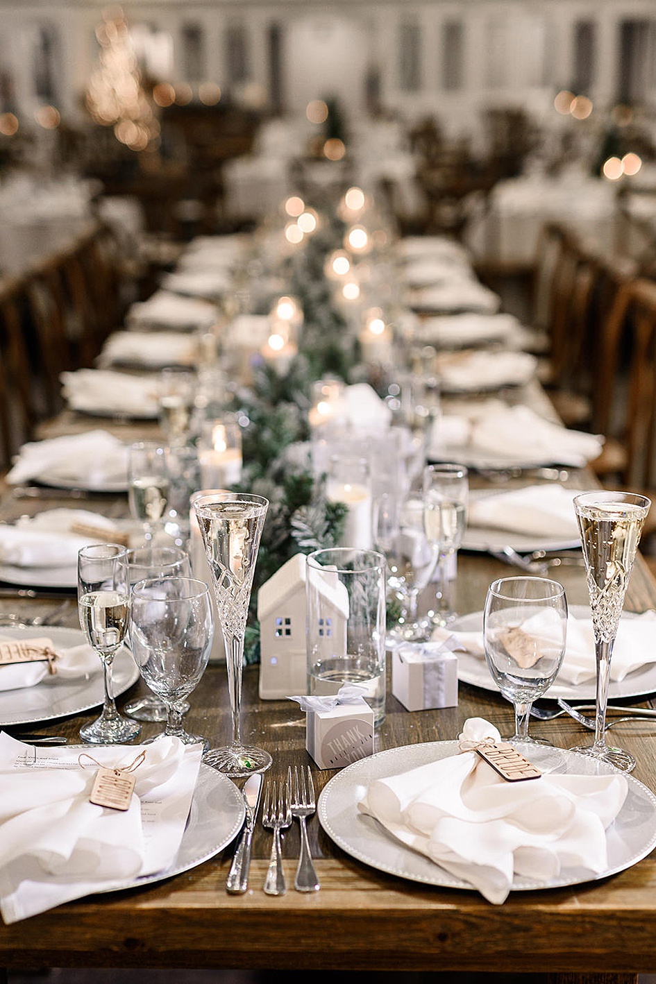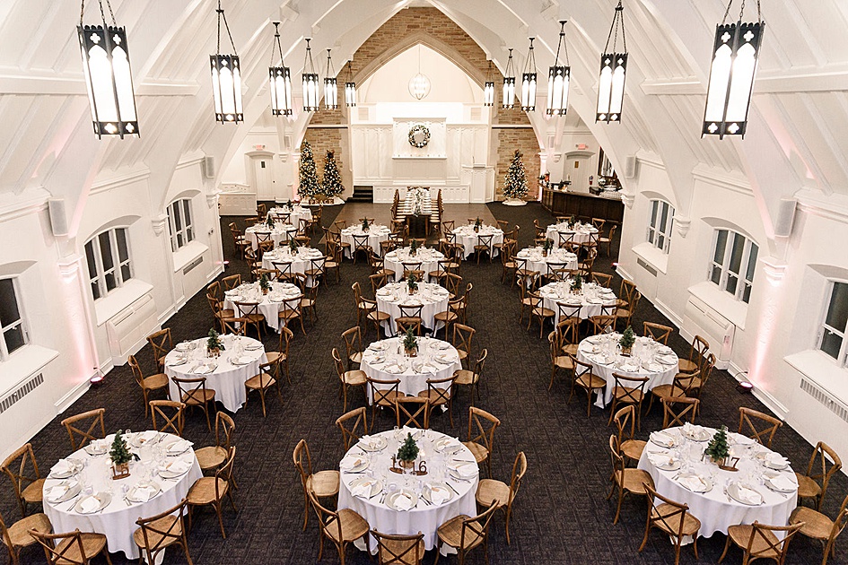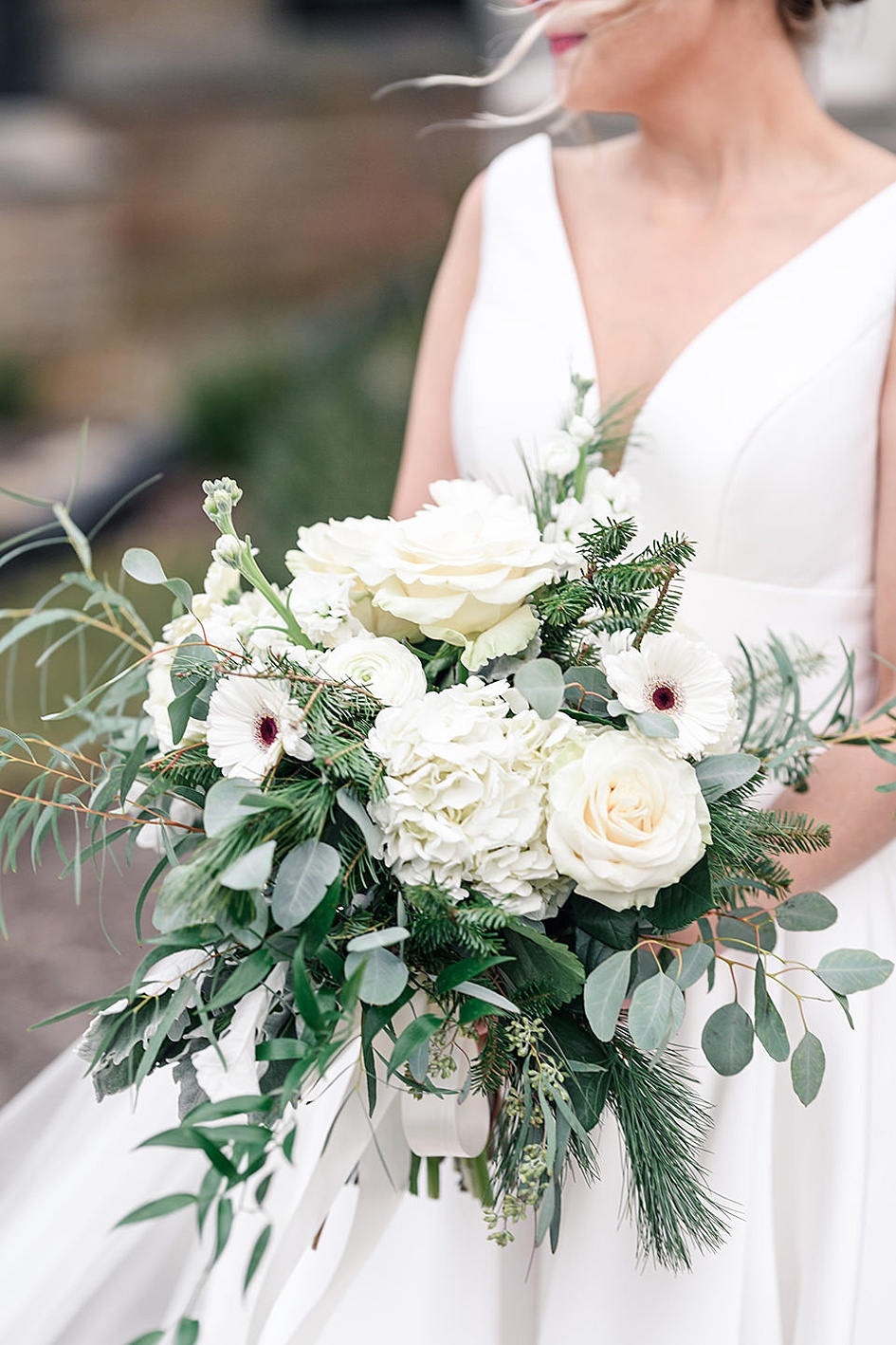 Jennifer McIlquham’s dog, Helix, knew her “mom” and Matthew Suarez were destined to be together. Jennifer and Matthew were each out walking their dogs when Helix broke free and ran to Matthew’s dog, Reggie. “They started playing, and the rest is history!” Jennifer says. Fast-forward two years at the same park: Matthew got down on one knee to propose. The couple’s January wedding day was warmed by family taking part in their Catholic ceremony. Godparents brought gifts down the aisle and walked in the procession to make the day even more special. Murray Mansion became an elegant winter wonderland, with evergreen trees embellished according to the white, silver and green palette. Small pine tree centerpieces decorated the guest tables while white houses with lights and garlands adorned the head table. One of the couple’s favorite moments — second only to their first sight of each other in the church — was when the two went up to the balcony during the reception. “We took a minute to ourselves to take everything in from the day and enjoy looking out at everyone who was there to support us and our future,” Jennifer says. Guests received chocolates Jennifer had hand-wrapped and placed in boxes with wooden name tags. The big surprise: The newlyweds held a gender reveal after the ceremony to share the news of their baby-to-be: It’s a girl!