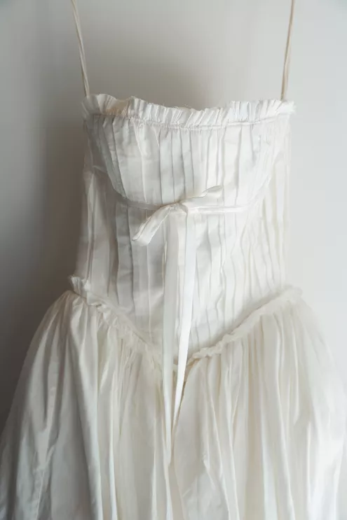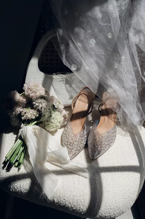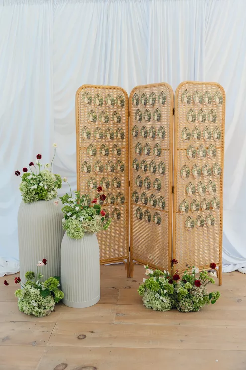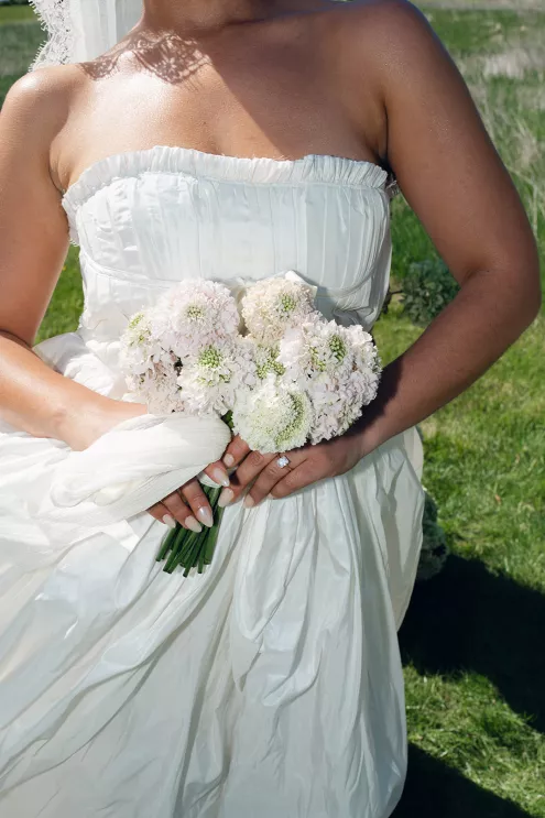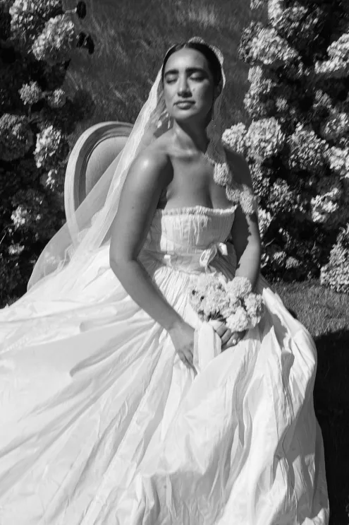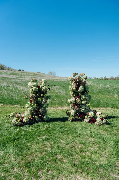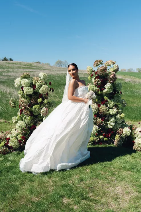 Step into an enchanting landscape where quiet luxury and delicate romanticism intertwine. Influenced by Selmer + Stone’s fields of flowers and tall grass, Renee Breanne of Renee Breanne Design Co. conceptualized a wedding design that is a beautiful representation of juxtaposition. “This editorial is a study in contrasts,” Breanne says. “Where sculptural silhouettes meet soft, romantic draping, and refined elegance blends seamlessly with the raw beauty of nature.”