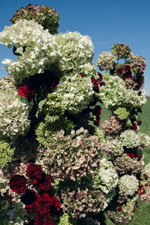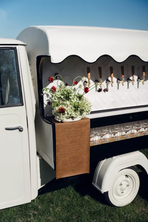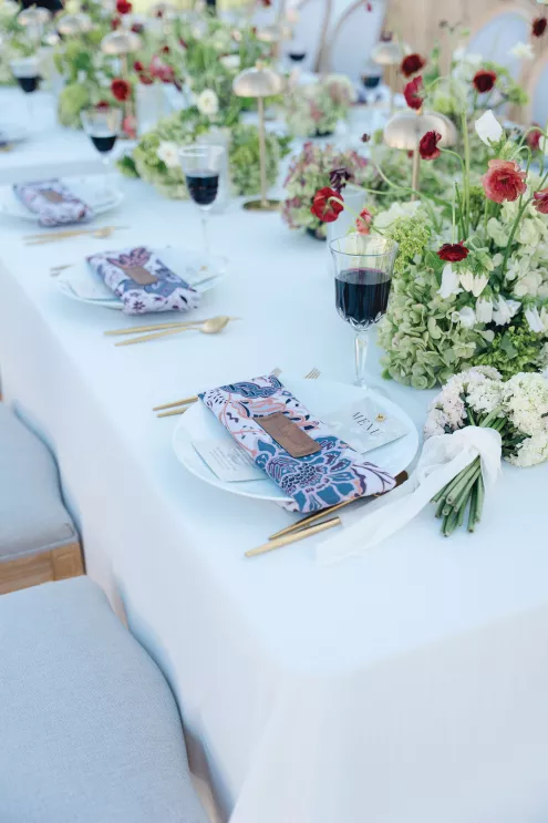 The stationery radiated old-world charm and offered a glimpse of the refined beauty yet to come. Opulent hydrangeas framed a ceremony site among the fields as the bride’s ballgown danced in the wind. Reminiscent of a cozy European soirée, cocktail hour featured antipasti and Cordial Co.’s mobile bar, crafted from a vintage Italian Piaggio Ape. Reception tables brimmed with abundant blooms, gilded accents and boldly patterned napkins, adding a touch of sophisticated grandeur. From the monochromatic florals and layered textures to the timeless flourishes and natural accents, every element of this wedding design came together in perfect harmony.