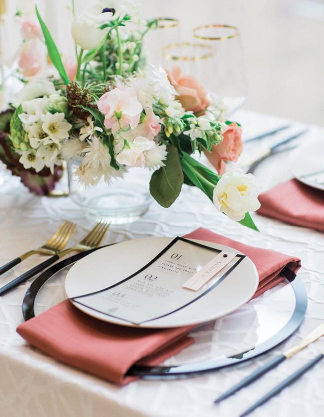 Guests will love to take a seat at this table. Set with dusty rose napkins from BBJ Linen, plateware and glassware from Event Essentials, custom chargers by Cherry Blossom Events and a Saffron Avenue menu card, the place setting exudes a refined modern aesthetic.