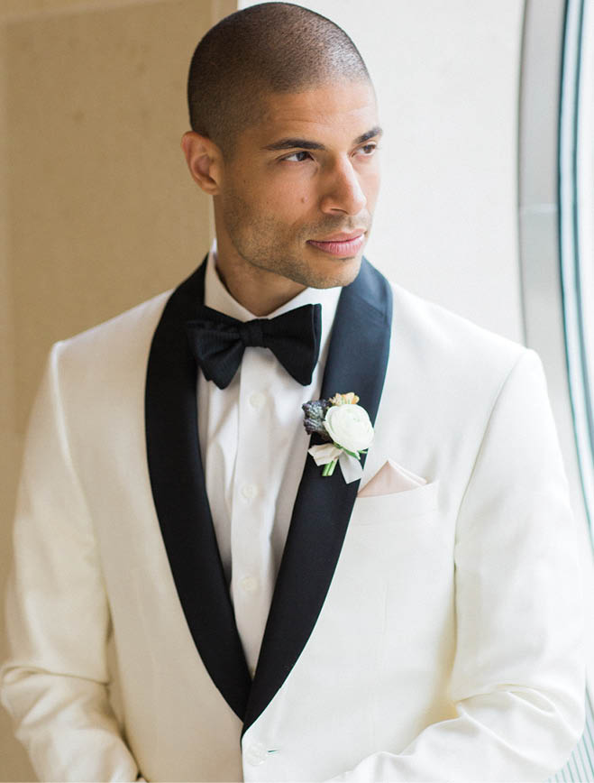 The bride isn’t the only one in white. The groom wears a classic cream tuxedo dinner jacket with shawl lapel from The Black Tux, accented by a sweet and petite boutonniere from Pollen House.