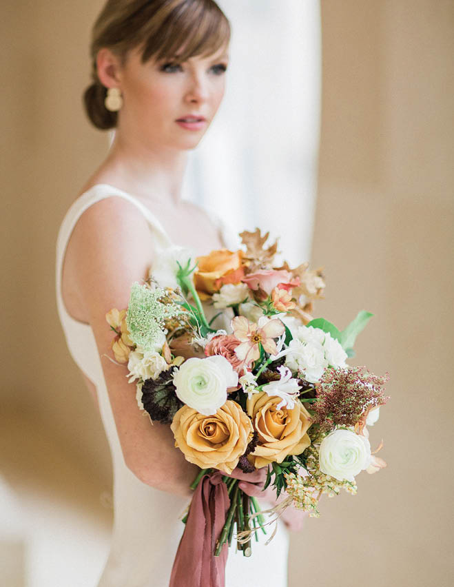 This bouquet by Pollen House takes its palette from a late-summer sunset, with butterscotch roses, creamy ranunculus and a gauzy rust ribbon.