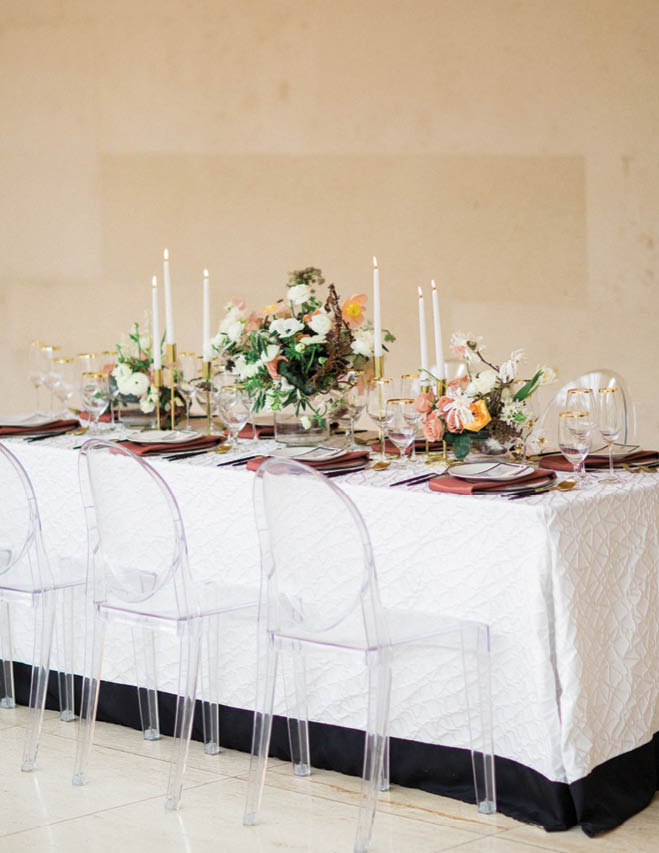 Set a head table that will turn heads. Here, acrylic ghost chairs from Arena Americas tuck into a meticulous table. A tailored cream cover from BBJ Linen is edged with sophisticated black band, smartly complementing the groom’s tuxedo (opposite), black-edged stationery, charger plate and flatware. The setting is crowned with gorgeous centerpieces from daffodil*parker, featuring petals in shades of apricot, rose and ivory.