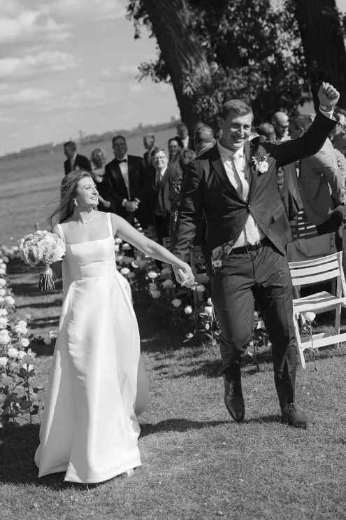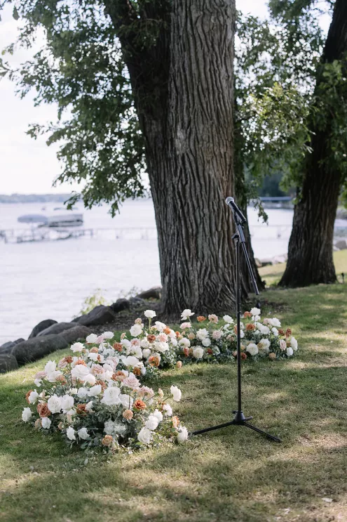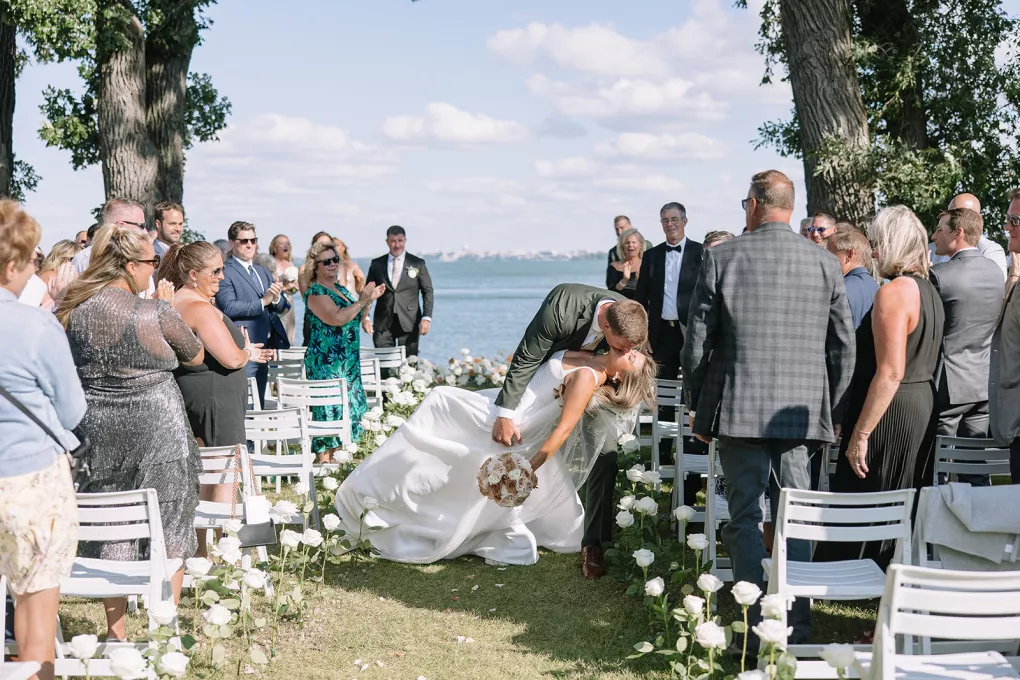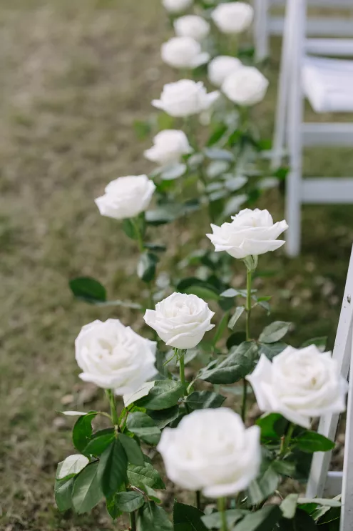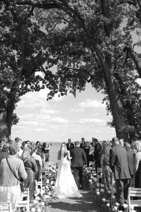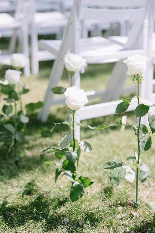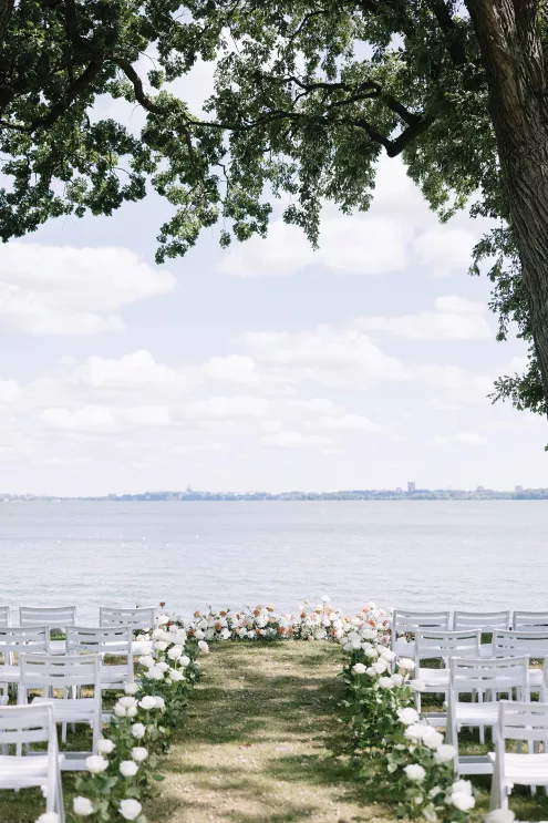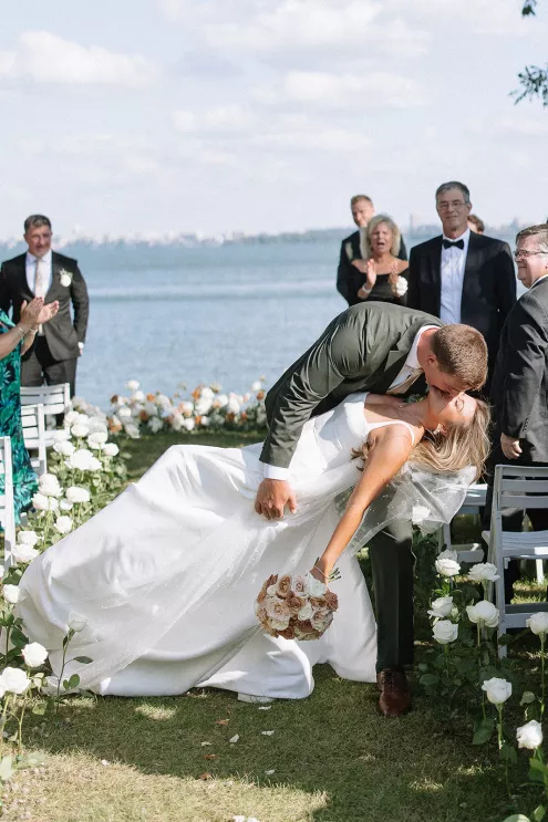 Roses are the classic symbol of love and romance, so it was fitting that they were a key element in the ceremony design for Morgan and Connor’s timeless wedding day at Bishops Bay Country Club. Creating an ethereal ambience amid the venue’s prestigious grounds, Sarah Lopez of Melody Rose Designs and Chastity Stanila of Copper Feather Events made the couple’s dream come to life. An abundance of single-stem white roses lined the aisle, leading up to a meadow of lush blooms overlooking the water. The soft scent of the roses lingered in the air, adding a magical touch to the already enchanting scene. “It was such a simple, modern and elegant statement—walking through a path of roses to say, ‘I do!’” Lopez states. Taking the elegance a step further, all the roses were repurposed and placed into bud vases alongside the newlyweds’ sweetheart table, where they continued to whisper their romance throughout the evening.