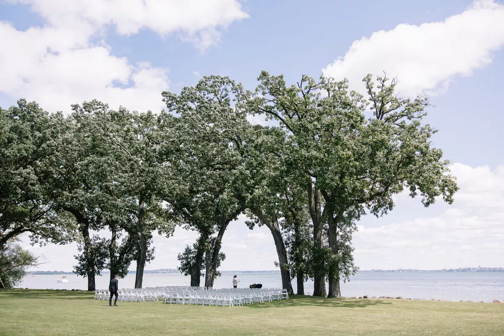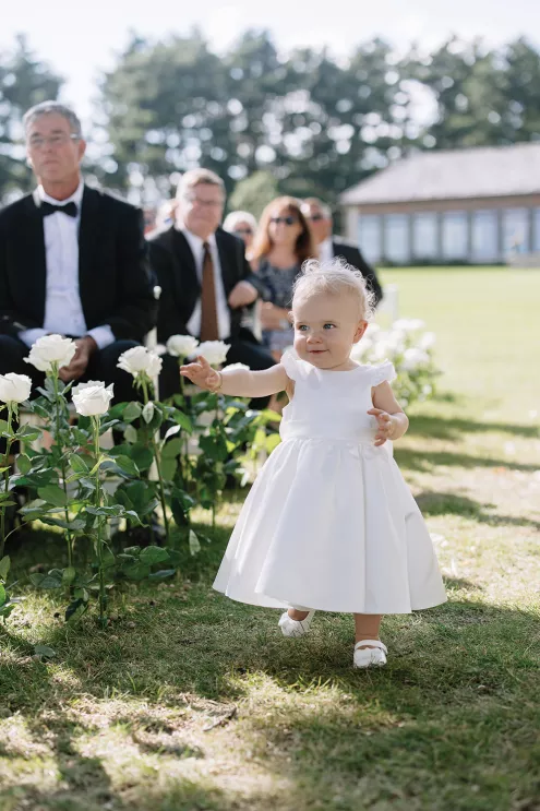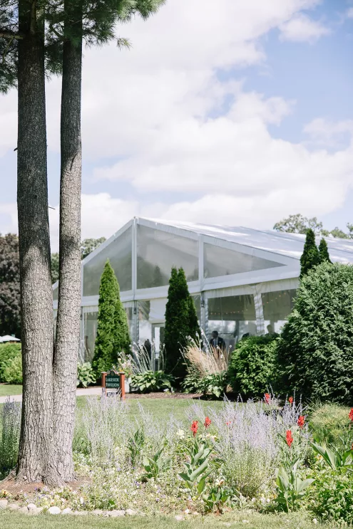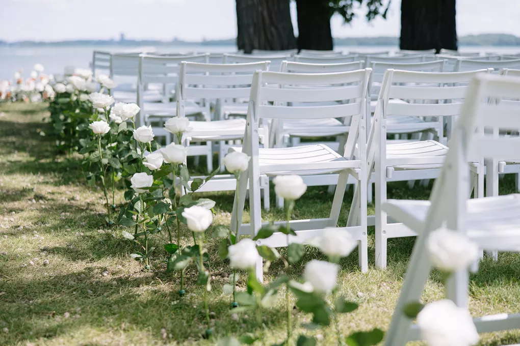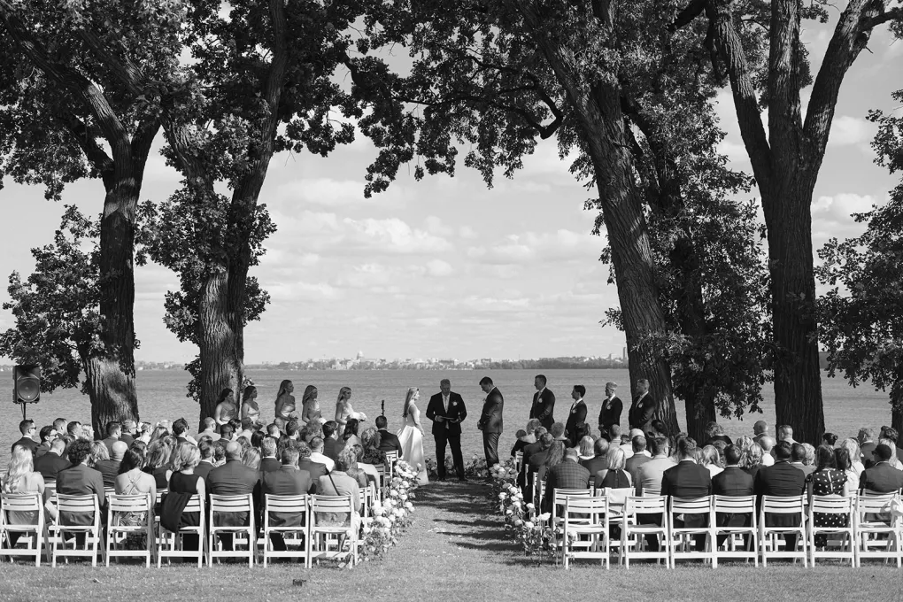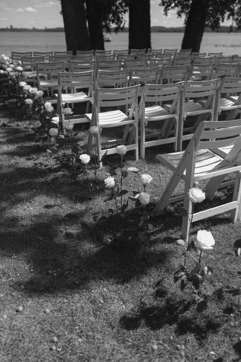Roses are the classic symbol of love and romance, so it was fitting that they were a key element in the ceremony design for Morgan and Connor’s timeless wedding day at Bishops Bay Country Club. Creating an ethereal ambience amid the venue’s prestigious grounds, Sarah Lopez of Melody Rose Designs and Chastity Stanila of Copper Feather Events made the couple’s dream come to life. An abundance of single-stem white roses lined the aisle, leading up to a meadow of lush blooms overlooking the water. The soft scent of the roses lingered in the air, adding a magical touch to the already enchanting scene. “It was such a simple, modern and elegant statement—walking through a path of roses to say, ‘I do!’” Lopez states. Taking the elegance a step further, all the roses were repurposed and placed into bud vases alongside the newlyweds’ sweetheart table, where they continued to whisper their romance throughout the evening.