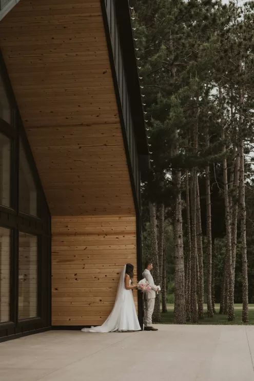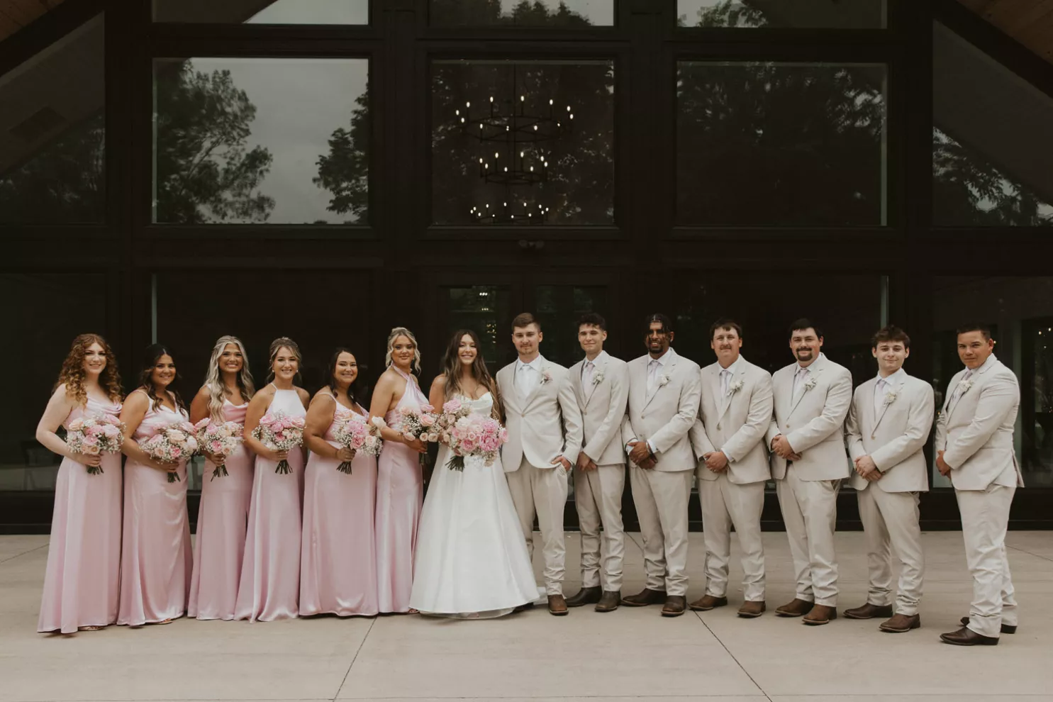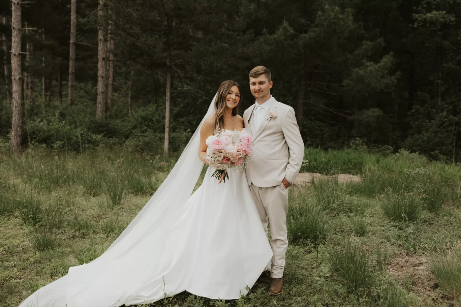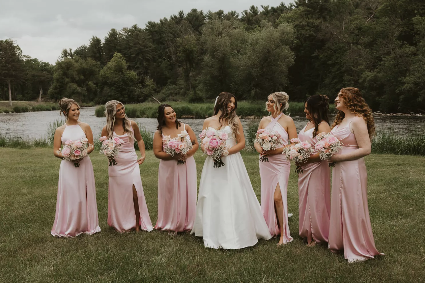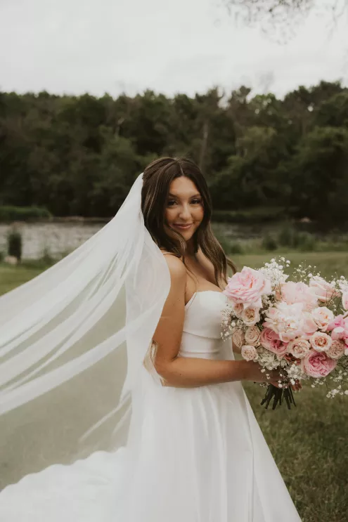 For Megan and Austin, June has always held special meaning. The couple began dating in June, got engaged a few years later and ultimately chose the same month to say “I do.” Set against sweeping river views, La Pointe Events served as a blank-slate backdrop for their wedding day. Inspired by lush garden celebrations, the venue was filled with baby pink and white roses, hydrangeas, baby’s breath and sunset-hued peonies, creating an airy, romantic atmosphere. The bride and groom exchanged vows with the river softly flowing nearby and surrounded by their closest friends and family.