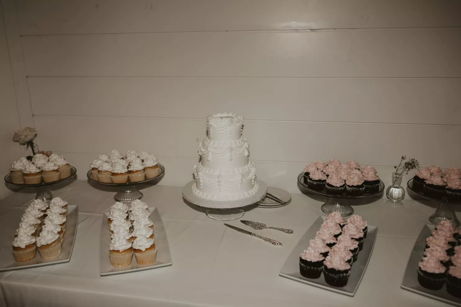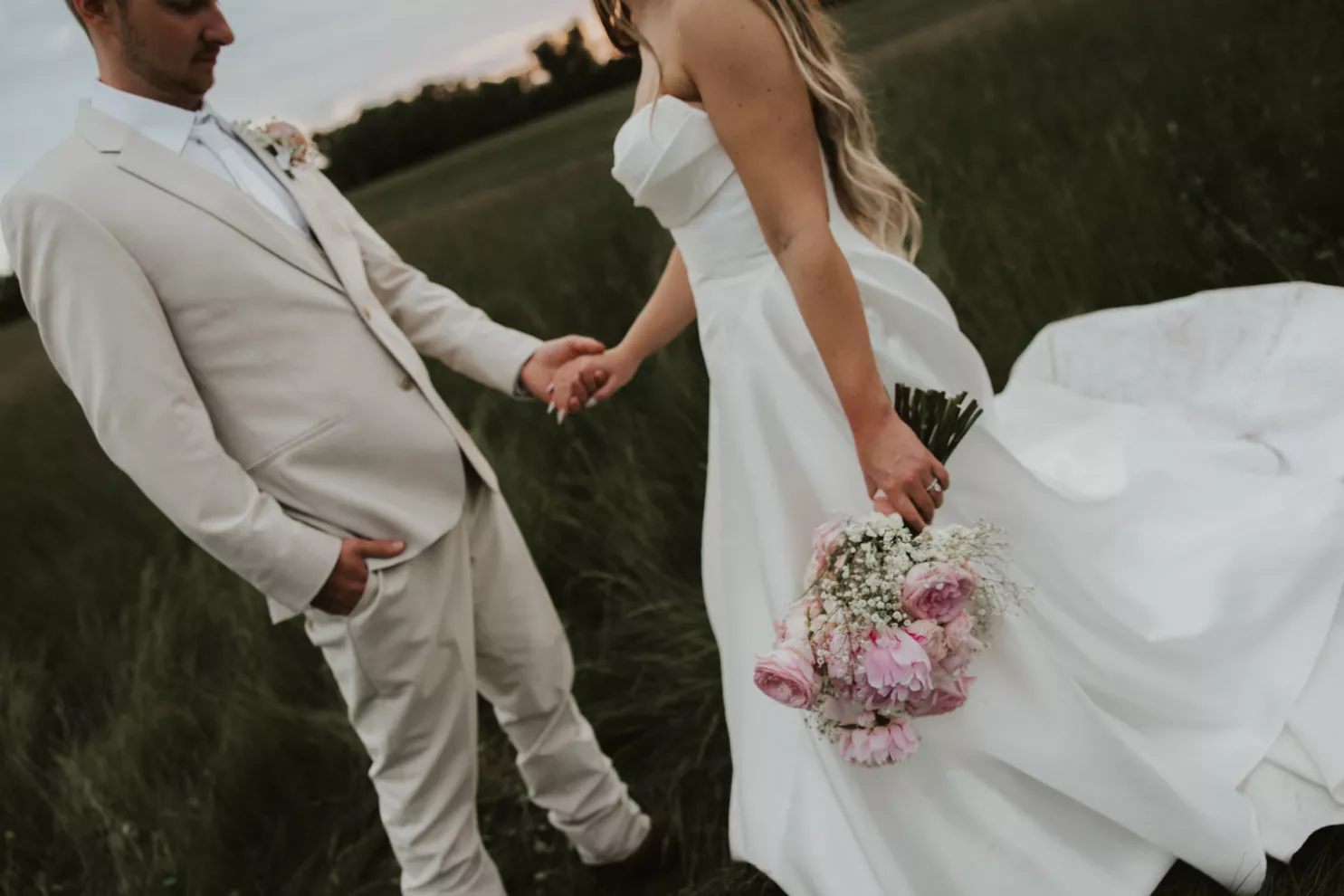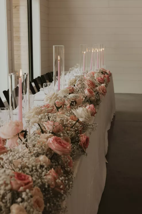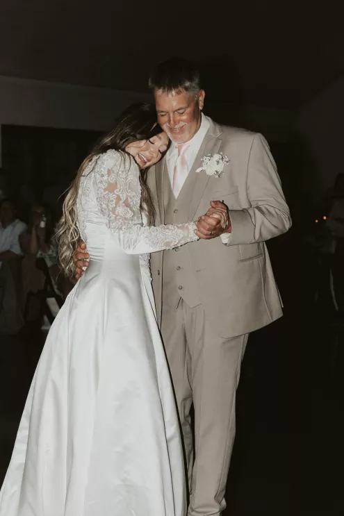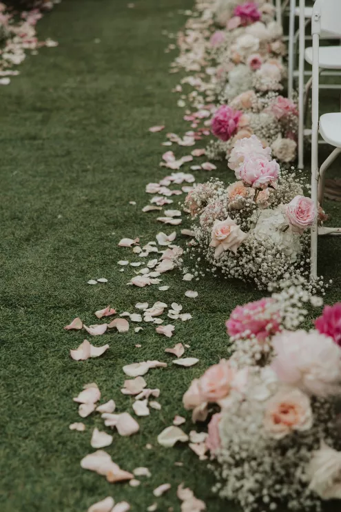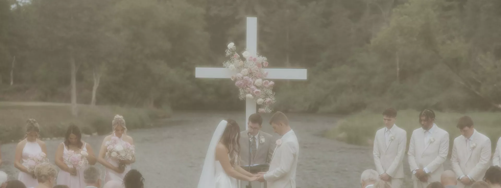 The ceremony altar featured a white cross handcrafted by the bride’s father and draped in florals, while the aisle itself overflowed with blooms. In a nod to their country roots, the groom and groomsmen wore cowboy boots beneath neutral-toned summer suits; the bridesmaids complemented the palette in baby-pink dresses. Following the intimate ceremony, additional loved ones joined the couple for cocktail hour to toast the newlyweds.