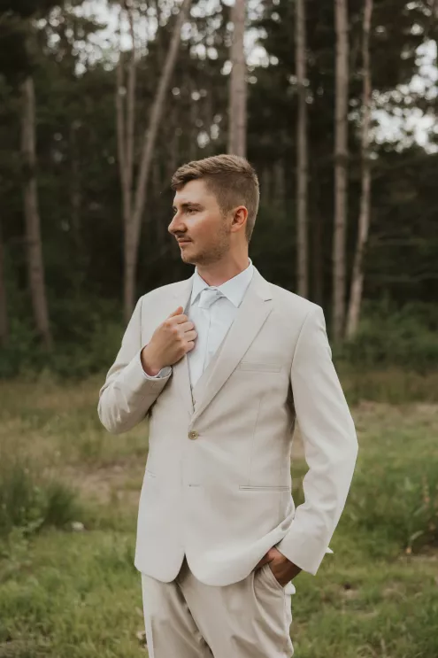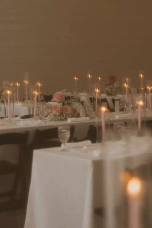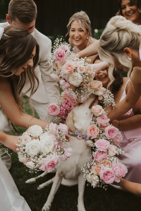 Megan honored her parents during the reception by changing into her mother's wedding dress for a touching father-daughter dance. As the evening unfolded, blush tapers and soft florals set the scene for a true Wisconsin celebration, complete with cheese curds and pizza. Thoughtful details carried through the night, from custom drink cozies featuring the couple’s pets to a special appearance by their pup for family photos. As dusk settled in, Megan slipped into her final look of the night — a strapless mini — and the celebration kicked into high gear.
