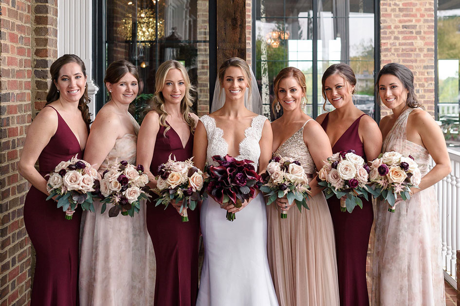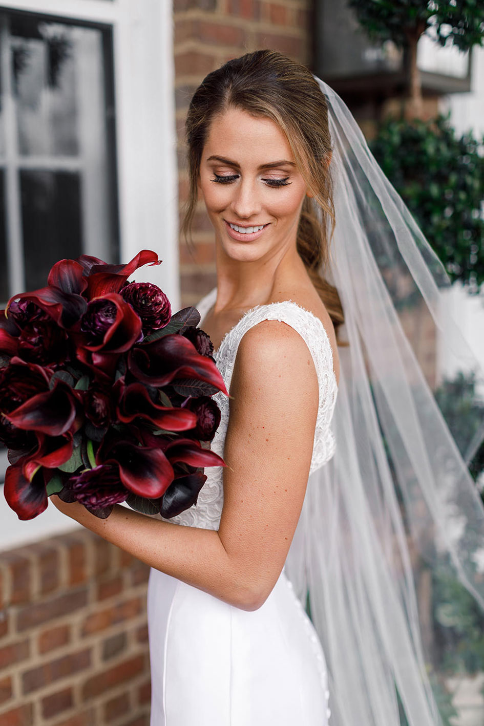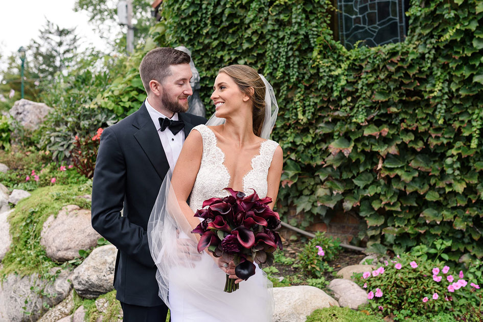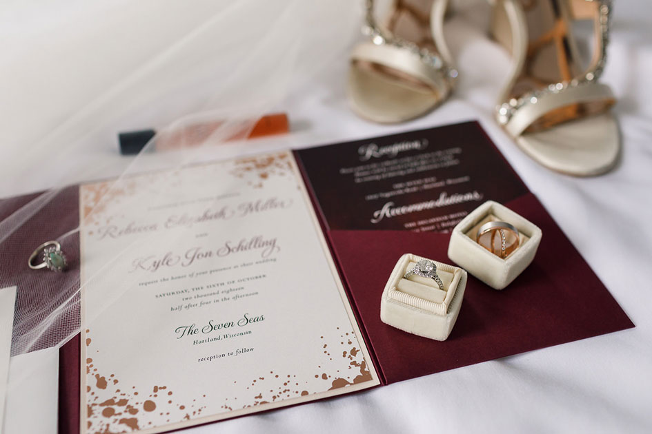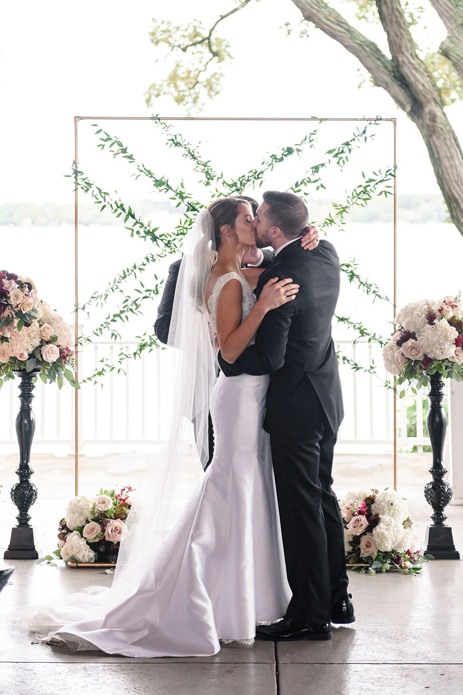 This beautiful love story began in the operating room during a lung transplant and became official during a classic lakeside wedding. Rebecca and Kyle incorporated burgundy, blush, ivory and black into their dramatic color scheme, and they both wore signature scents to help them remember the day. The 13-person wedding party enjoyed an assortment of Wisconsin brews while getting ready together. For dessert, guests chose between cheesecake and cupcakes before dancing the night away.