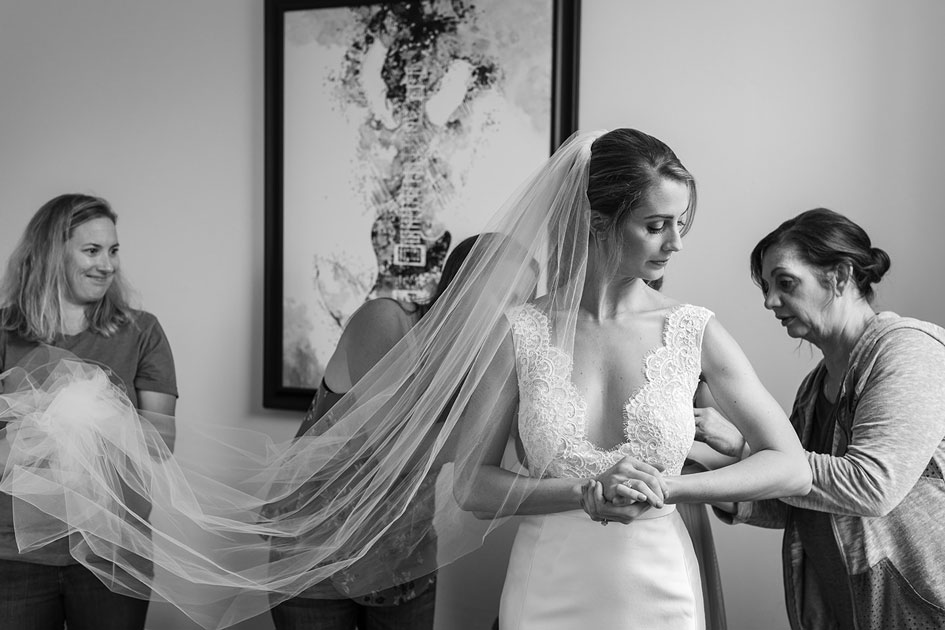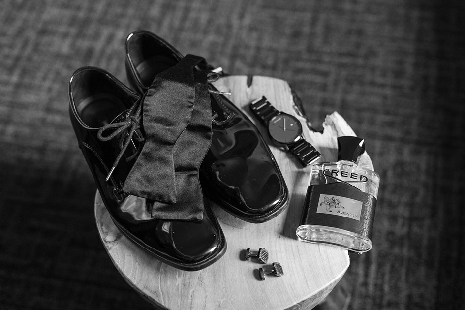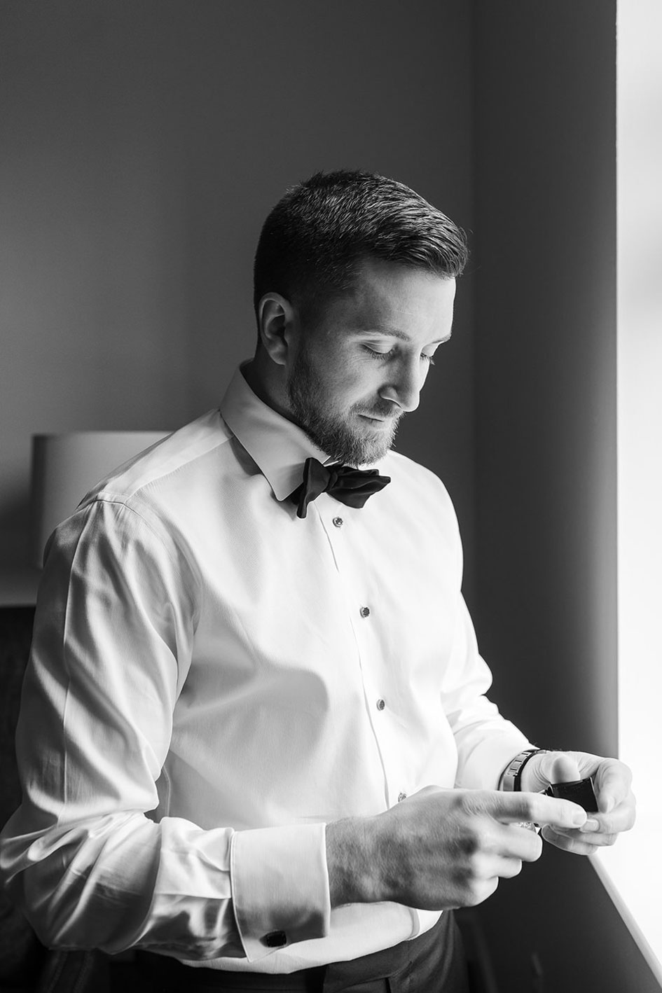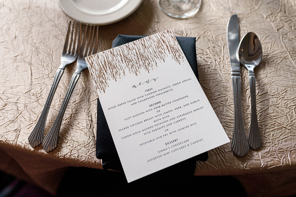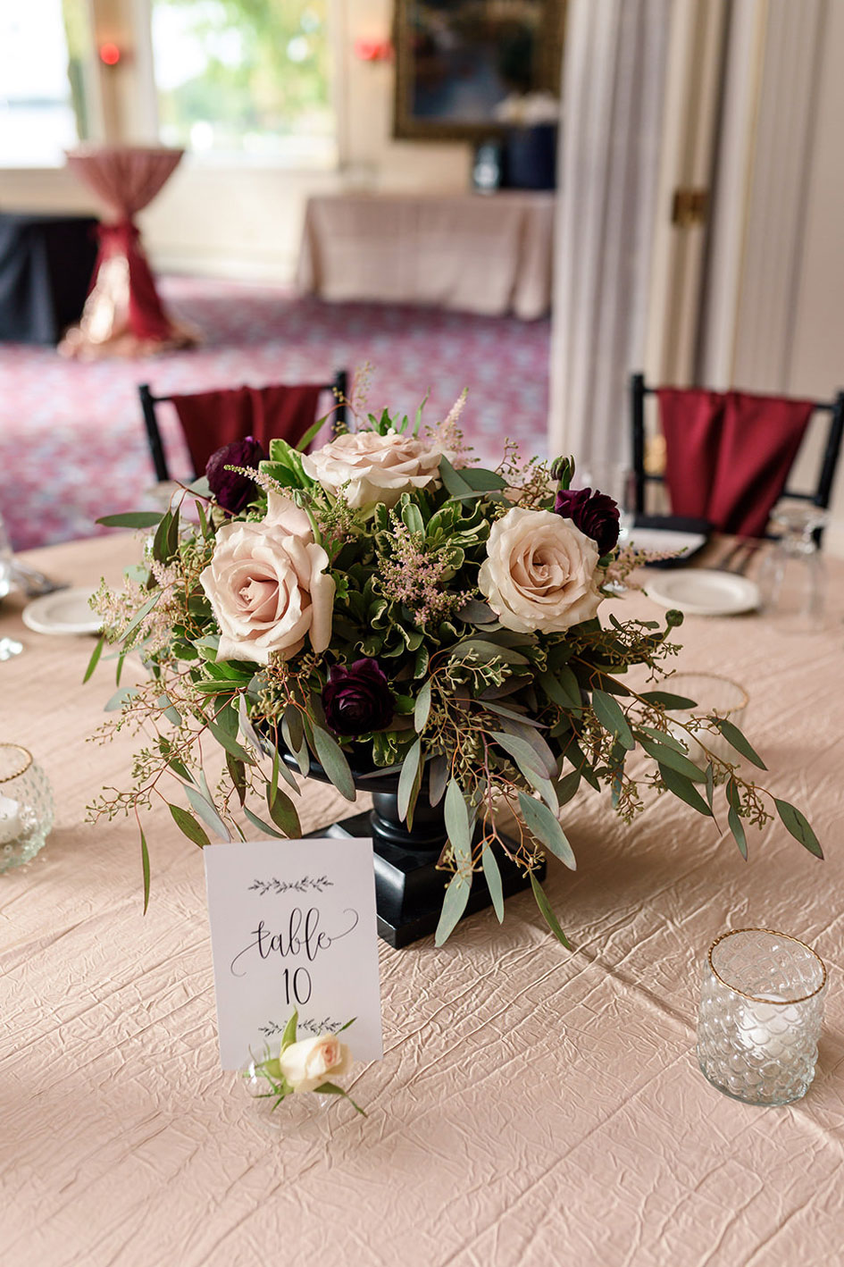 This beautiful love story began in the operating room during a lung transplant and became official during a classic lakeside wedding. Rebecca and Kyle incorporated burgundy, blush, ivory and black into their dramatic color scheme, and they both wore signature scents to help them remember the day. The 13-person wedding party enjoyed an assortment of Wisconsin brews while getting ready together. For dessert, guests chose between cheesecake and cupcakes before dancing the night away.