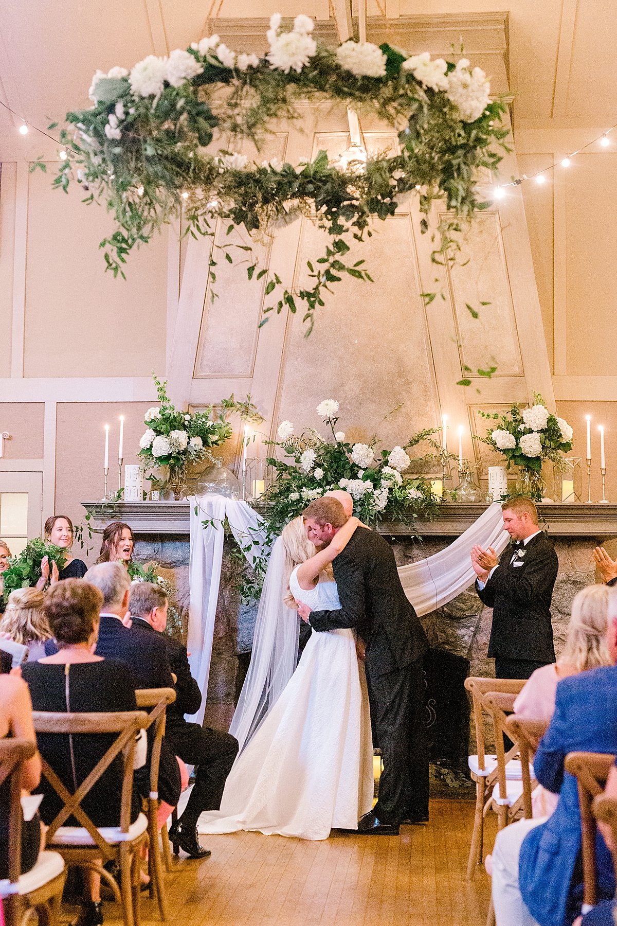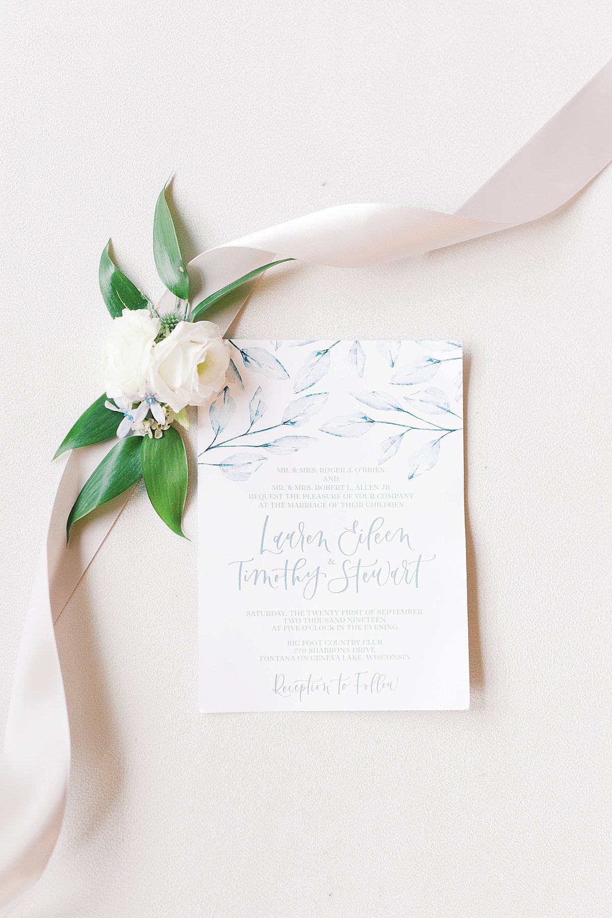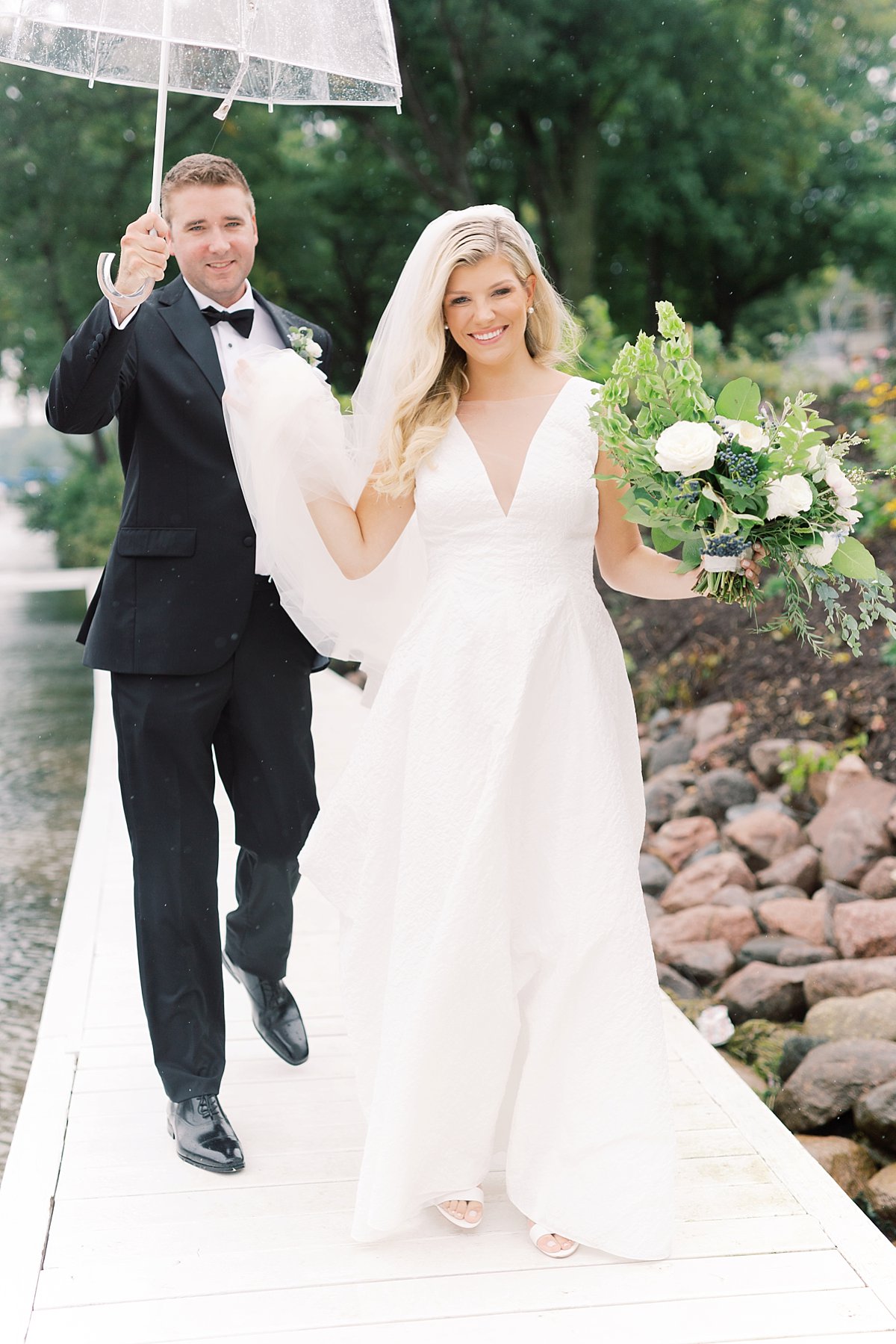 Lauren O’Brien was 10 years old when she decided 14-year-old Tim Allen was her “ultimate childhood crush” after they met at family gatherings at Lake Geneva. Ten years later, Tim’s dad learned about the crush and was successful in his mission to set them up. Fast forward four summers, and the two were back at the lake where it all started. Tim told Lauren he couldn't imagine spending the rest of his life without her. After Lauren said “yes!” she was surprised to see her closest family and friends waiting in Abbey Harbor House to celebrate their engagement. On their wedding day, the rain forced the ceremony inside, but the planner and vendors did a seamless job transitioning. Lauren and Tim said “I do” in the ballroom under a large floral circle filled with greenery and white flowers, a gift from the florist. A neutral palette of white and silver decorated the venue, with light blue in the linens and floral bouquets to adding a pop of color. Guests could sip on some bubbly at the custom-made Champagne wall, which was the talk of the night, or head over to the “You + Me” neon sign above the fireplace for a photo-op. The couple’s favorite part of the night was hearing the speeches about their love story through the eyes of family and friends. But nothing could top the sentimental speech from Lauren’s dad. “He gave his blessing, and you could see how happy he was that Timmy and I would be spending our lives together,” Lauren says.