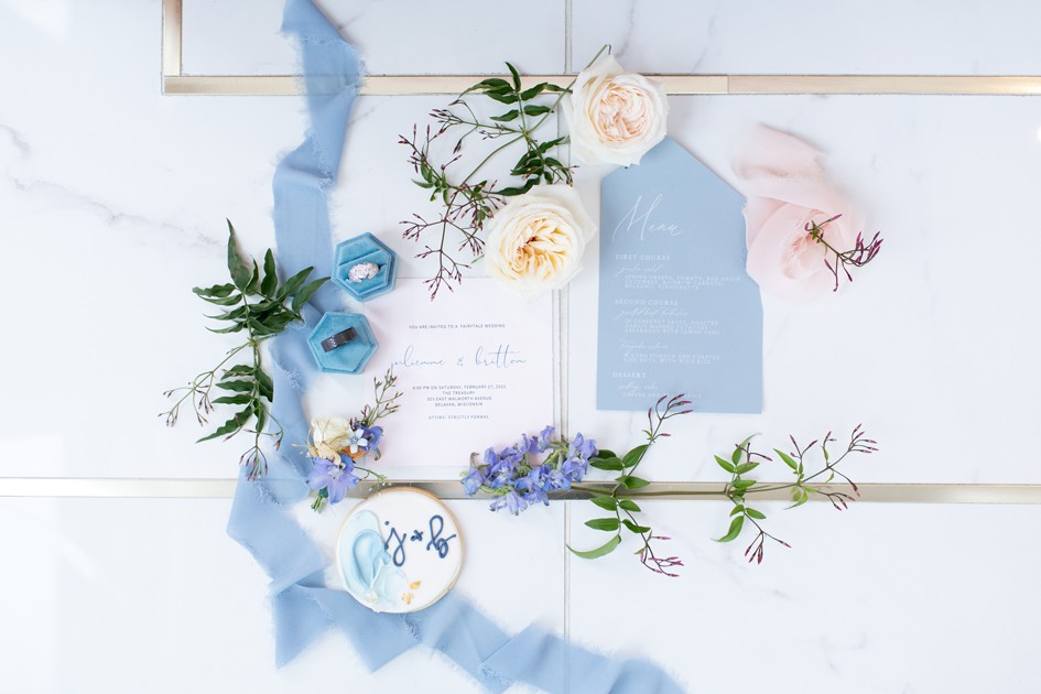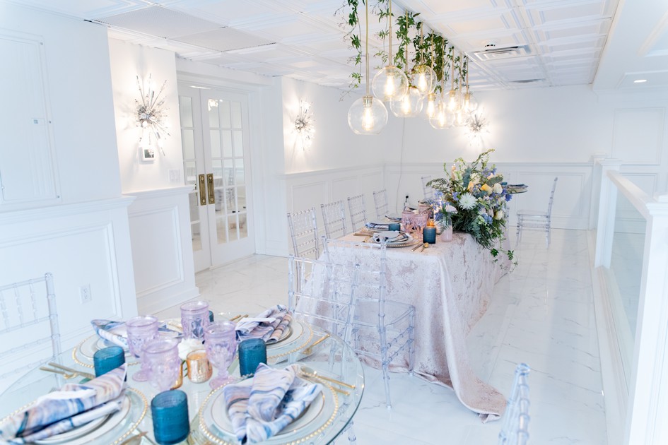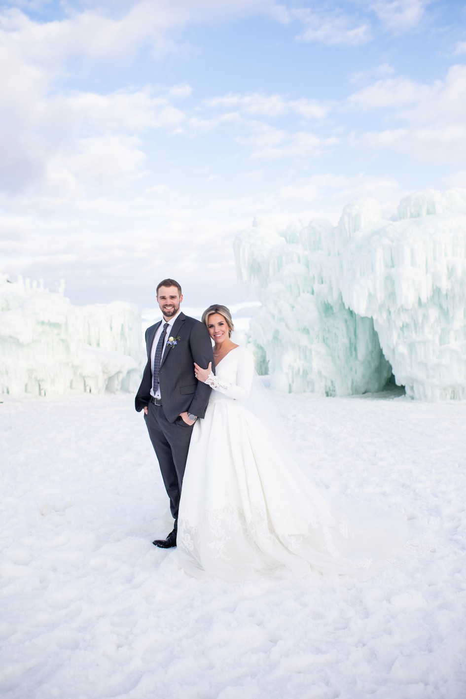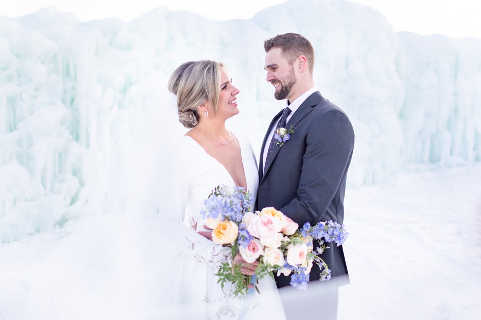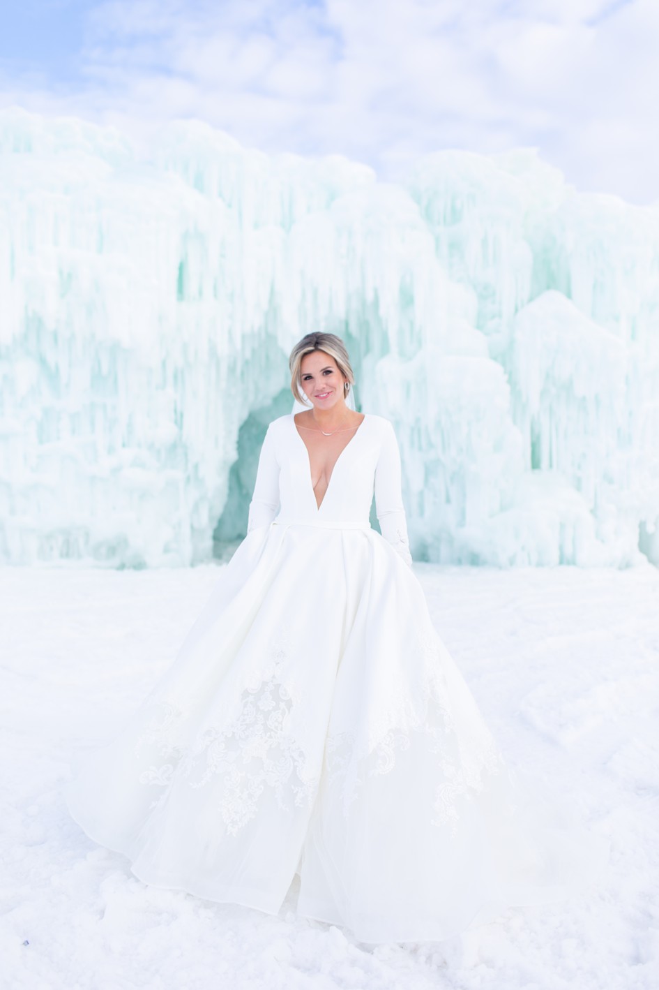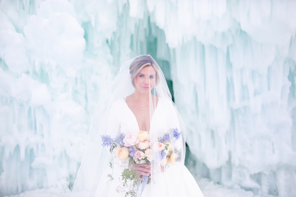 For the past three years, it's been a tradition of Elyse Bullard of Elyse Bullard Photography, Jillian Niemann of The Treasury and Jillian Niemann Makeup & Hair, and Brittney Strathmann of Willow Design to come together and create fabulous wedding inspirations. This year, their wedding inspiration took place at both The Treasury in Delavan and the Ice Castles in Lake Geneva. Lake Geneva is the hometown of the trio, and they called their team from the shoot their "favorite local vendor friends" who hailed from Lake Geneva, Madison, Milwaukee, Janesville, Beloit, and Chicago. The team chose a soft and icy palette which fit with the desired mood of the shoot--soft, romantic winter glamour. Napkins by BBJ Linen with swirling marbling echoed the ice formations onsite at Ice Castles. Pink velvet table linens, also by BBJ Linen, matched The Treasury's Glam Lounge pink velvet chairs. The team filled the room with candles and pink and ivory blooms by Willow Design. Furthermore, floor to ceiling drapery, acrylic chuppah, and hanging crystal globe bulbs by Chance Productions added romantic touches. A delicious vanilla almond cake with vanilla bean frosting by Poppy Cakes Patisserie was designed with icy textured frosting and edible "ice" crystals. For her first full scale shoot after completing construction at The Treasury, Niemann aced, or "iced", it!