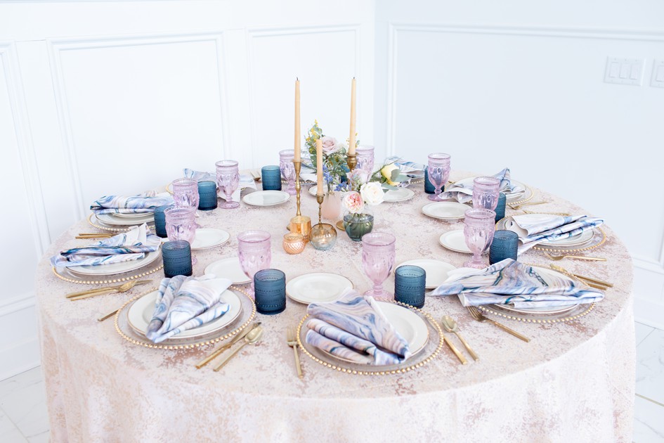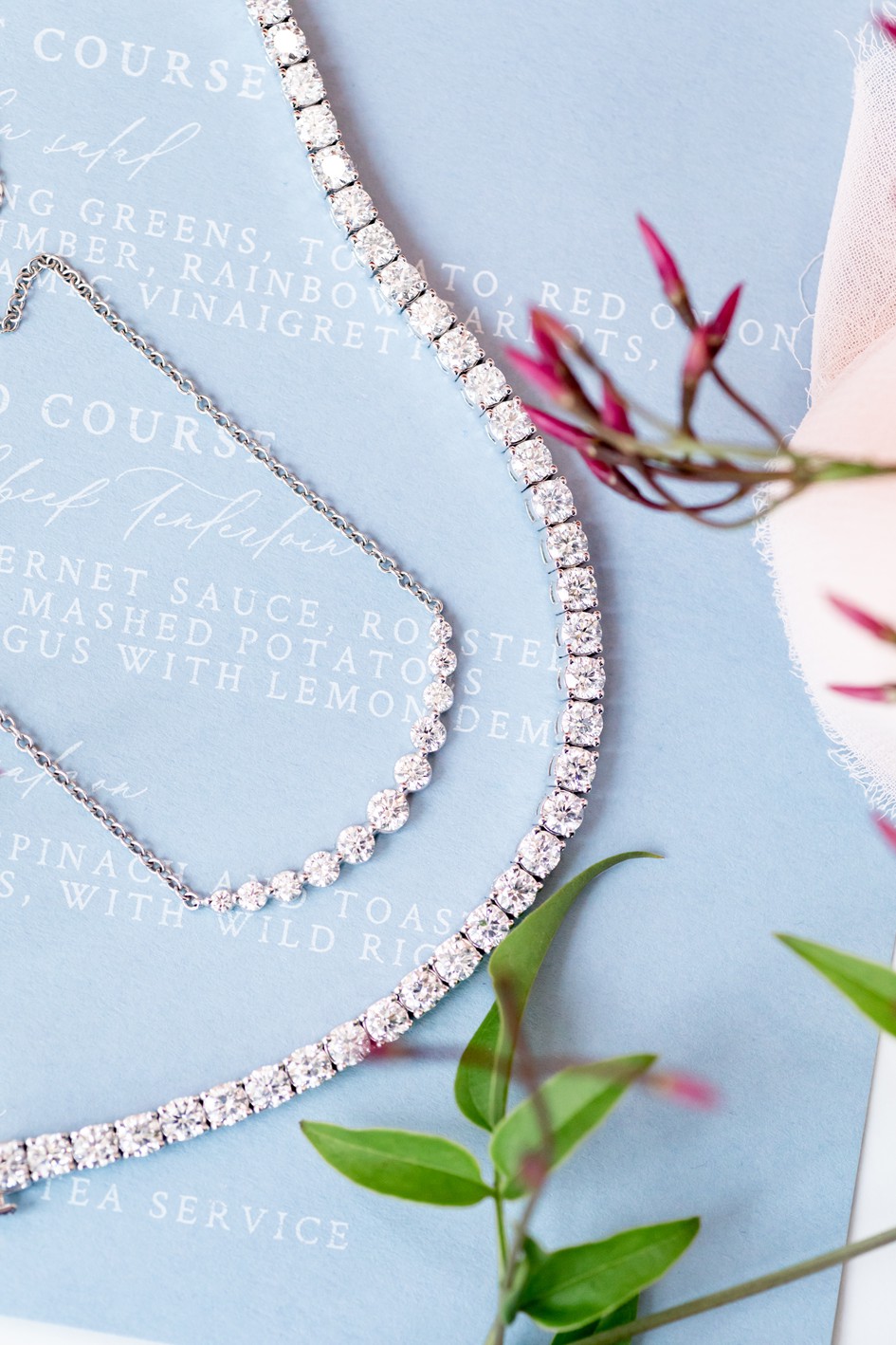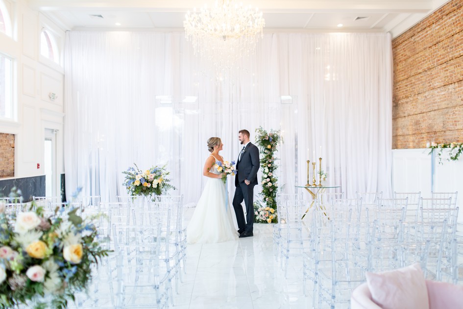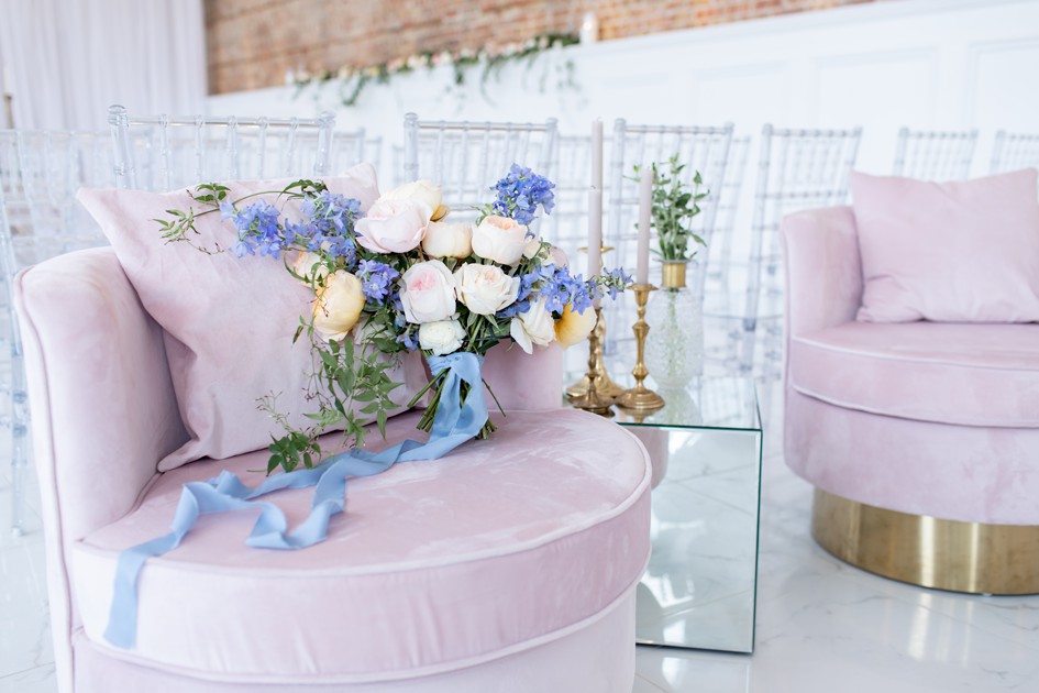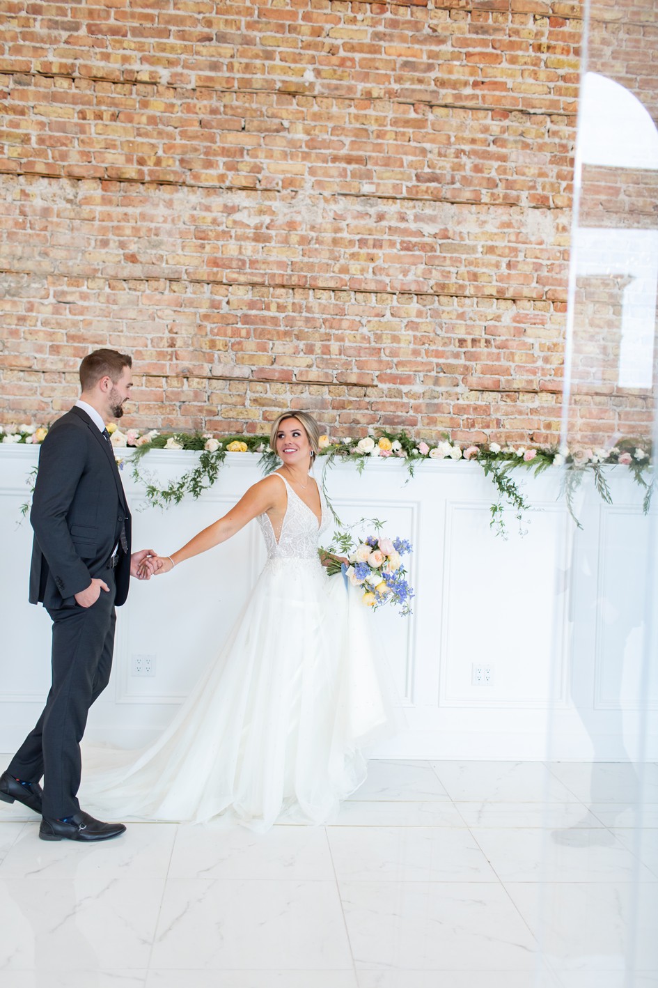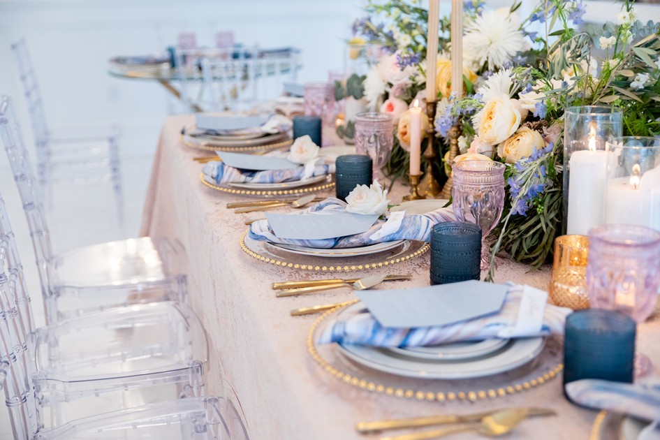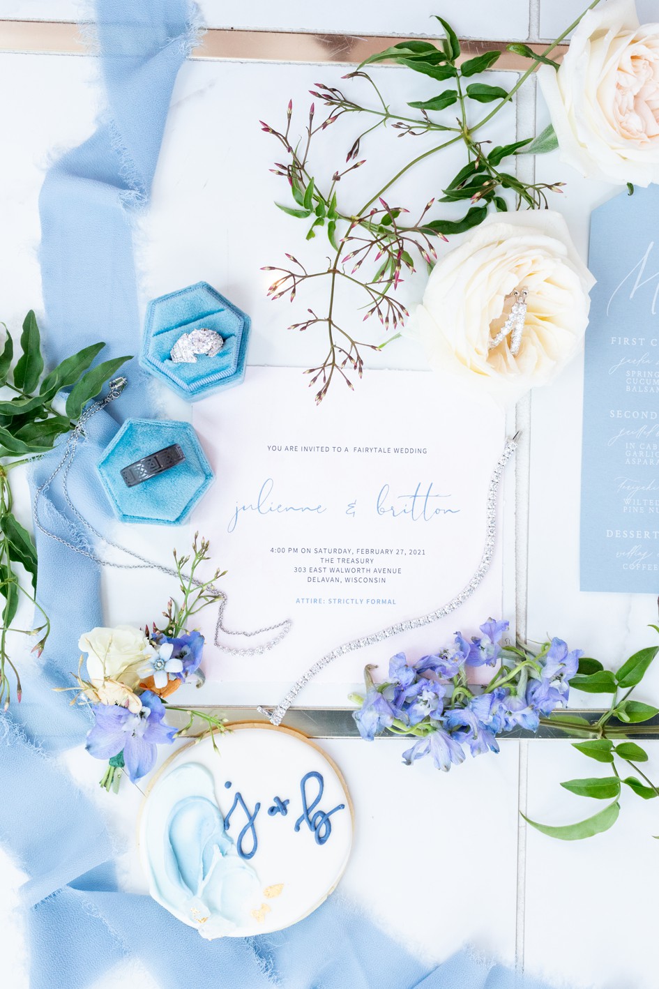 For the past three years, it's been a tradition of Elyse Bullard of Elyse Bullard Photography, Jillian Niemann of The Treasury and Jillian Niemann Makeup & Hair, and Brittney Strathmann of Willow Design to come together and create fabulous wedding inspirations. This year, their wedding inspiration took place at both The Treasury in Delavan and the Ice Castles in Lake Geneva. Lake Geneva is the hometown of the trio, and they called their team from the shoot their "favorite local vendor friends" who hailed from Lake Geneva, Madison, Milwaukee, Janesville, Beloit, and Chicago. The team chose a soft and icy palette which fit with the desired mood of the shoot--soft, romantic winter glamour. Napkins by BBJ Linen with swirling marbling echoed the ice formations onsite at Ice Castles. Pink velvet table linens, also by BBJ Linen, matched The Treasury's Glam Lounge pink velvet chairs. The team filled the room with candles and pink and ivory blooms by Willow Design. Furthermore, floor to ceiling drapery, acrylic chuppah, and hanging crystal globe bulbs by Chance Productions added romantic touches. A delicious vanilla almond cake with vanilla bean frosting by Poppy Cakes Patisserie was designed with icy textured frosting and edible "ice" crystals. For her first full scale shoot after completing construction at The Treasury, Niemann aced, or "iced", it!