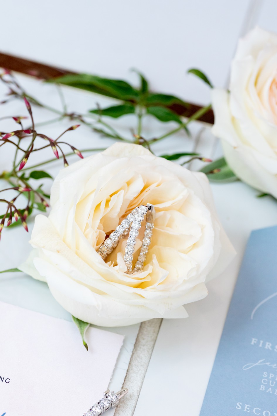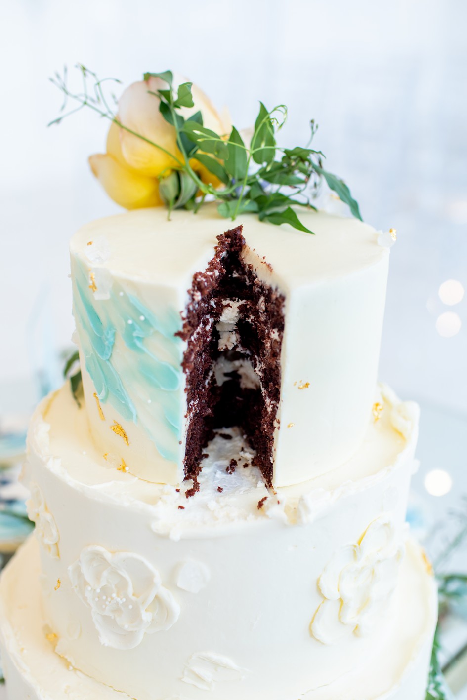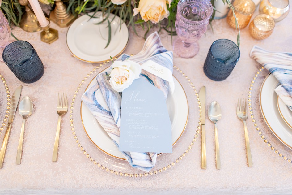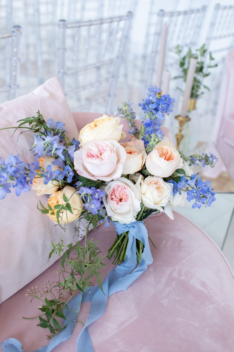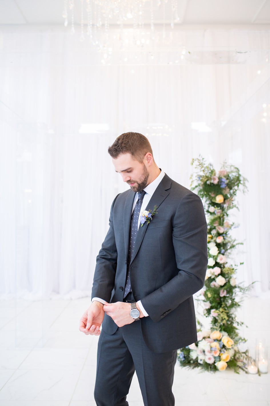 For the past three years, it's been a tradition of Elyse Bullard of Elyse Bullard Photography, Jillian Niemann of The Treasury and Jillian Niemann Makeup & Hair, and Brittney Strathmann of Willow Design to come together and create fabulous wedding inspirations. This year, their wedding inspiration took place at both The Treasury in Delavan and the Ice Castles in Lake Geneva. Lake Geneva is the hometown of the trio, and they called their team from the shoot their "favorite local vendor friends" who hailed from Lake Geneva, Madison, Milwaukee, Janesville, Beloit, and Chicago. The team chose a soft and icy palette which fit with the desired mood of the shoot--soft, romantic winter glamour. Napkins by BBJ Linen with swirling marbling echoed the ice formations onsite at Ice Castles. Pink velvet table linens, also by BBJ Linen, matched The Treasury's Glam Lounge pink velvet chairs. The team filled the room with candles and pink and ivory blooms by Willow Design. Furthermore, floor to ceiling drapery, acrylic chuppah, and hanging crystal globe bulbs by Chance Productions added romantic touches. A delicious vanilla almond cake with vanilla bean frosting by Poppy Cakes Patisserie was designed with icy textured frosting and edible "ice" crystals. For her first full scale shoot after completing construction at The Treasury, Niemann aced, or "iced", it!