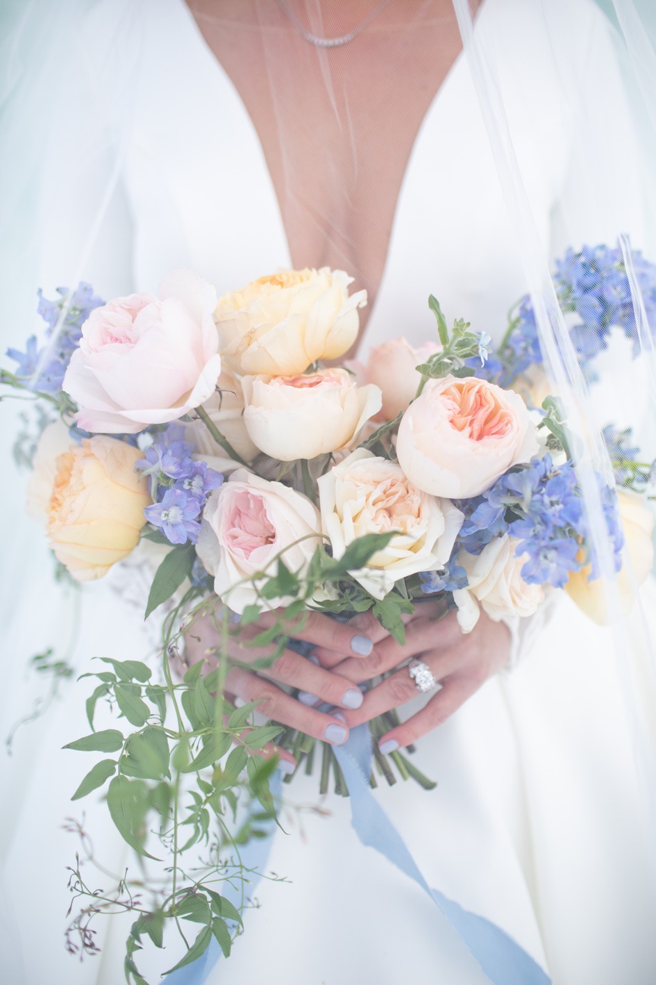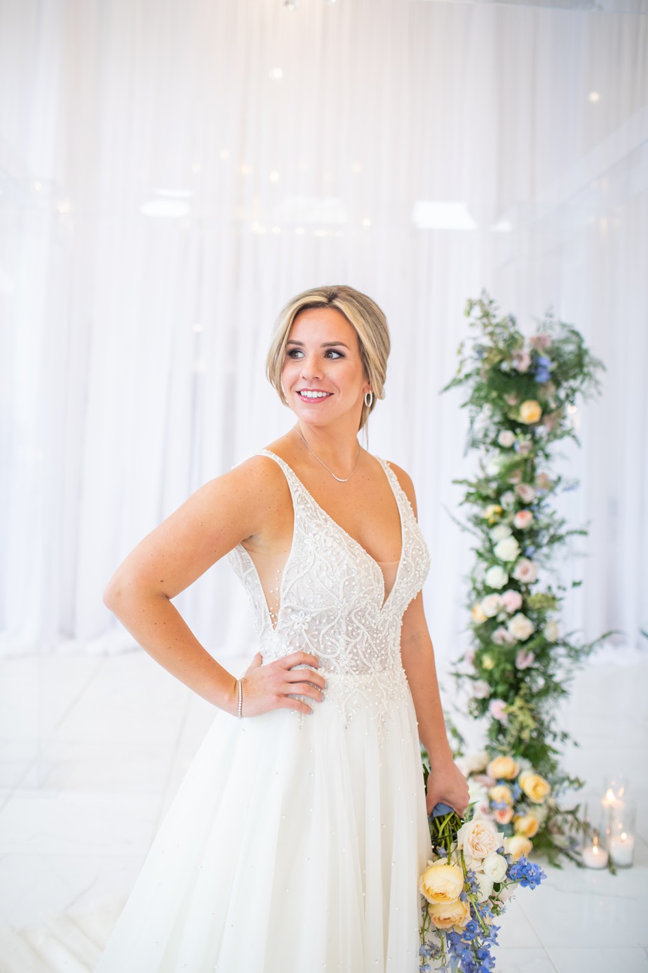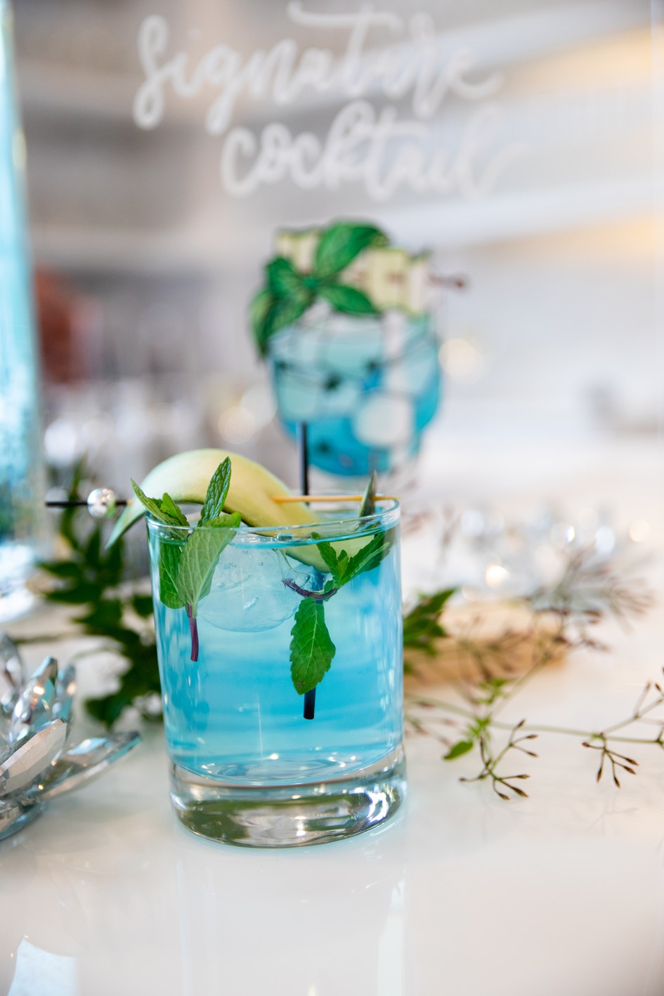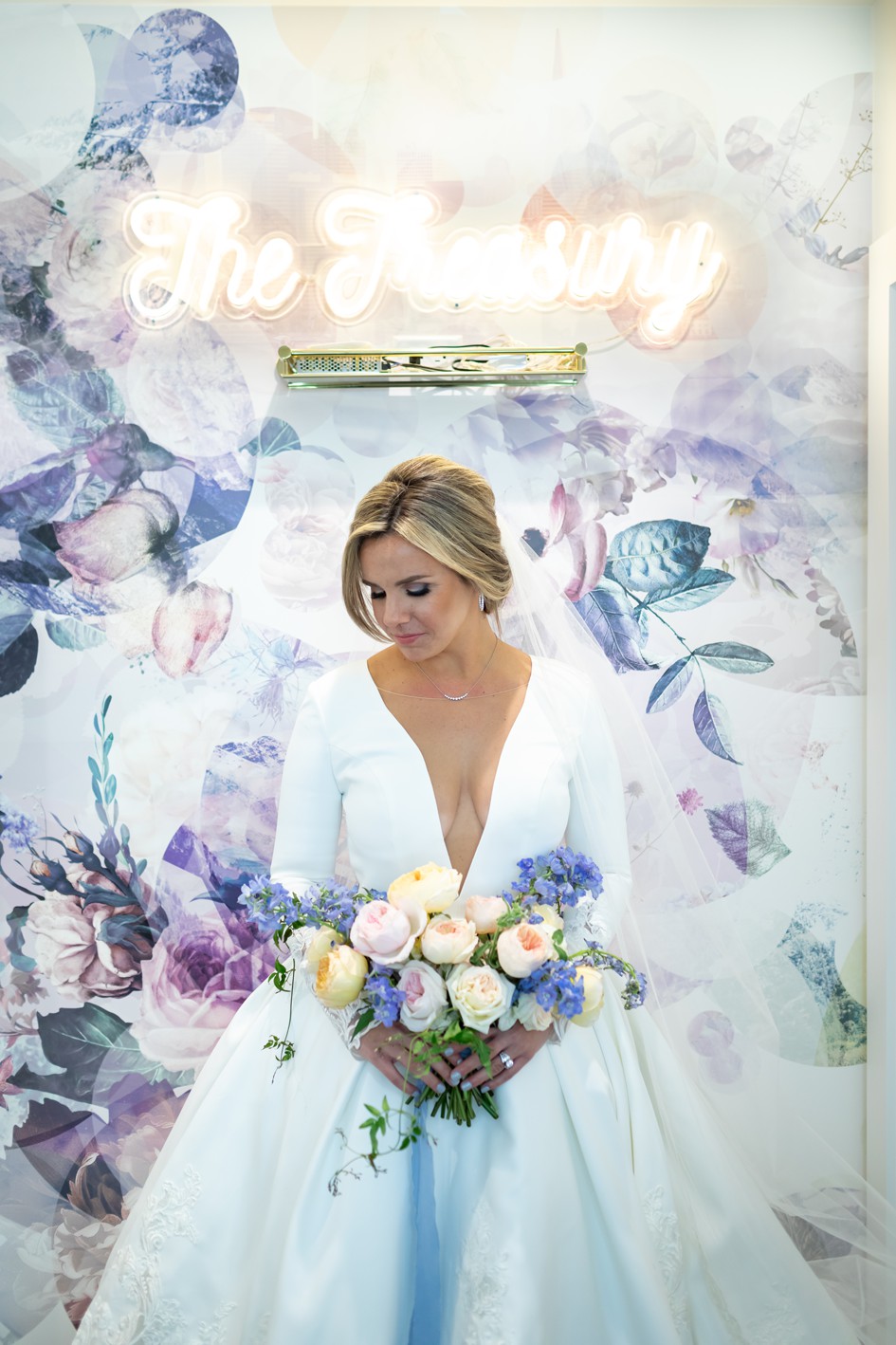 For the past three years, it's been a tradition of Elyse Bullard of Elyse Bullard Photography, Jillian Niemann of The Treasury and Jillian Niemann Makeup & Hair, and Brittney Strathmann of Willow Design to come together and create fabulous wedding inspirations. This year, their wedding inspiration took place at both The Treasury in Delavan and the Ice Castles in Lake Geneva. Lake Geneva is the hometown of the trio, and they called their team from the shoot their "favorite local vendor friends" who hailed from Lake Geneva, Madison, Milwaukee, Janesville, Beloit, and Chicago. The team chose a soft and icy palette which fit with the desired mood of the shoot--soft, romantic winter glamour. Napkins by BBJ Linen with swirling marbling echoed the ice formations onsite at Ice Castles. Pink velvet table linens, also by BBJ Linen, matched The Treasury's Glam Lounge pink velvet chairs. The team filled the room with candles and pink and ivory blooms by Willow Design. Furthermore, floor to ceiling drapery, acrylic chuppah, and hanging crystal globe bulbs by Chance Productions added romantic touches. A delicious vanilla almond cake with vanilla bean frosting by Poppy Cakes Patisserie was designed with icy textured frosting and edible "ice" crystals. For her first full scale shoot after completing construction at The Treasury, Niemann aced, or "iced", it!