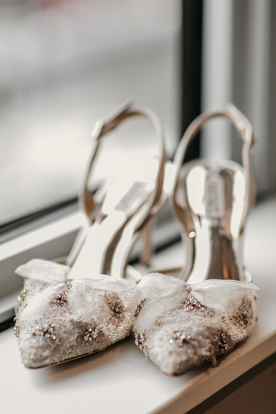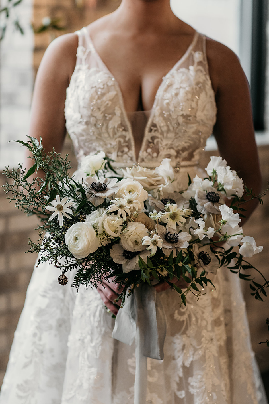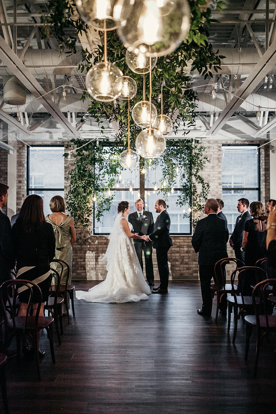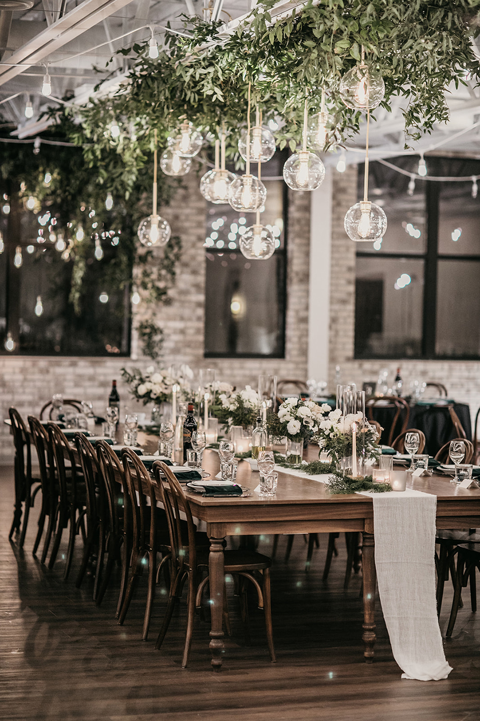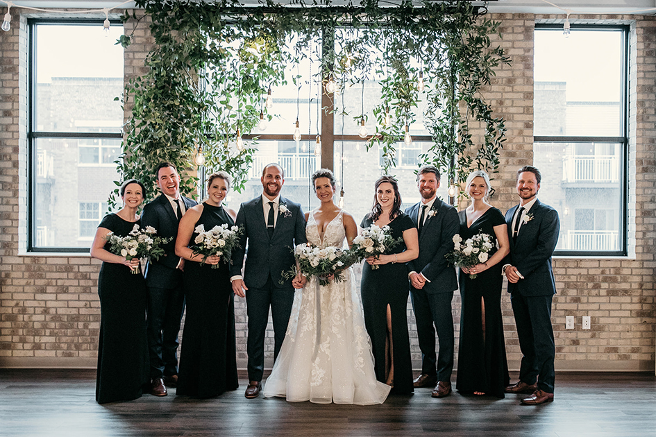 The wedding represented the couple perfectly. Guests were greeted by a “Bubbles & Buds” entrance wall, where guests could select champagne (Sara’s drink of choice), or Jake’s go-to, Bud Light. Channeling a cozy “up north” vibe, seasonal greenery, pendant lighting and Edison bulbs were blended into the neutral color palette. The exposed brick, walls of windows and warm wood tones added to the charm.