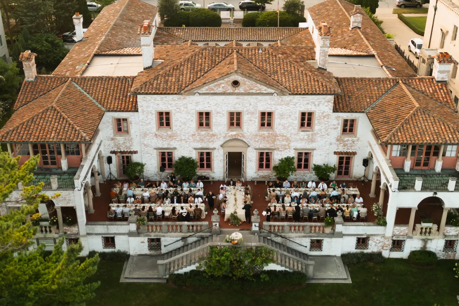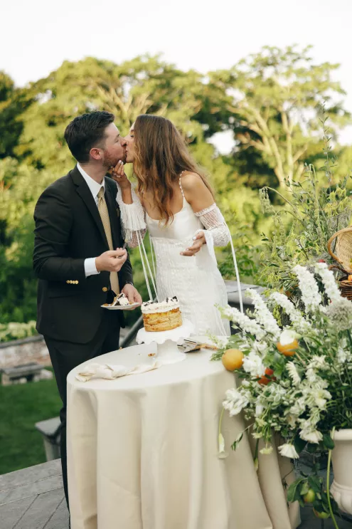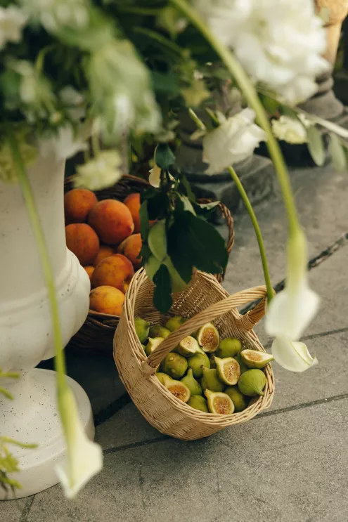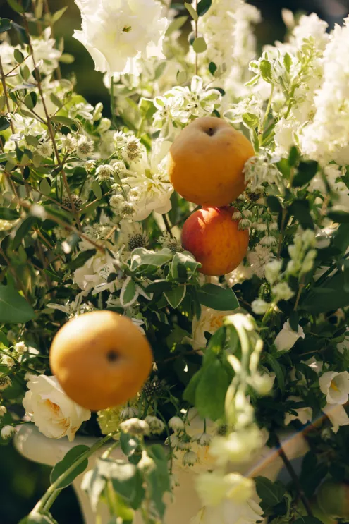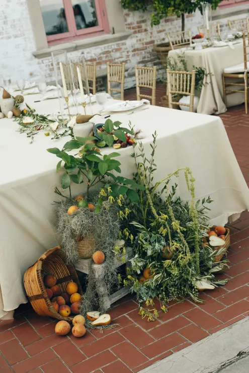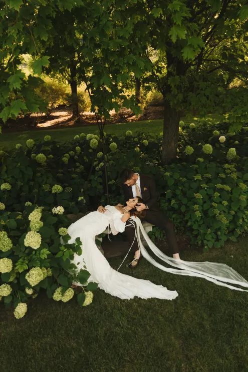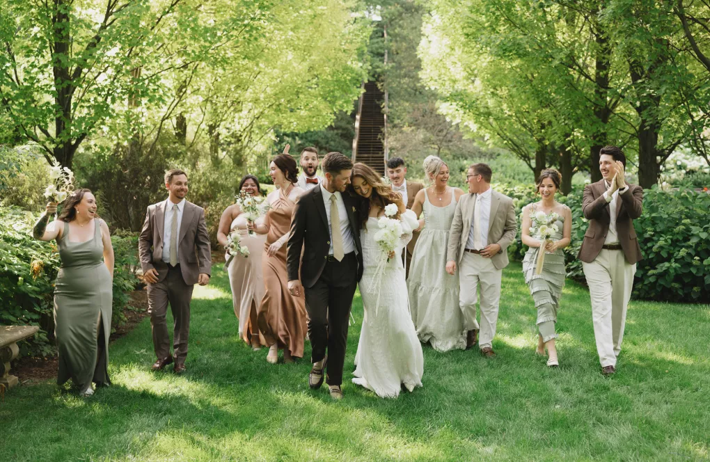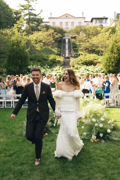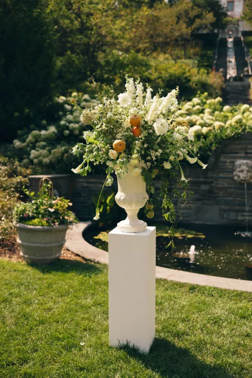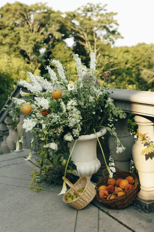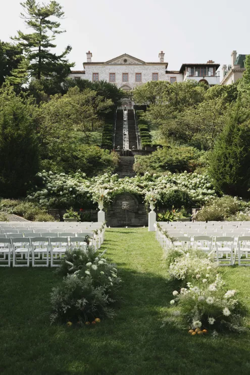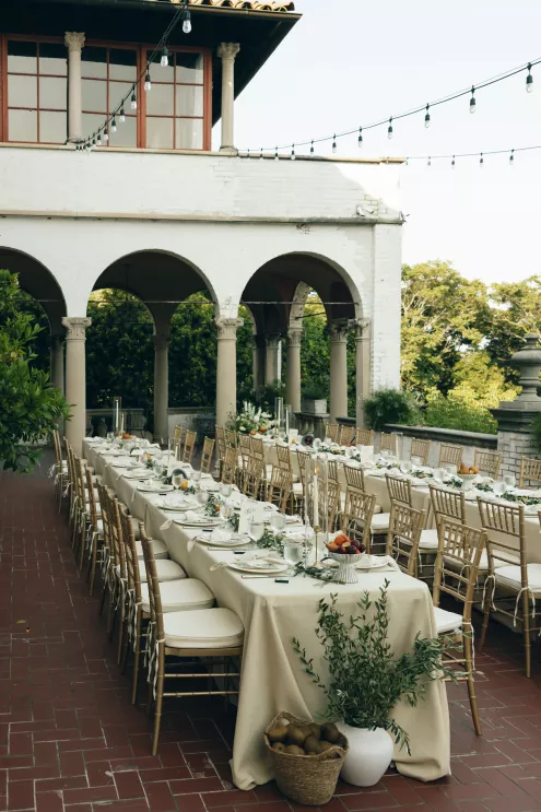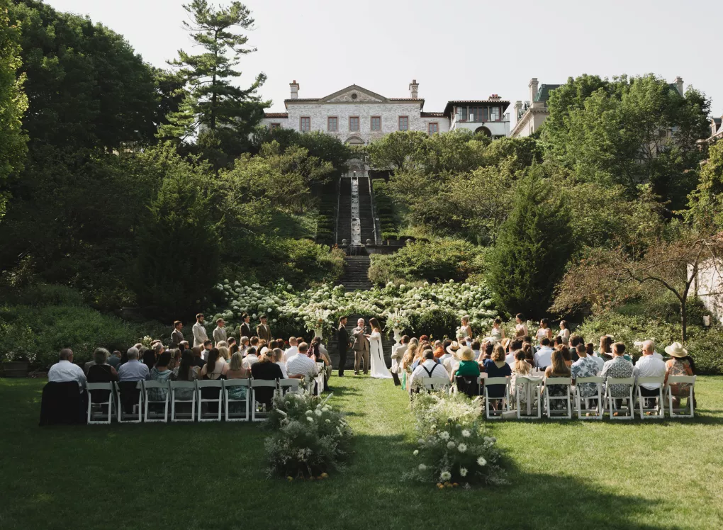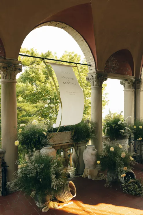 Kendall Ruchti and Andrew Ward’s celebration was a picture-perfect wedding day for a couple united by their love for architecture, art and design. Kendall, an interior designer, was set on visiting Villa Terrace Decorative Arts Museum in Milwaukee from the moment she learned about it, so Andrew, who also has a passion for architecture, knew their trip to the museum was the ideal time to propose. Two years later, it only made sense to return to the venue for their wedding. The house’s rich history and Italian-Renaissance design flawlessly matched the couple’s shared interests. Kendall and Andrew watched from the second floor of the villa as their guests arrived, feeling immeasurable gratitude for every person who attended the celebration. The ceremony took place in an enchanting, shady garden beneath the terrace in the sweet summer heat, and the couple exchanged vows in the exact same spot in the grassy lawn where Andrew had proposed two years prior. The reception unfolded up on the house’s terrace, where Kendall collaborated with M&F Floral + Décor to create the feeling of a European market with fruit baskets and lush greenery, taking inspiration from “Pride and Prejudice.” Bundles of olive branches complemented the villa’s architecture to create an Italian seaside feeling. Once night fell, the string lights draped over the terrace created a harmonious ambience as guests danced with stunning views of a moonlit Lake Michigan.