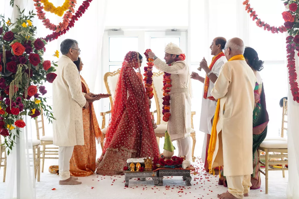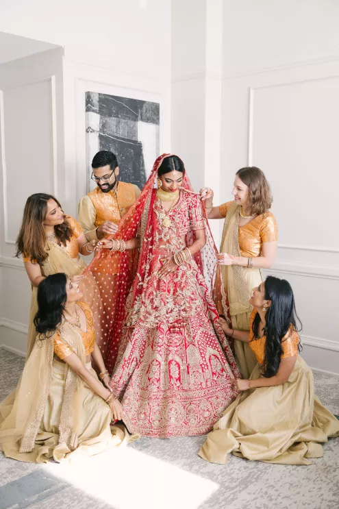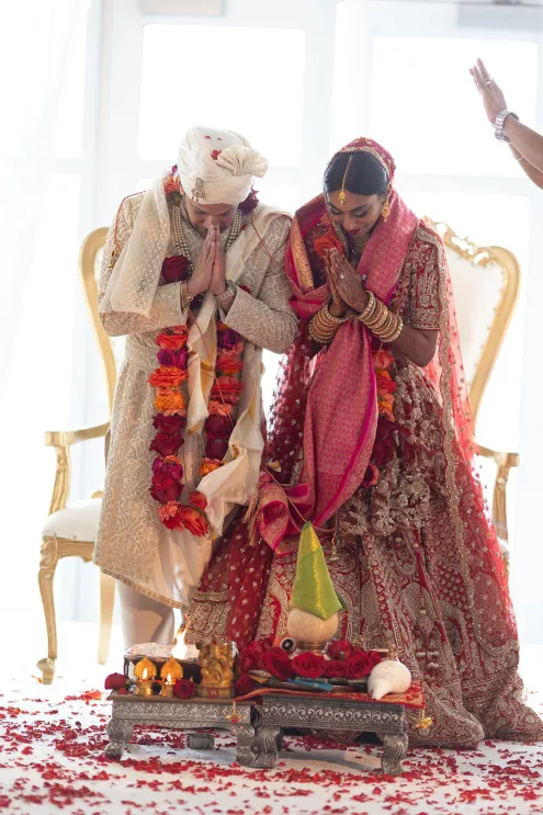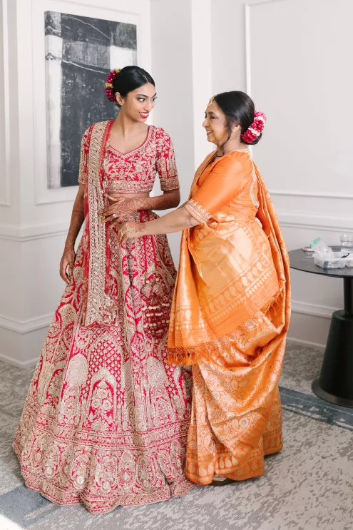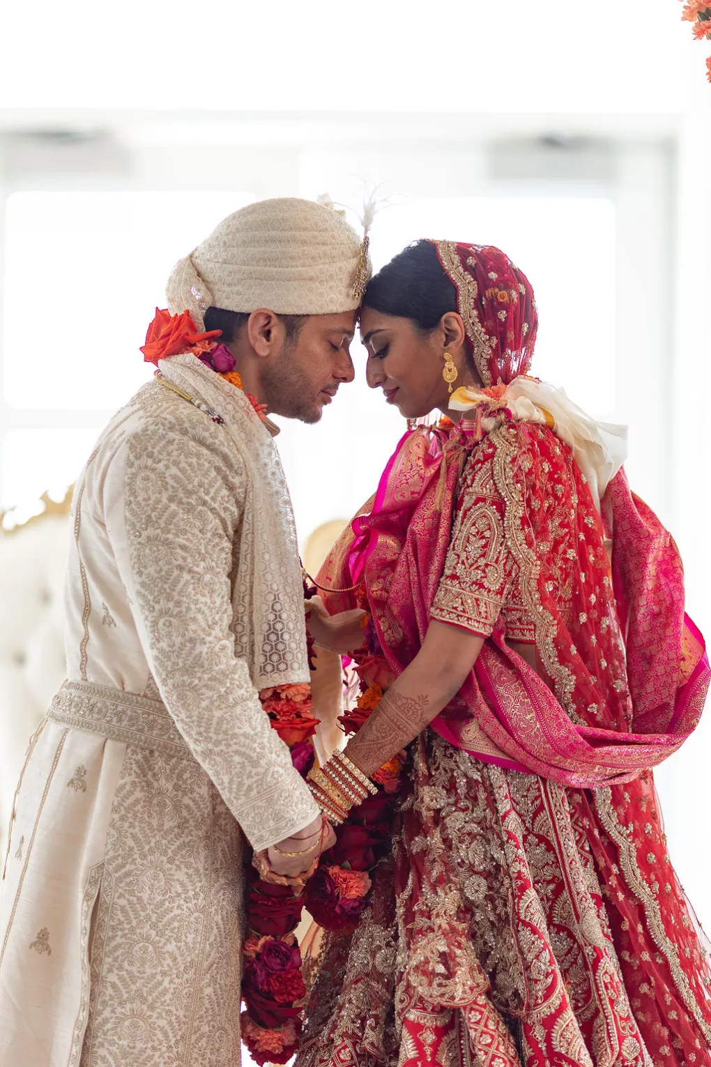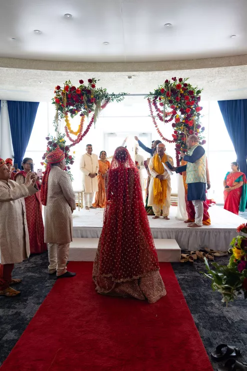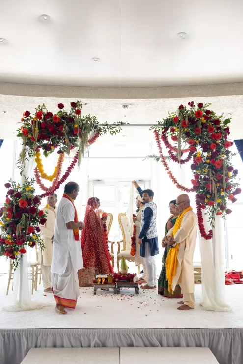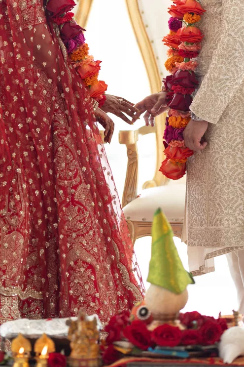 Namrata and Deep's wedding day overflowed with vibrant hues of red, orange and soft pink florals representing both sunrise and sunset