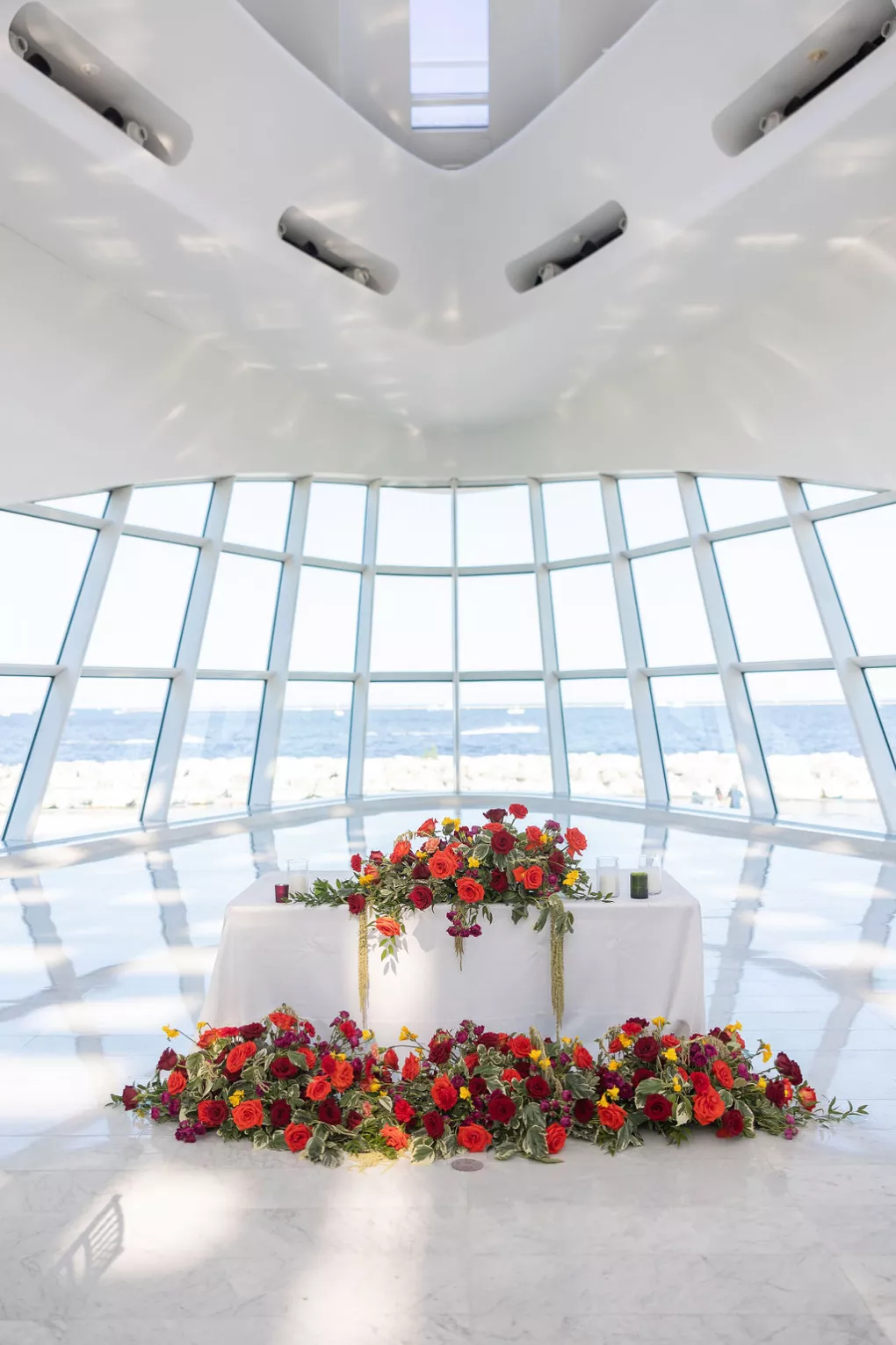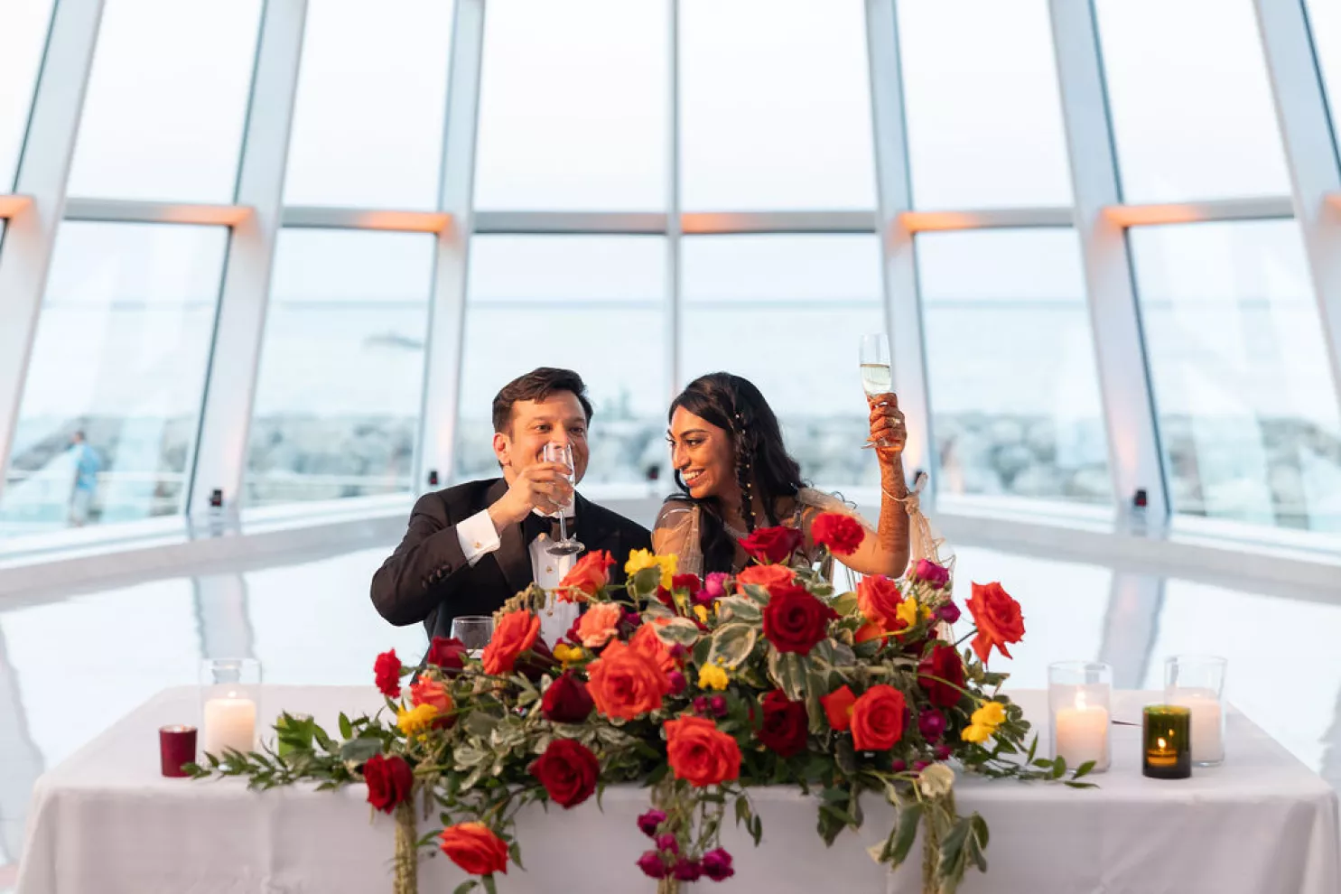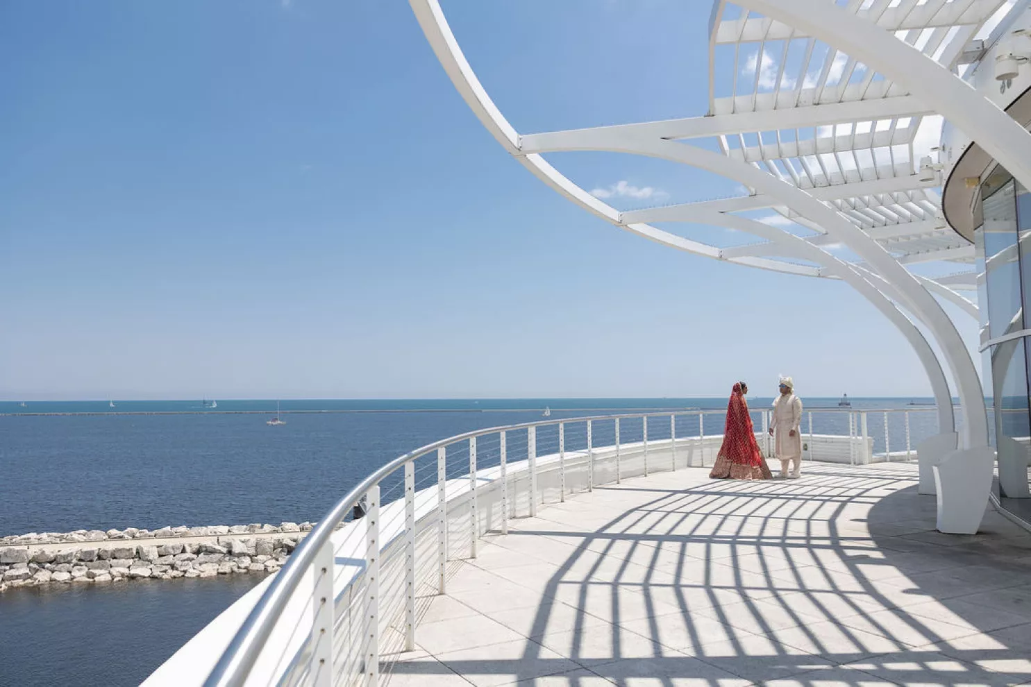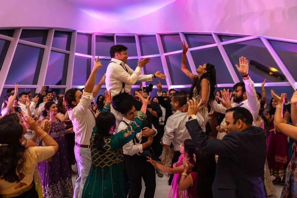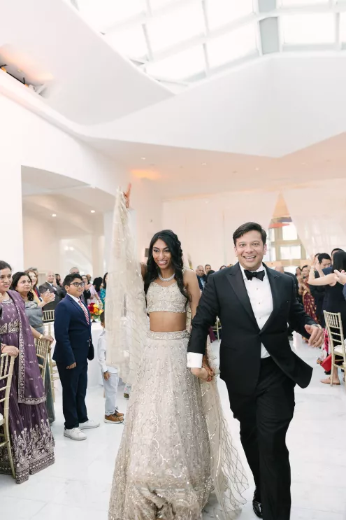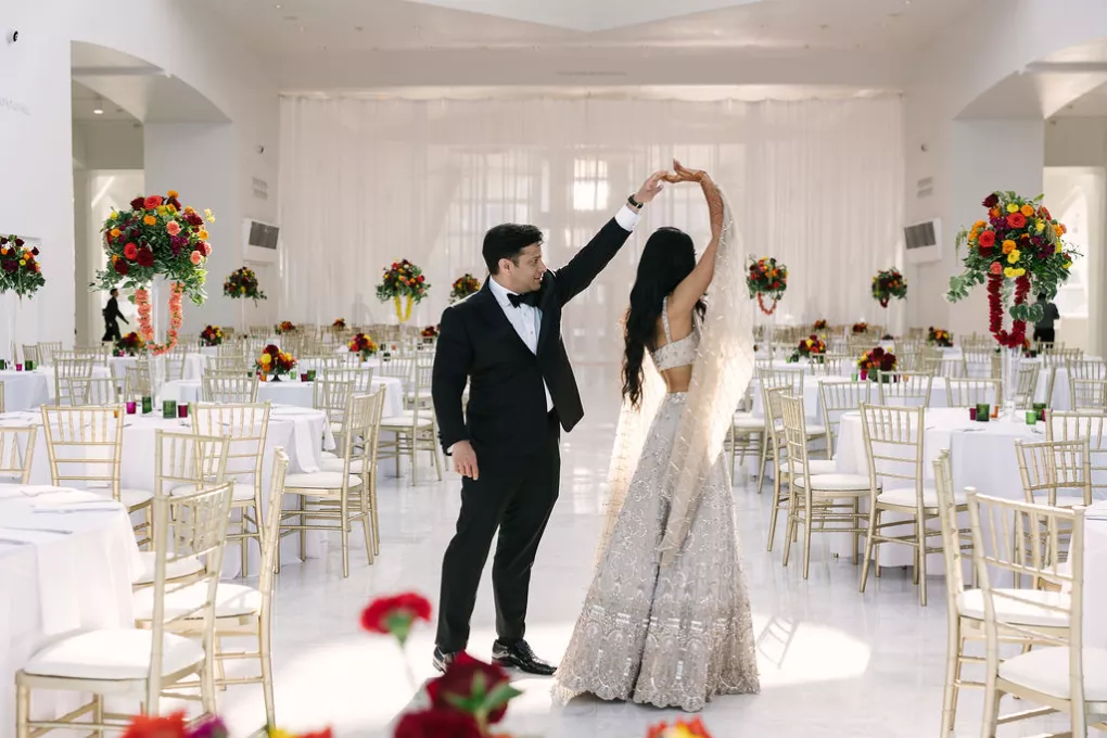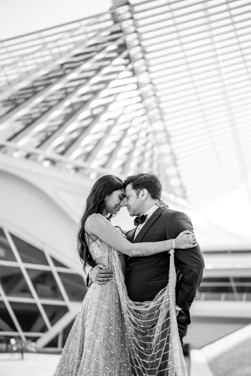 Southeastern Wisconsin native Namrata Shah wanted to showcase the best of her home while celebrating her marriage to Deep Bhatt. At the start of a daylong affair, the couple celebrated with a traditional ceremony at Discovery World, overlooking the bright blue of both sky and water on Lake Michigan. The bridal party’s outfits, sourced directly from India, further brought their culture to life by featuring vibrant hues of red, orange and soft pink florals representing both sunrise and sunset. The party continued with dinner, dancing and a cocktail hour magic show by Deep’s favorite magician at the Milwaukee Art Museum. The lively mix of modern architecture and traditional Indian culture made for a uniquely stunning evening full of fun, feasting and the first day of forever.