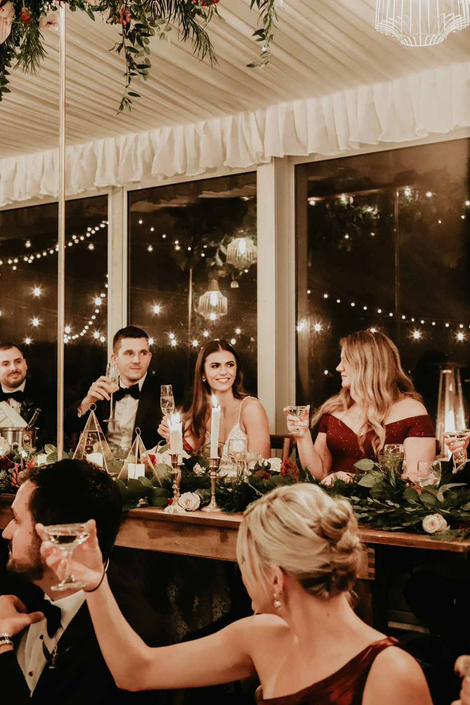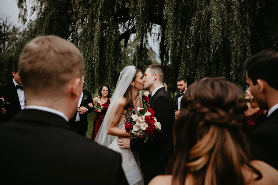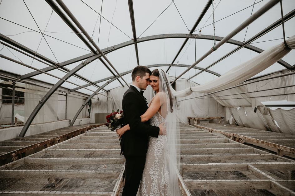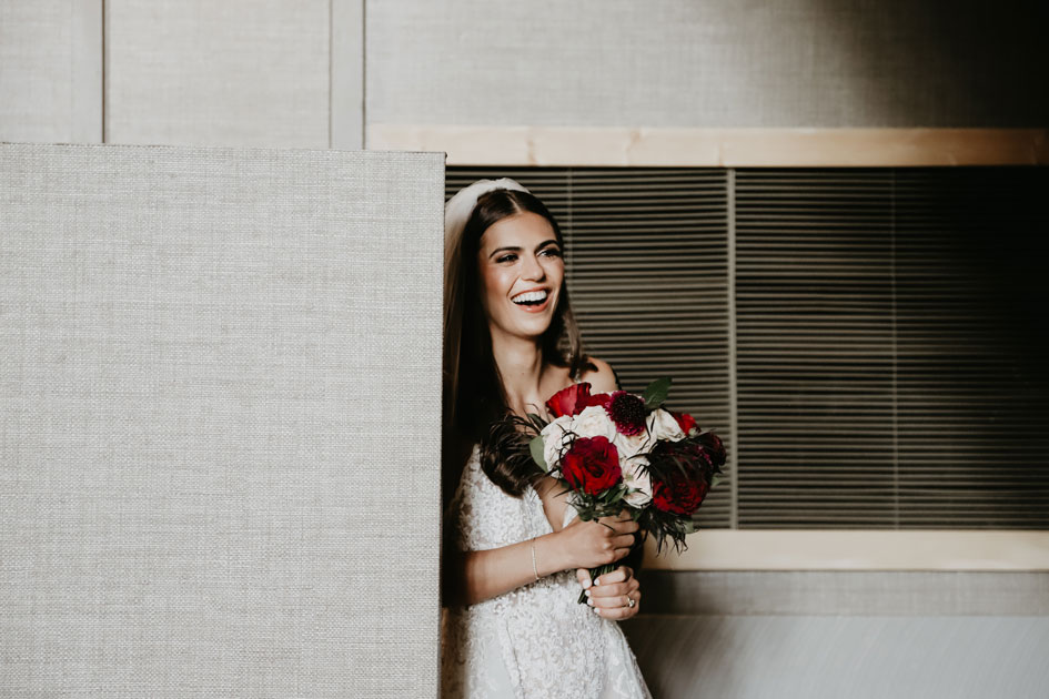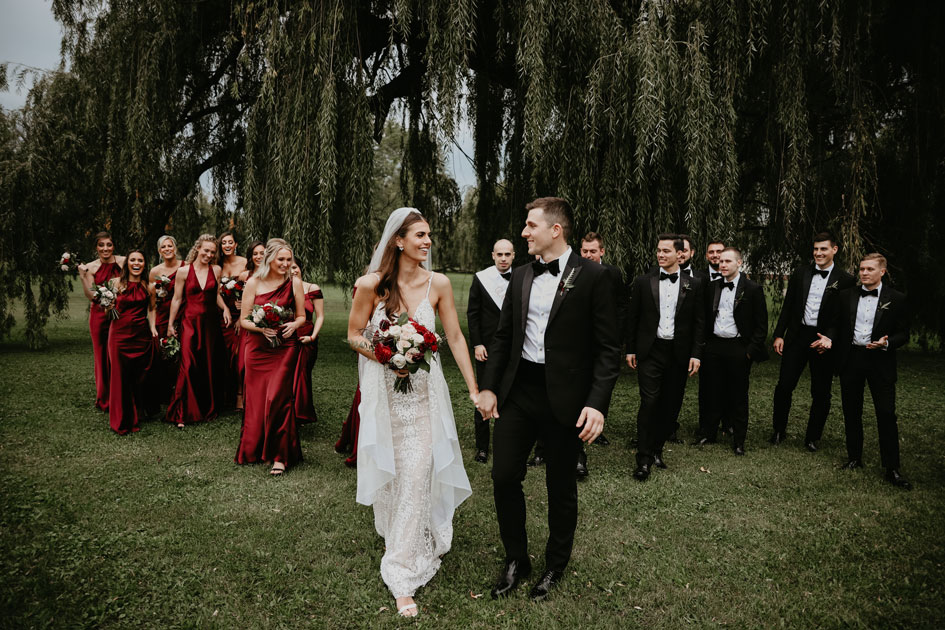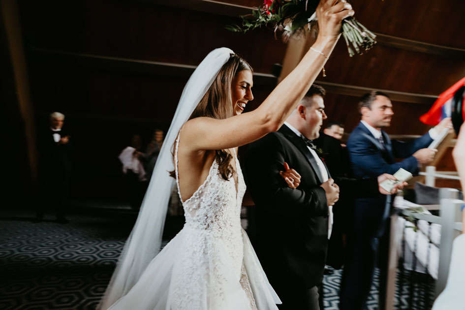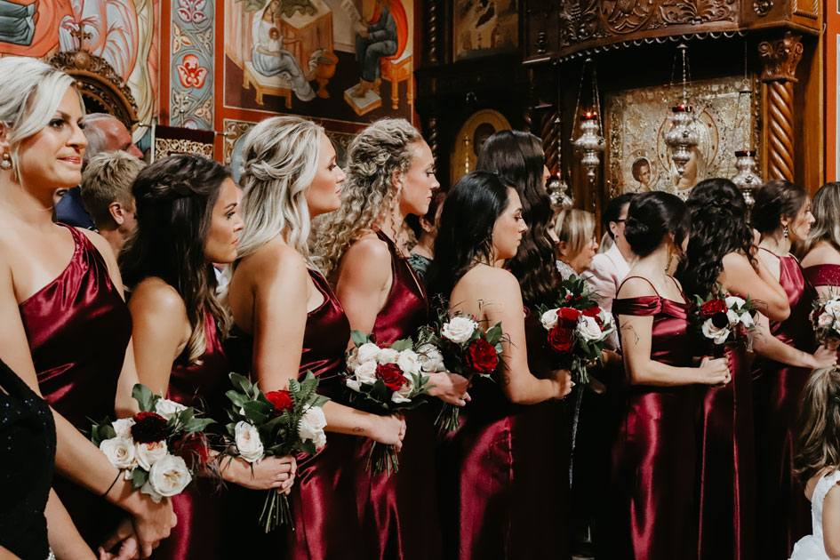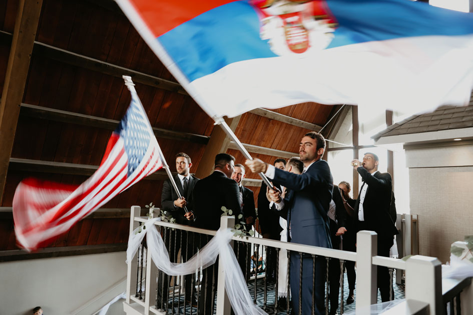 Demi and Aleks kept family tradition in mind while planning their wedding, and incorporated a full Serbian wedding ceremony. Rich reds and maroons played off green and ivory accents throughout the wedding decor. The large wedding party, family members and friends enjoyed a rich charcuterie display and partook in some traditional drinking as well during the cocktail hour. For the reception, guests were welcomed into a lush banquet hall bedecked with blooms from Willow Design. A vintage seating vignette by Forever Birdy added character and a brief respite from the lively dance floor.