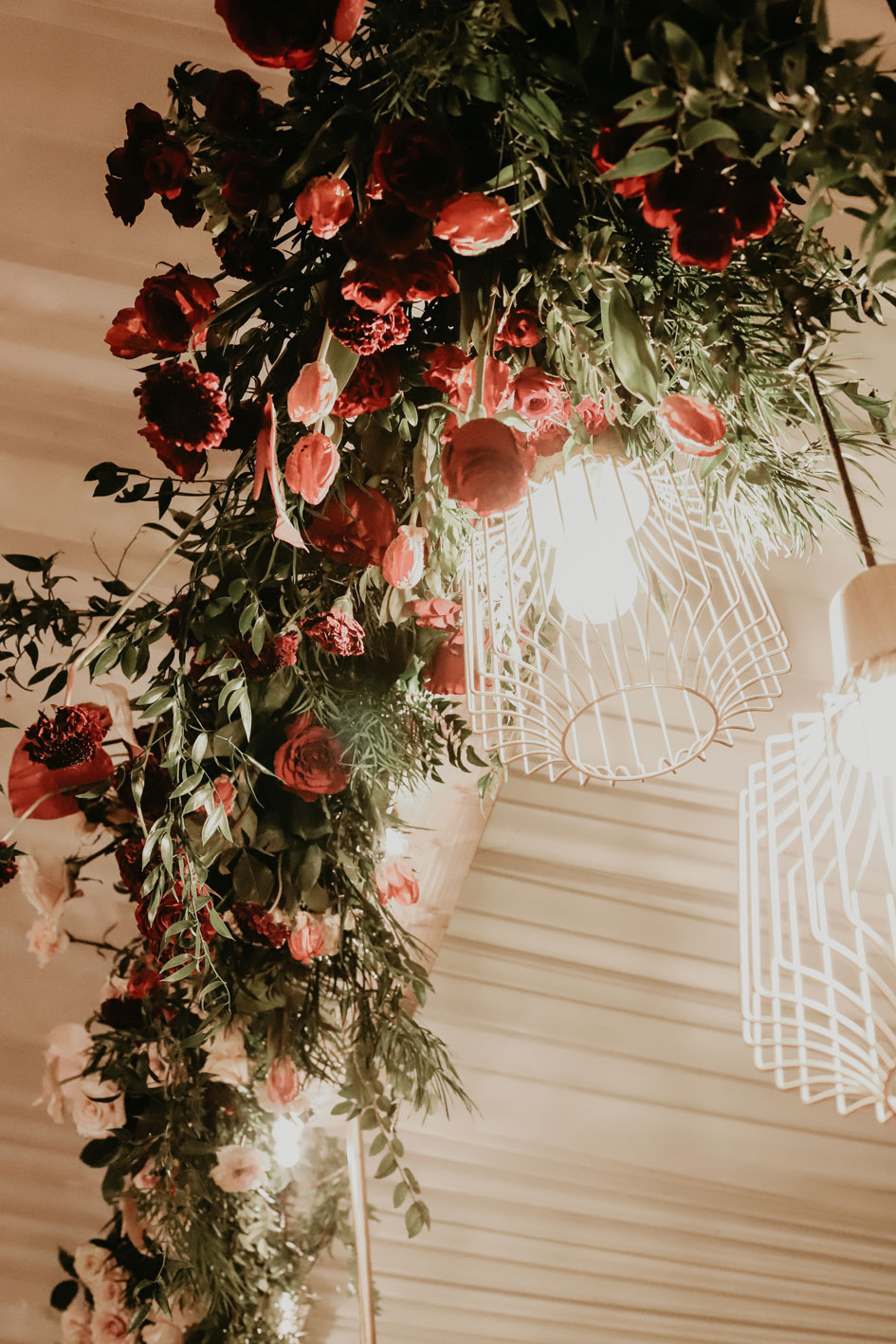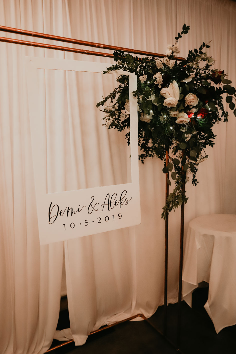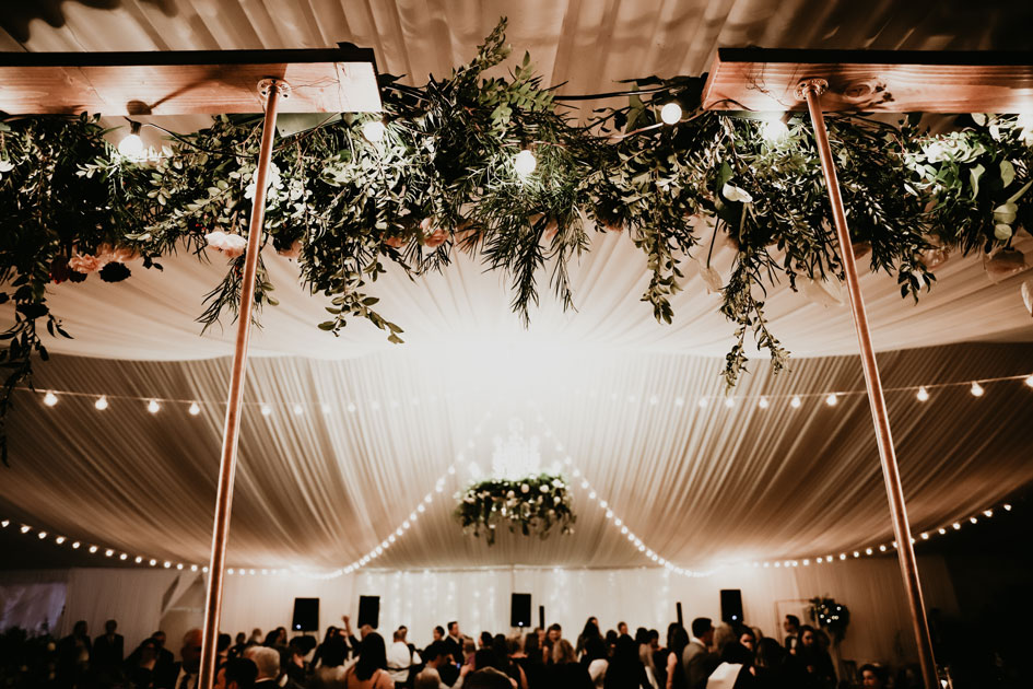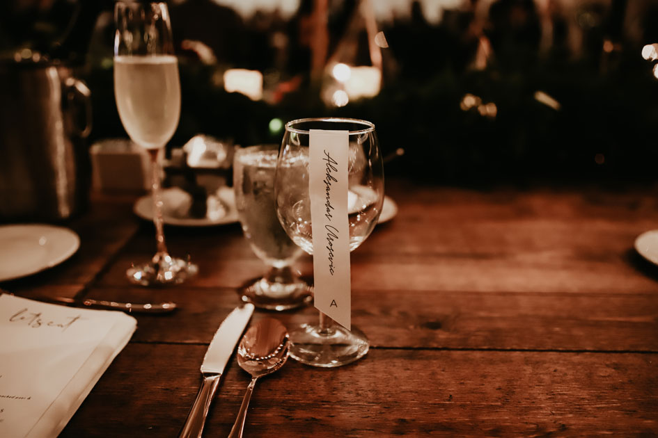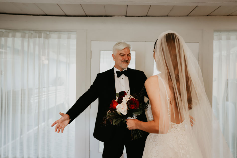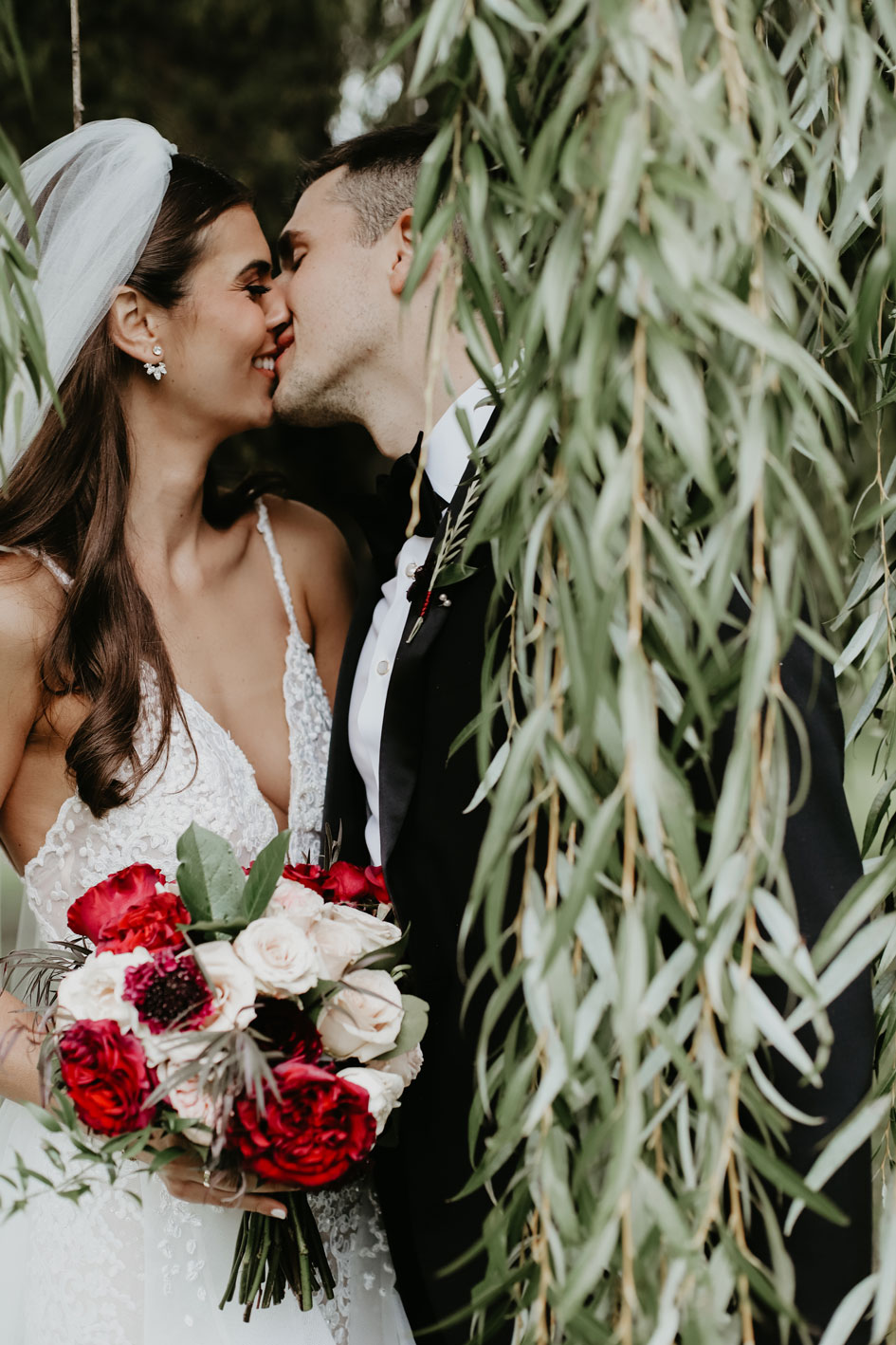 Demi and Aleks kept family tradition in mind while planning their wedding, and incorporated a full Serbian wedding ceremony. Rich reds and maroons played off green and ivory accents throughout the wedding decor. The large wedding party, family members and friends enjoyed a rich charcuterie display and partook in some traditional drinking as well during the cocktail hour. For the reception, guests were welcomed into a lush banquet hall bedecked with blooms from Willow Design. A vintage seating vignette by Forever Birdy added character and a brief respite from the lively dance floor.