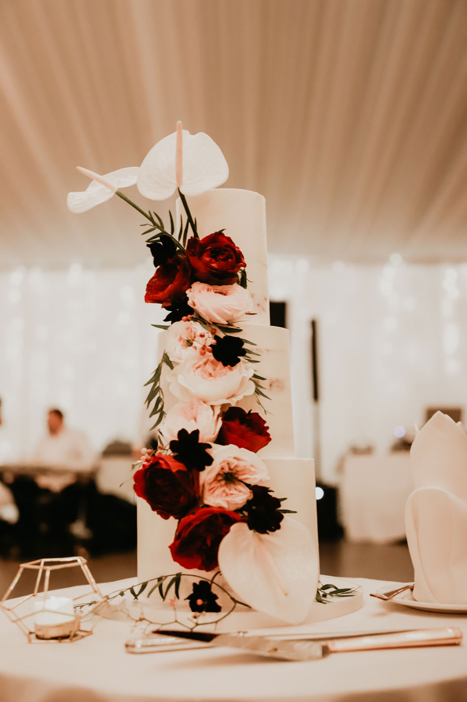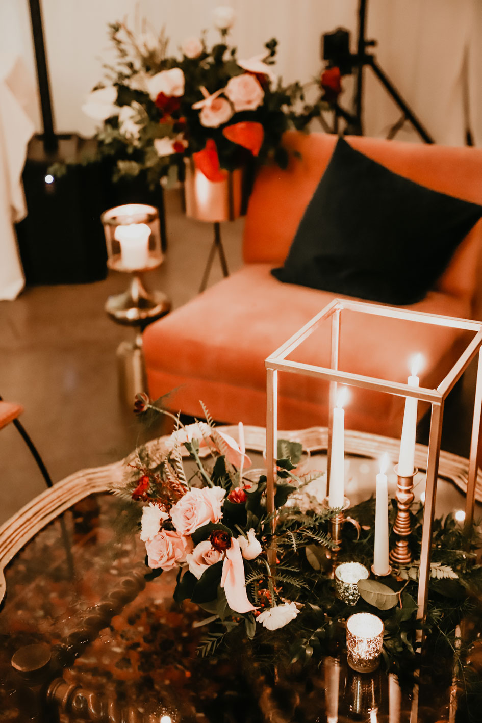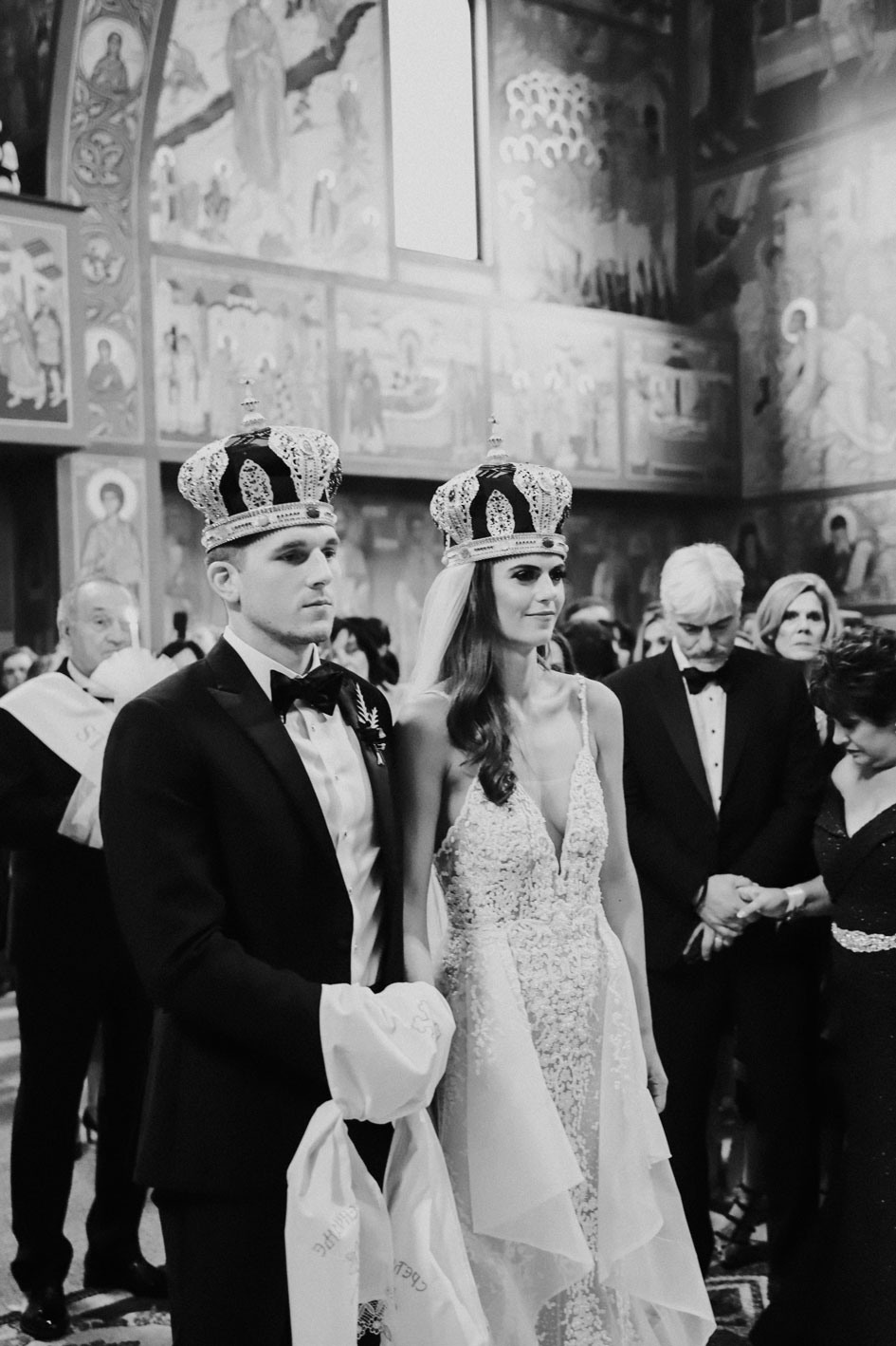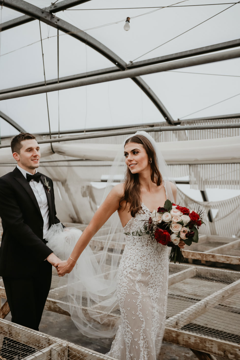 Demi and Aleks kept family tradition in mind while planning their wedding, and incorporated a full Serbian wedding ceremony. Rich reds and maroons played off green and ivory accents throughout the wedding decor. The large wedding party, family members and friends enjoyed a rich charcuterie display and partook in some traditional drinking as well during the cocktail hour. For the reception, guests were welcomed into a lush banquet hall bedecked with blooms from Willow Design. A vintage seating vignette by Forever Birdy added character and a brief respite from the lively dance floor.
