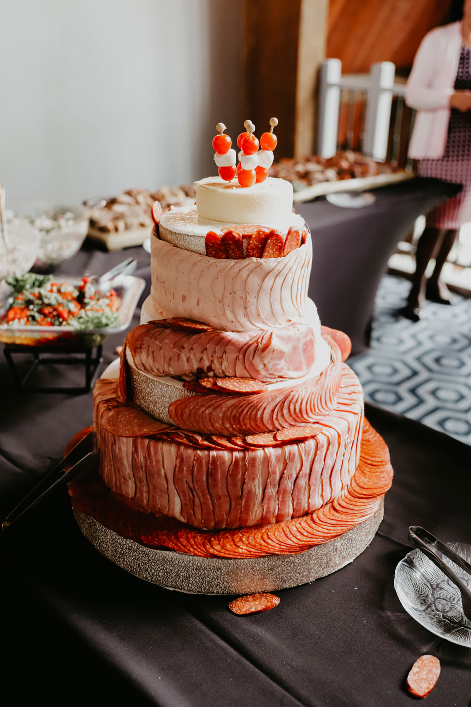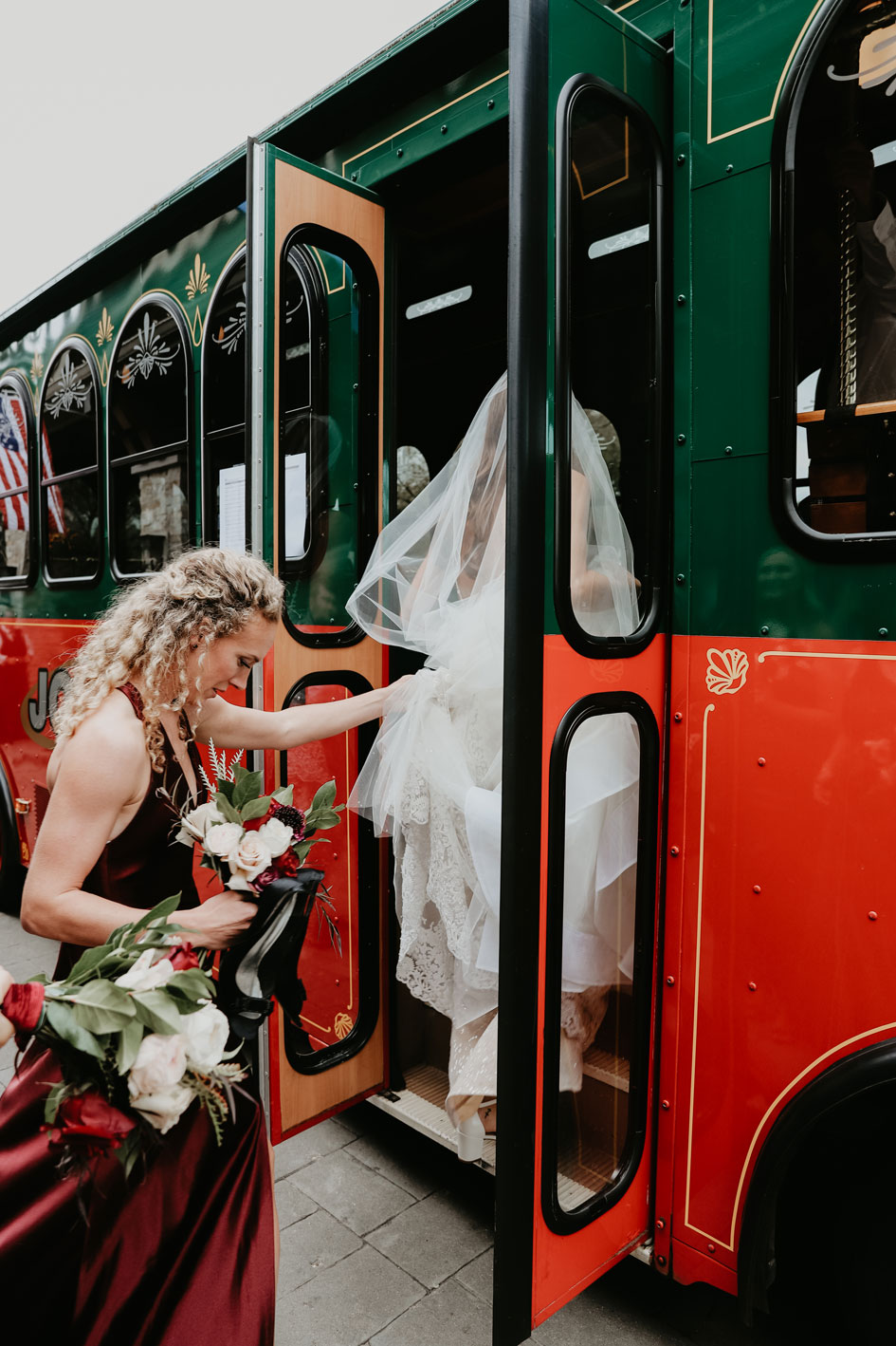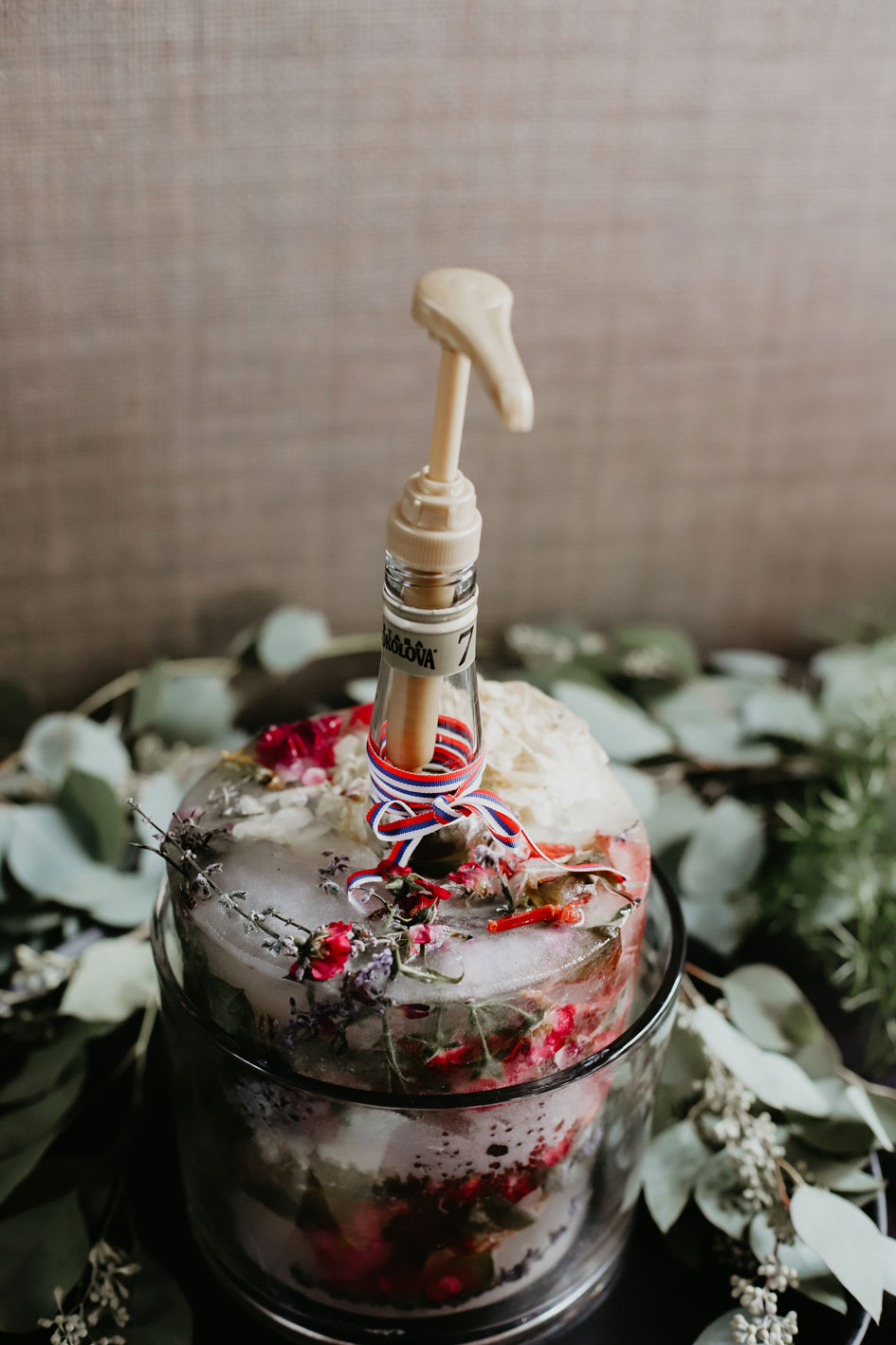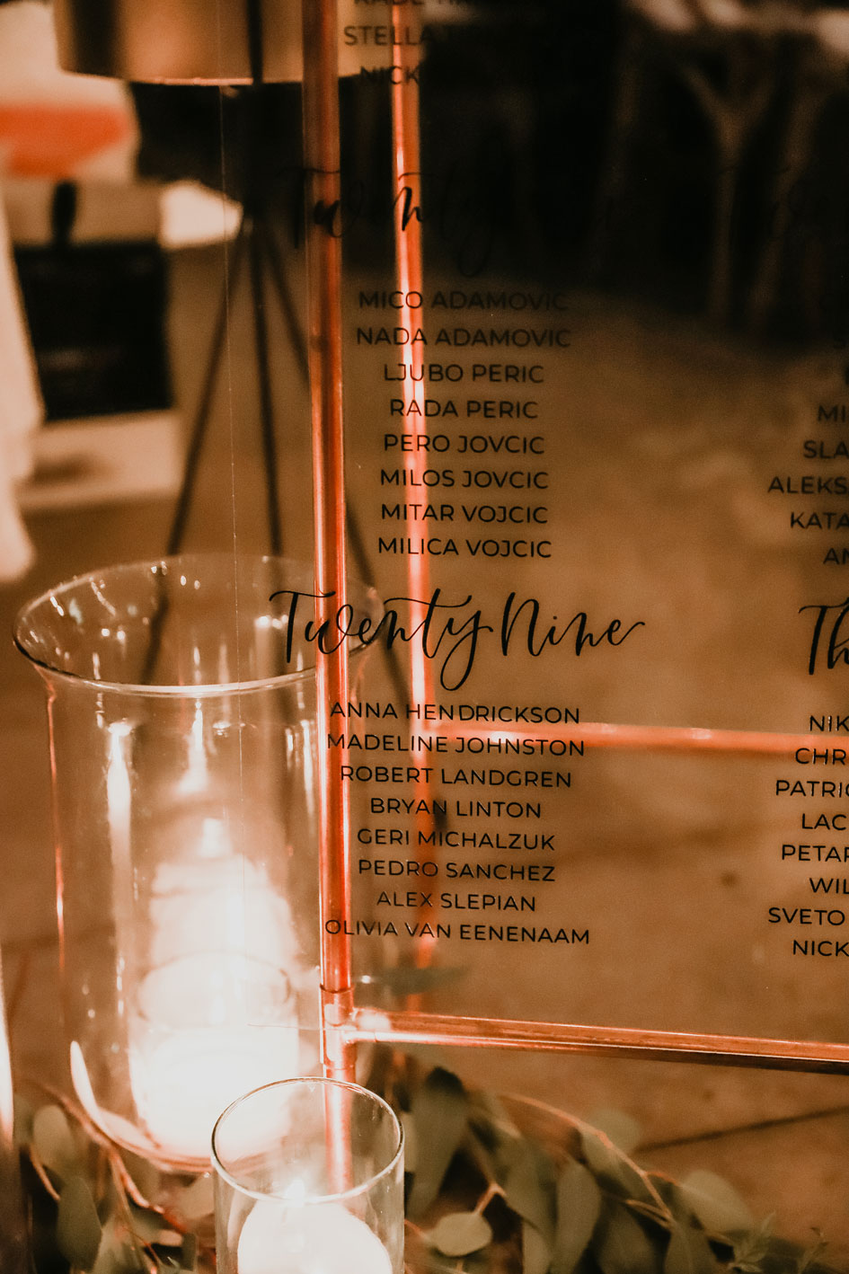 Demi and Aleks kept family tradition in mind while planning their wedding, and incorporated a full Serbian wedding ceremony. Rich reds and maroons played off green and ivory accents throughout the wedding decor. The large wedding party, family members and friends enjoyed a rich charcuterie display and partook in some traditional drinking as well during the cocktail hour. For the reception, guests were welcomed into a lush banquet hall bedecked with blooms from Willow Design. A vintage seating vignette by Forever Birdy added character and a brief respite from the lively dance floor.