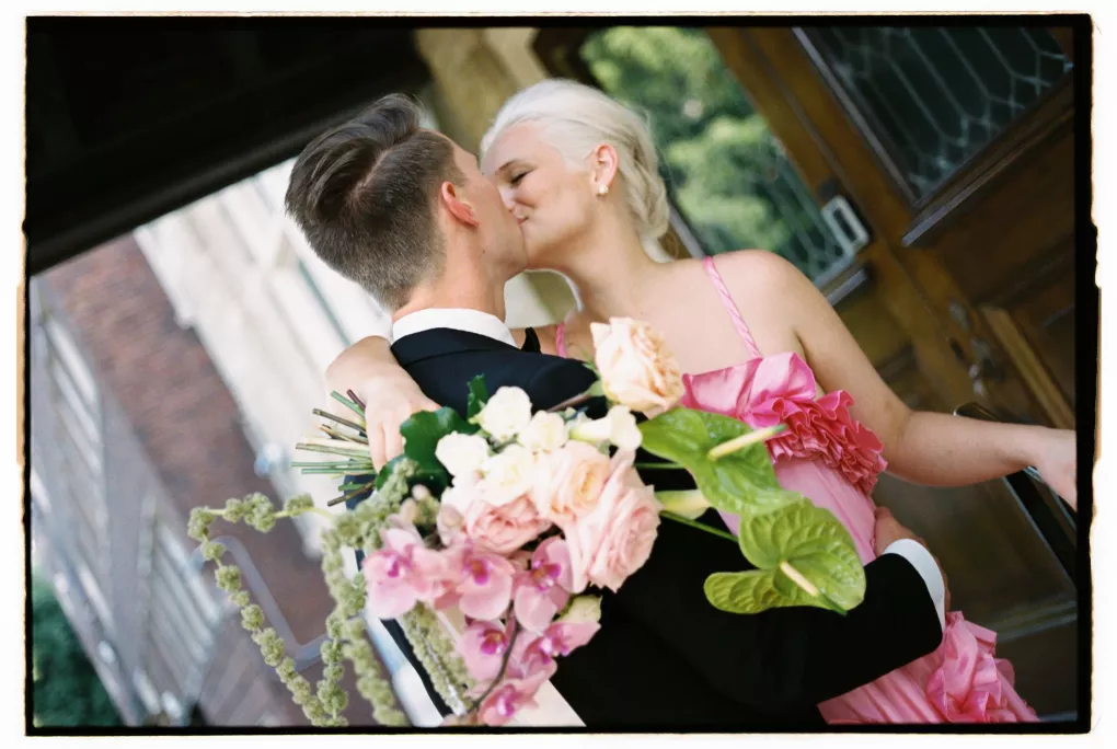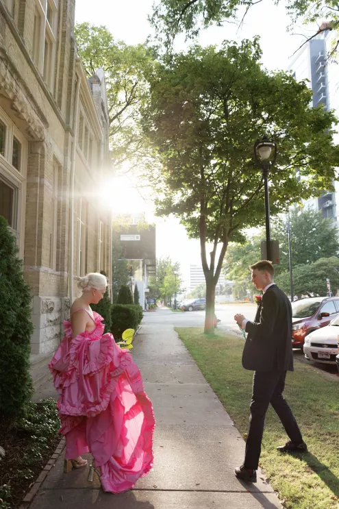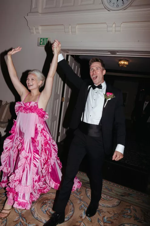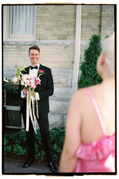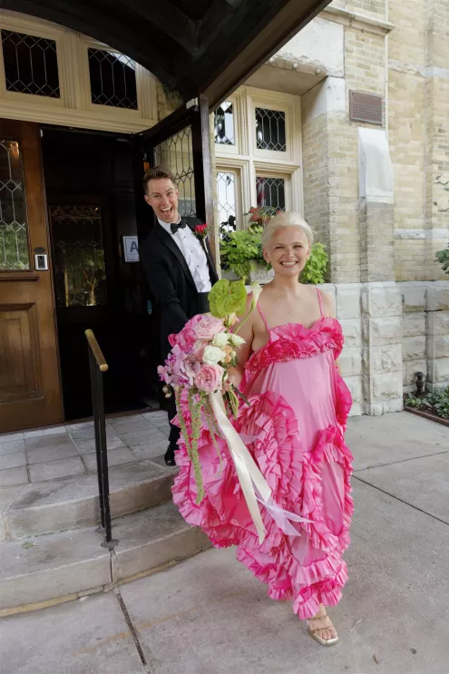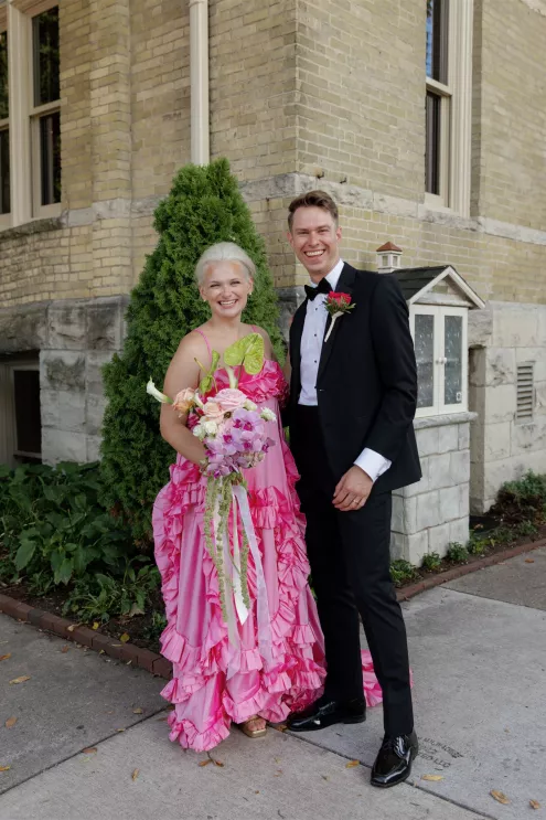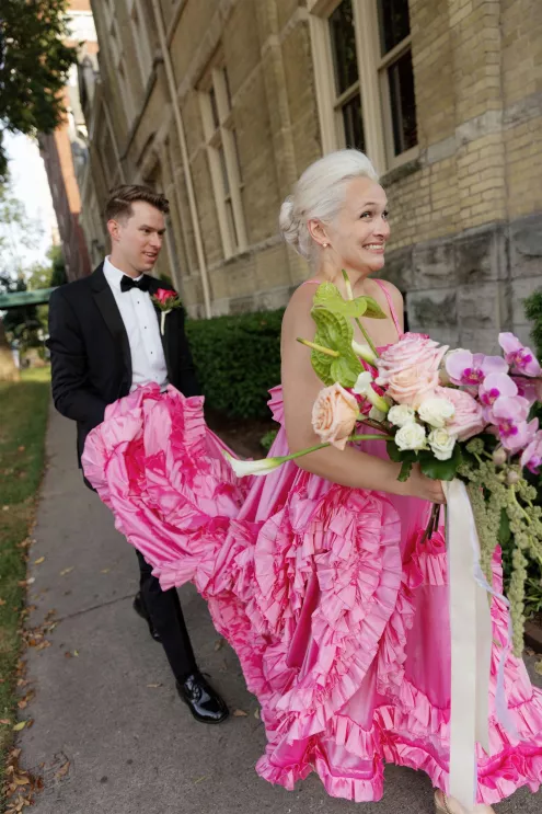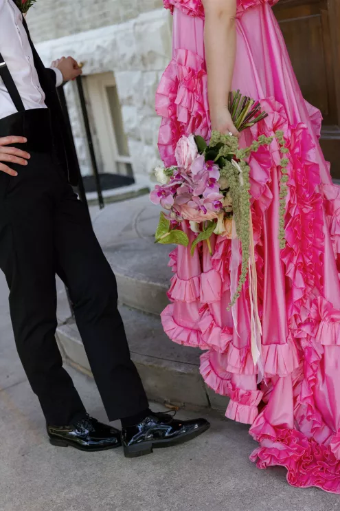 Just one week before the wedding, she completed her sustainable masterpiece. The result was a stunning spaghetti strap, square-neck fuchsia gown adorned with cascading ruffles that effortlessly complemented Corinn’s natural beauty. Contrasted against the vibrant botanicals featured in her bouquet and her platinum blond hair, Corinn’s unforgettable hand-crafted gown truly allowed her personality to shine: “I felt confident and, most importantly, like myself for our day.”