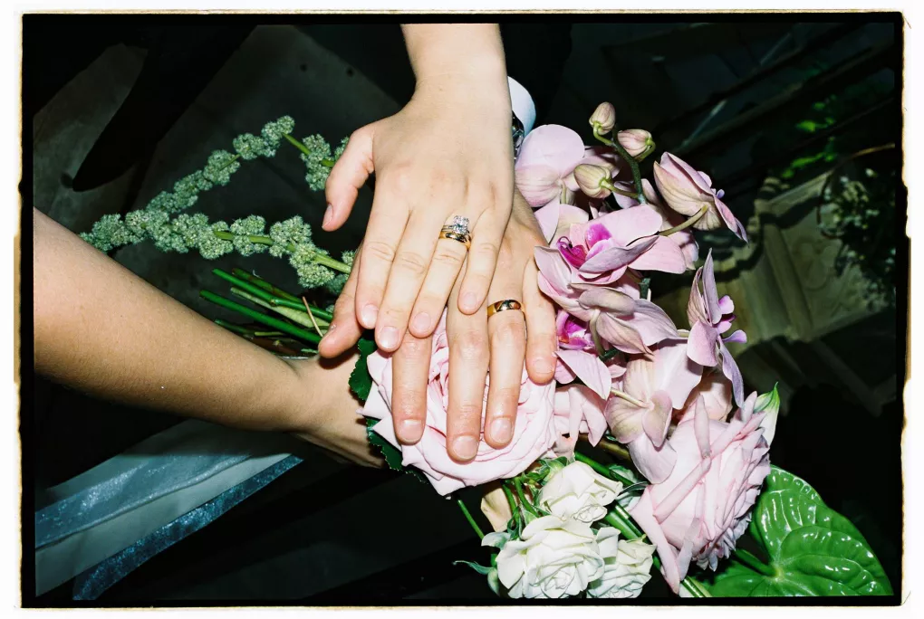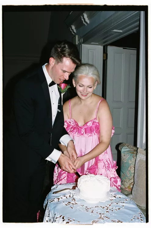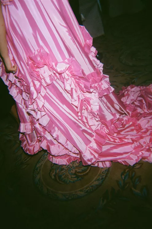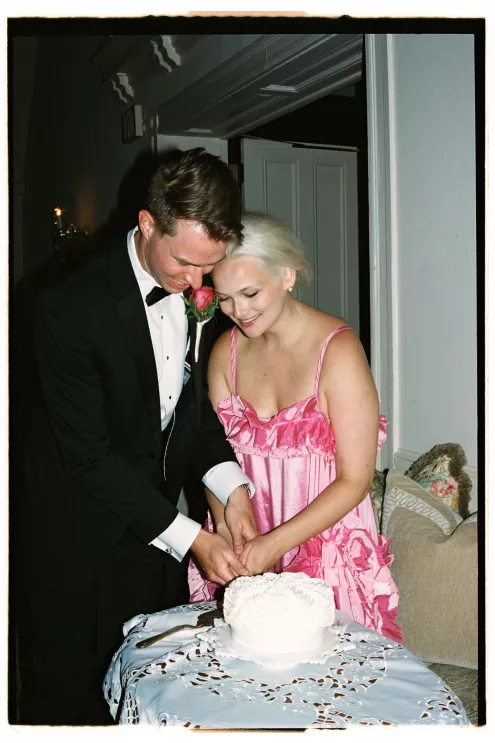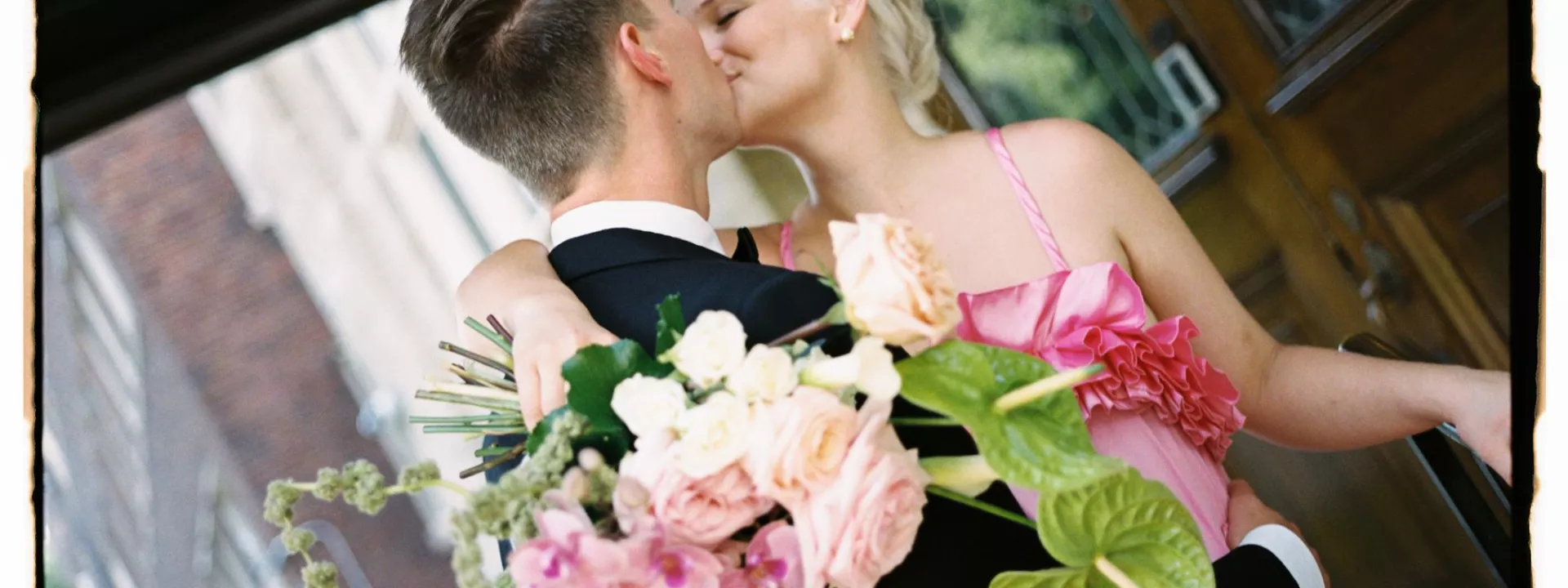 Just one week before the wedding, she completed her sustainable masterpiece. The result was a stunning spaghetti strap, square-neck fuchsia gown adorned with cascading ruffles that effortlessly complemented Corinn’s natural beauty. Contrasted against the vibrant botanicals featured in her bouquet and her platinum blond hair, Corinn’s unforgettable hand-crafted gown truly allowed her personality to shine: “I felt confident and, most importantly, like myself for our day.”