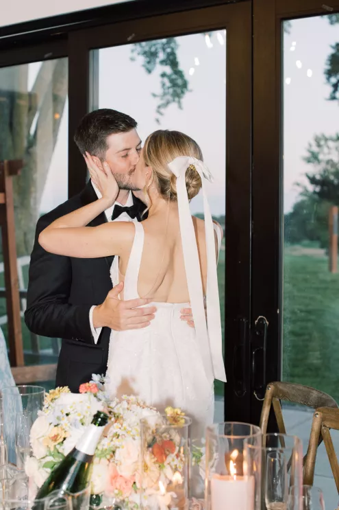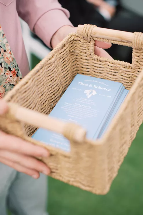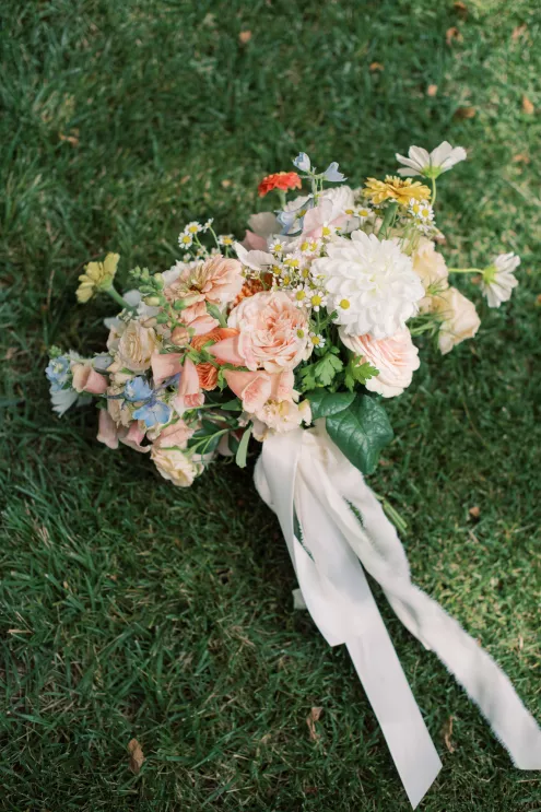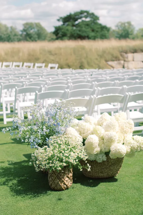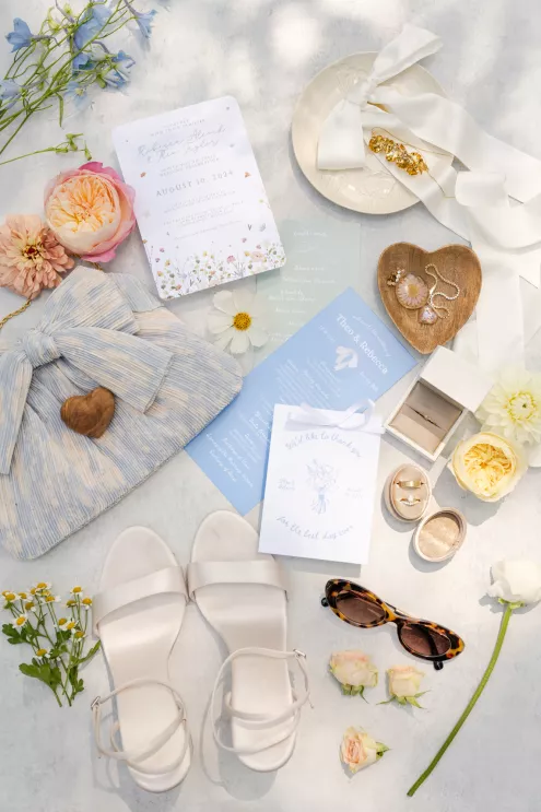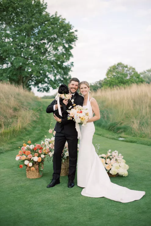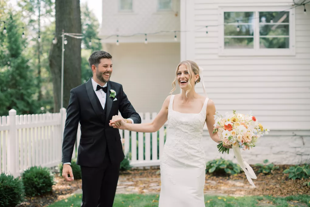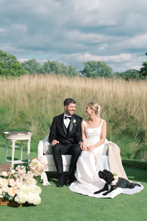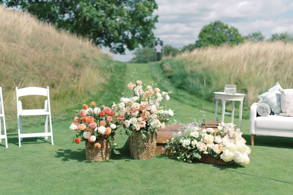 With an airy summer garden atmosphere and plenty of custom features, Rebecca Alcock and Theo Taylor’s wedding proved that experimenting with unique ideas can make any dream wedding come true. Conceptualized by the bride, the celebration replicated the feeling of a cheery summer picnic, with plenty of pale green, pink and peach hues throughout the design. The fresh flowers were thoughtfully placed in wicker baskets throughout the outdoor space. Hydrangeas, zinnias, roses and daisies from Sage Floral created colorful accents to the lush lawn. The Carriage House at Lac La Belle was the perfect venue choice, with enchanting tea lights and flawless natural surroundings that felt like a fairy tale. Sunshine kissed the entire scene, highlighting the vivid and verdant countryside. Every choice was intentional and created a wholly unique experience, like when they pressed flowers together as a unity ceremony with lovely cello music in the background. The couple signed their marriage license on each other’s backs during the ceremony, and two guests were surprised with the opportunity to serve as official witnesses – each guest looked under their chair after arriving, where the two lucky people received a present. Other special features included a mini canoe paddle that served as the guestbook and a loveseat Rebecca and Theo shared during the ceremony. The pair didn’t hesitate to push boundaries while planning, and the result was a whimsical day of festivities that could not have better met their desires and imagination.