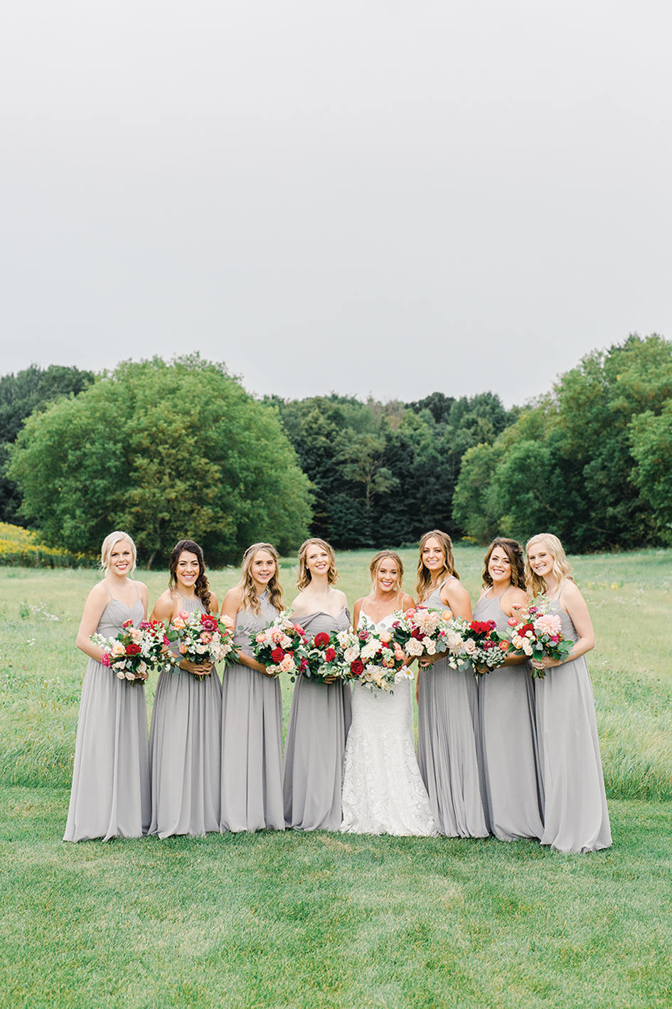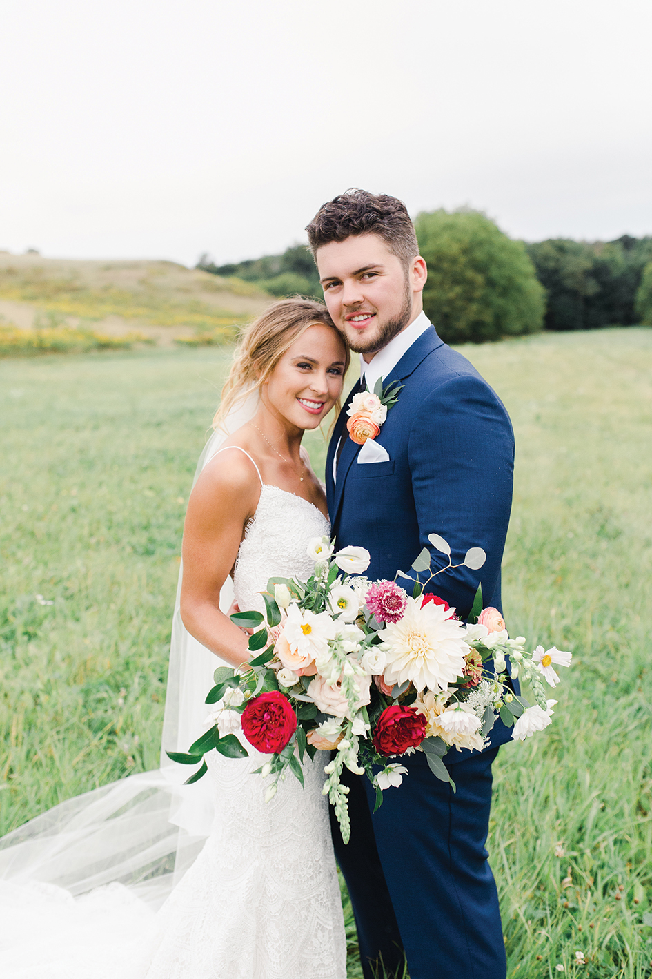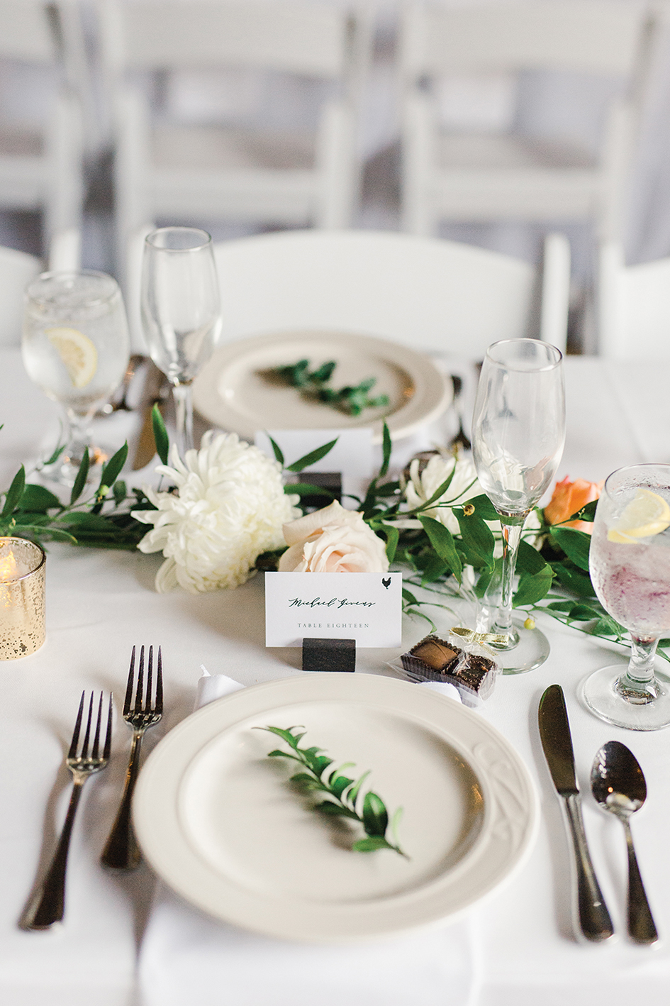 The peace and intimacy of Birch Hill Barn made their venue choice an easy one, and personal touches—such as chocolates for their guests from Knoke’s Chocolate in Hudson, the same kind that Ariez would put in Elise’s backpack to surprise her—made the day even more special. Elise credits Studio Fleurette for the boho chic vibe she sought in the décor, using “flowers and more flowers,” glass votives, delicate linens and chandeliers, with greenery, vines and loose flowers strewn across the reception tables.
