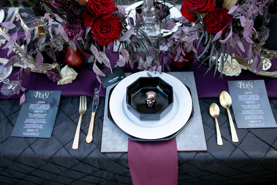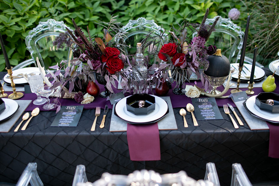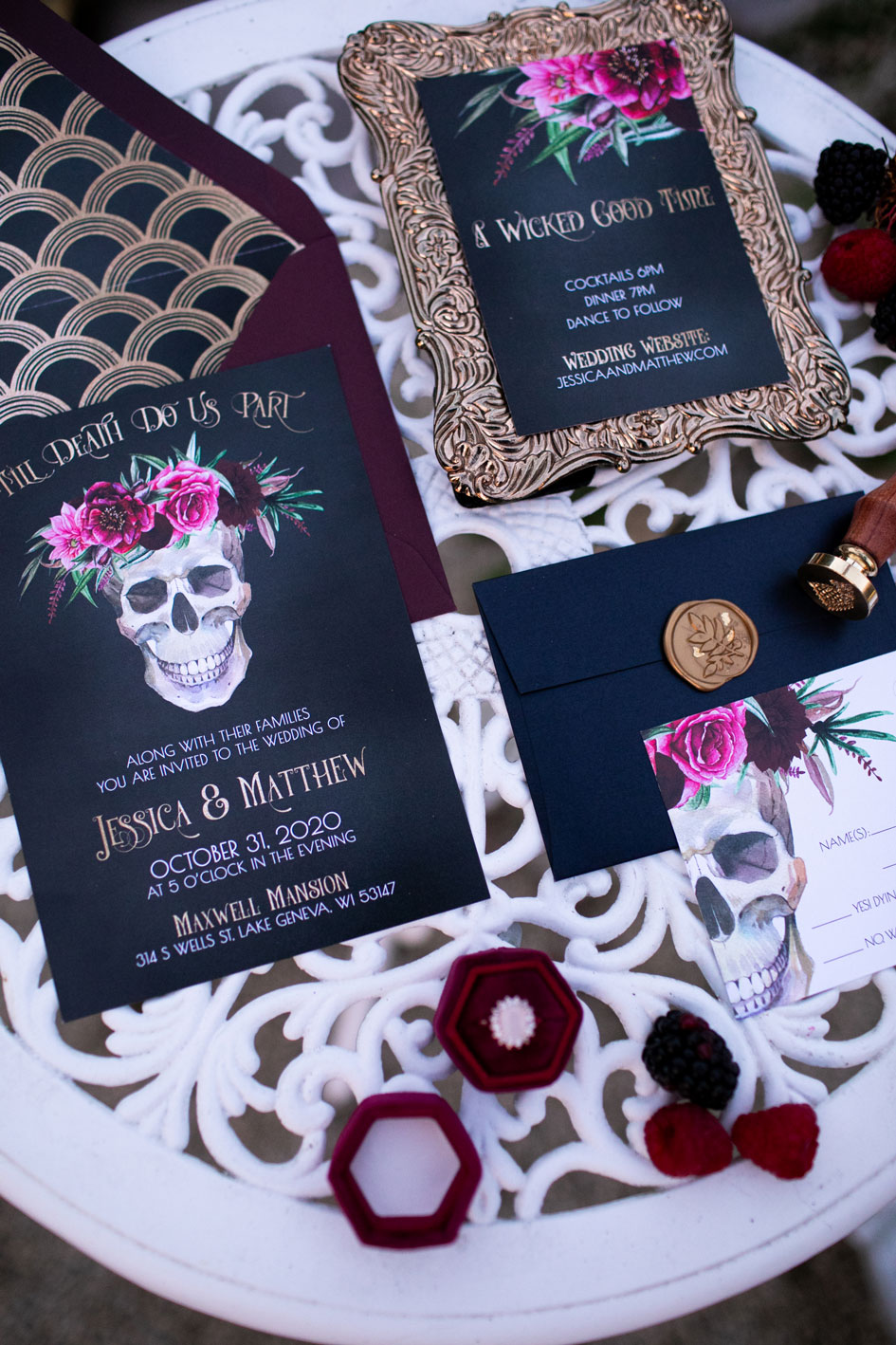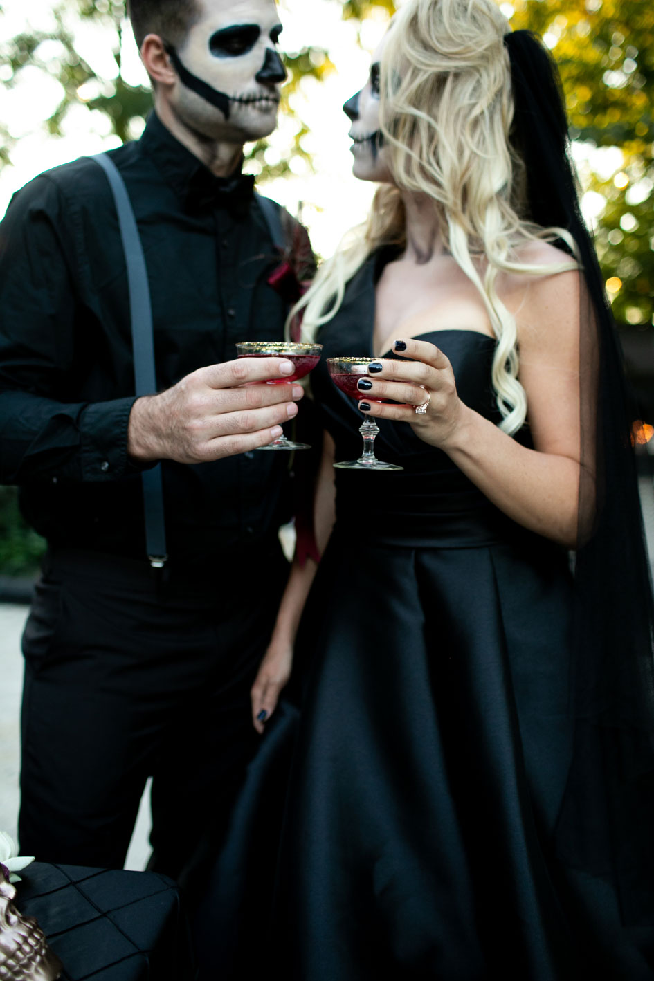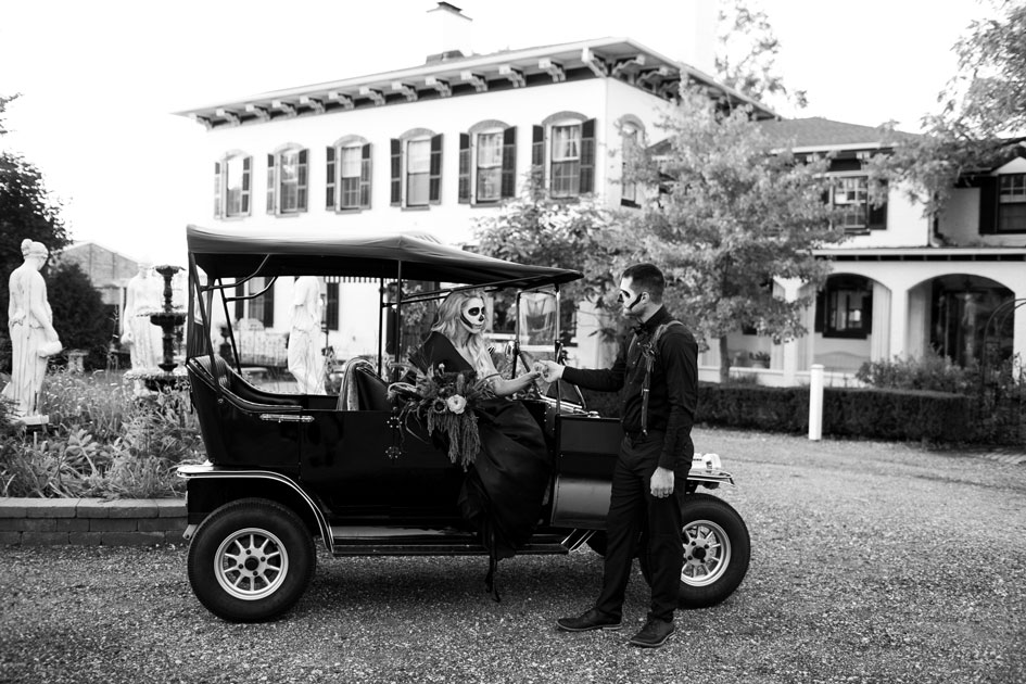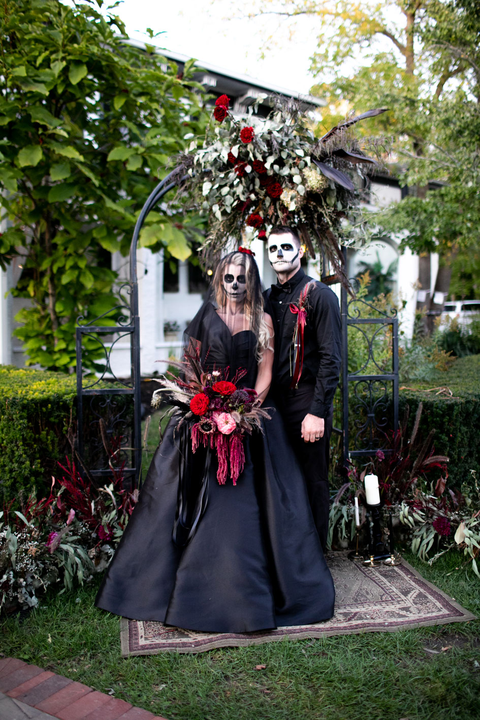 Photographer Elyse Bullard couldn't wait for the Halloween season to begin, so she got in touch with a few local vendors and began pulling together a haunted styled shoot. The history at Maxwell Mansion inspired a 1920's themed shoot for the beginning of the day, with the bride in a lacy sleeveless gown and carrying a rich red and maroon bouquet. As the sun went down, things began to change. The couple transformed into skeletal beings in black attire and toasted one another with blood-red goblets. Gold, maroon and deep purple accents glittered from the table where a black cake dripped with fruit. At the end of the evening, a vintage motorcoach arrived to whisk the couple back to the underworld.