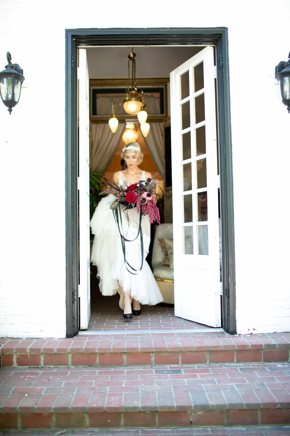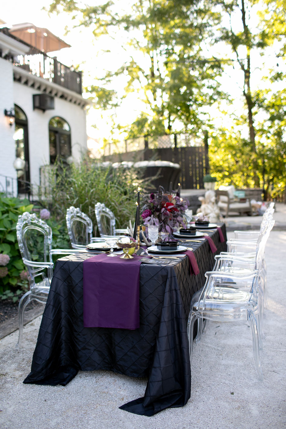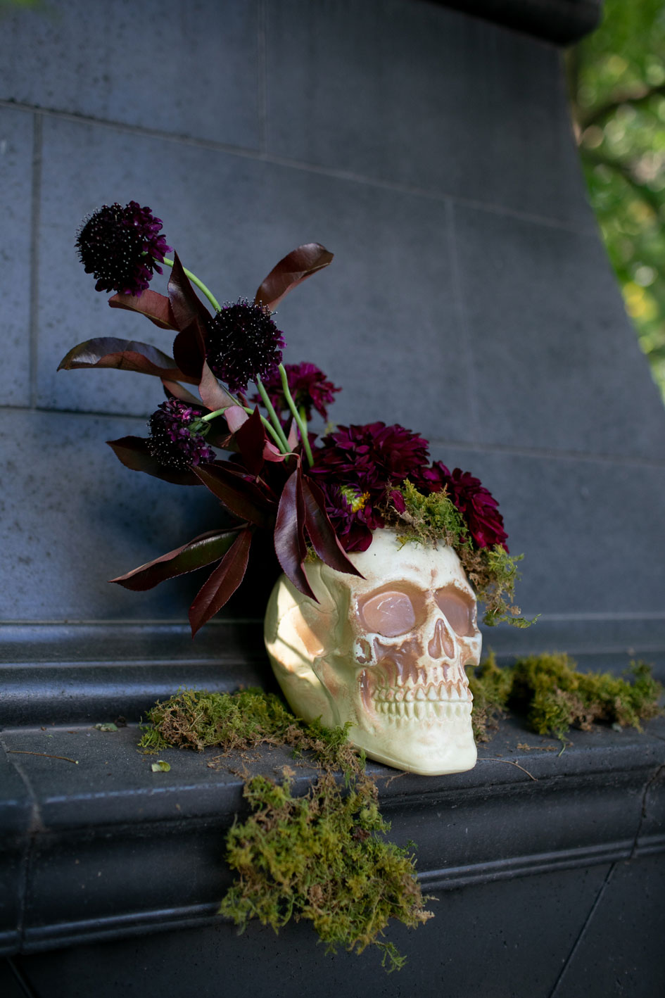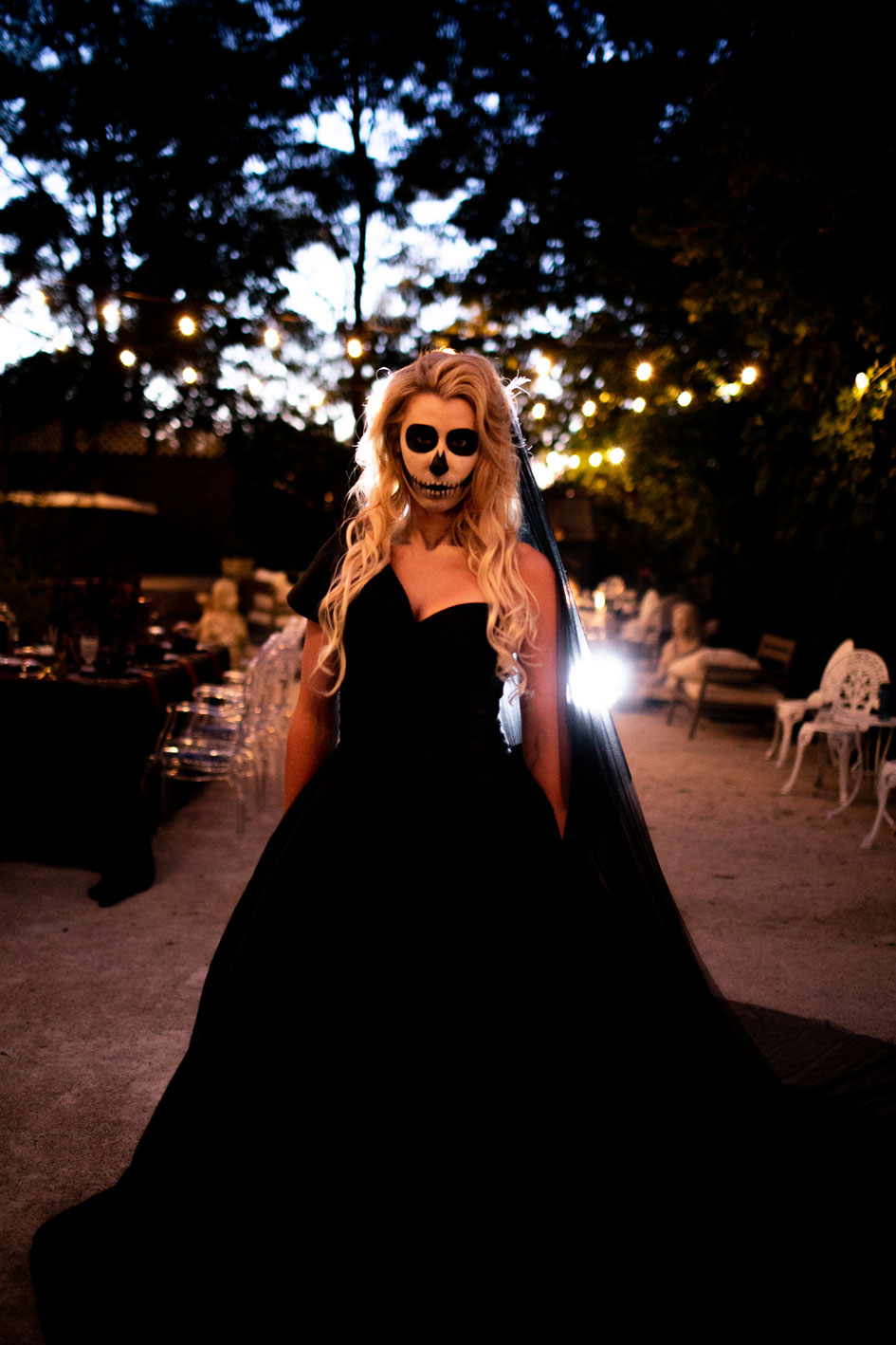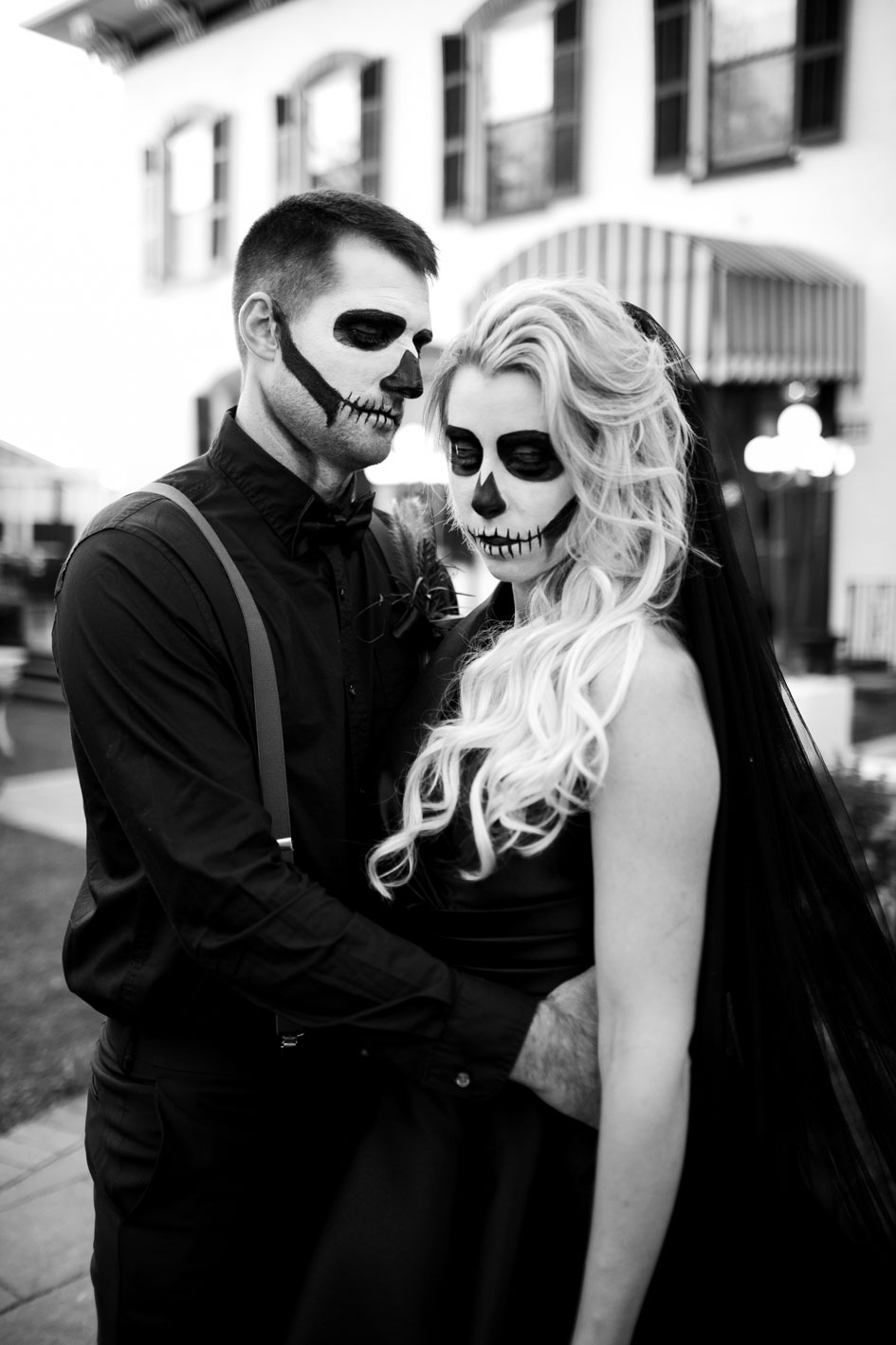 Photographer Elyse Bullard couldn't wait for the Halloween season to begin, so she got in touch with a few local vendors and began pulling together a haunted styled shoot. The history at Maxwell Mansion inspired a 1920's themed shoot for the beginning of the day, with the bride in a lacy sleeveless gown and carrying a rich red and maroon bouquet. As the sun went down, things began to change. The couple transformed into skeletal beings in black attire and toasted one another with blood-red goblets. Gold, maroon and deep purple accents glittered from the table where a black cake dripped with fruit. At the end of the evening, a vintage motorcoach arrived to whisk the couple back to the underworld.