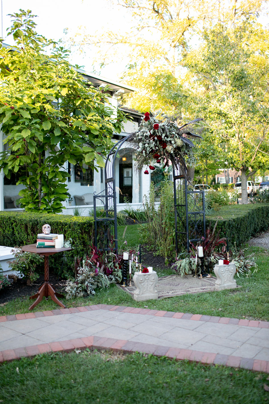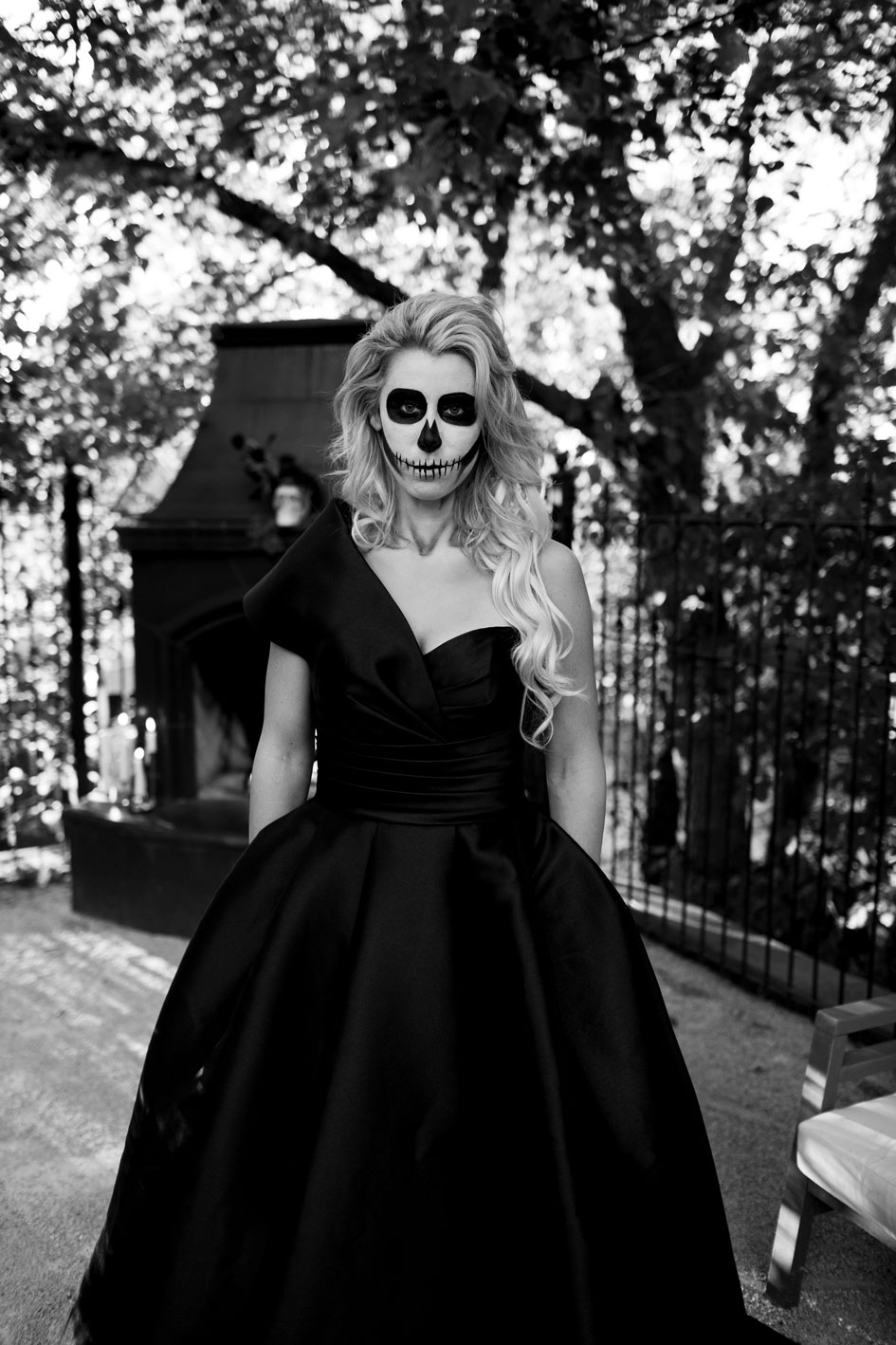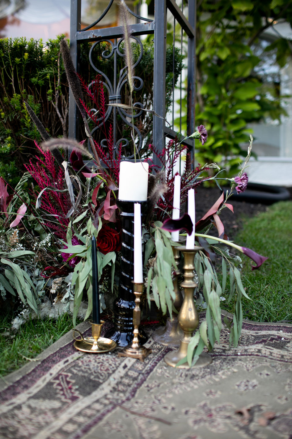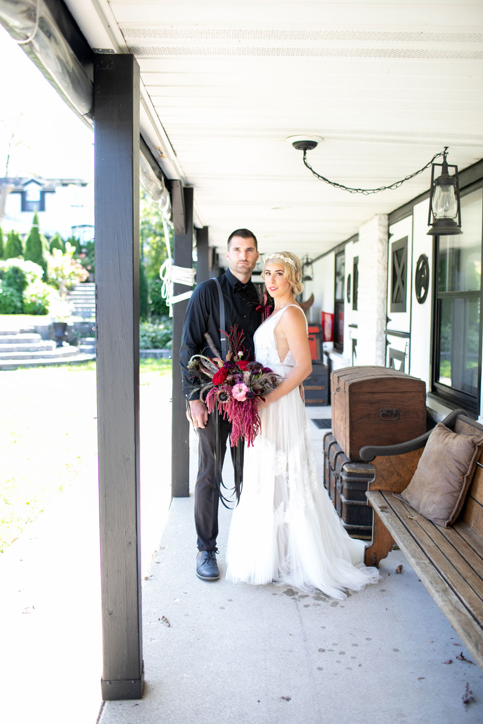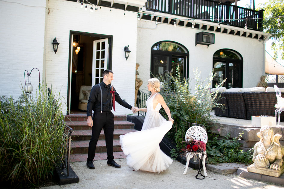 Photographer Elyse Bullard couldn't wait for the Halloween season to begin, so she got in touch with a few local vendors and began pulling together a haunted styled shoot. The history at Maxwell Mansion inspired a 1920's themed shoot for the beginning of the day, with the bride in a lacy sleeveless gown and carrying a rich red and maroon bouquet. As the sun went down, things began to change. The couple transformed into skeletal beings in black attire and toasted one another with blood-red goblets. Gold, maroon and deep purple accents glittered from the table where a black cake dripped with fruit. At the end of the evening, a vintage motorcoach arrived to whisk the couple back to the underworld.